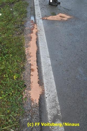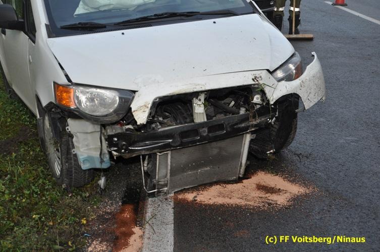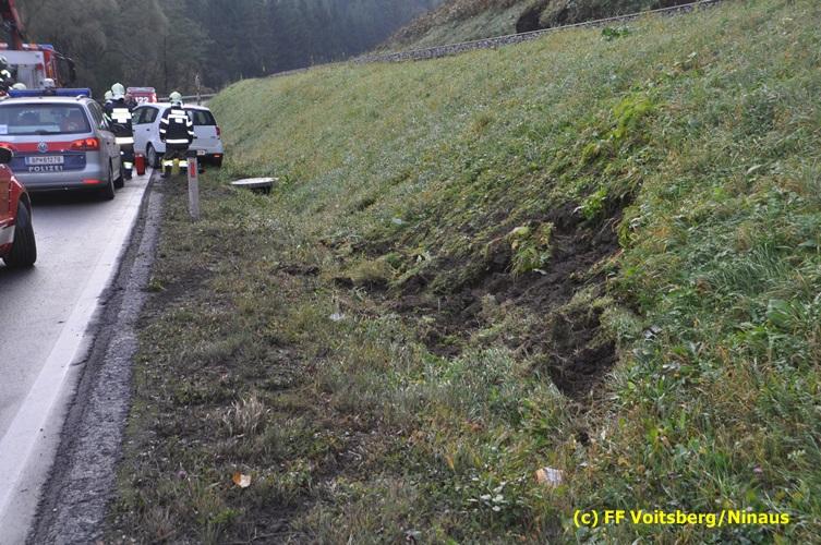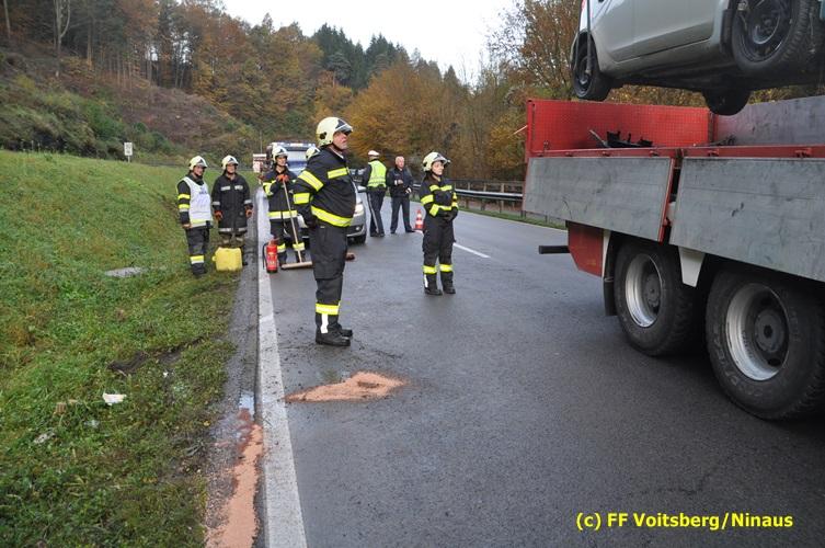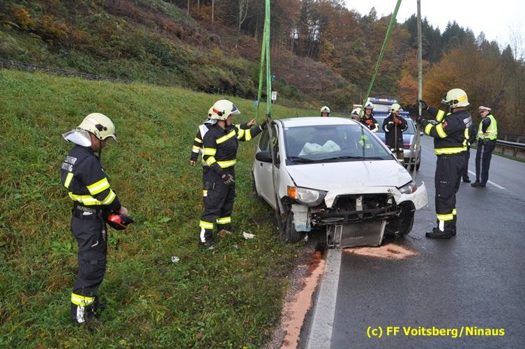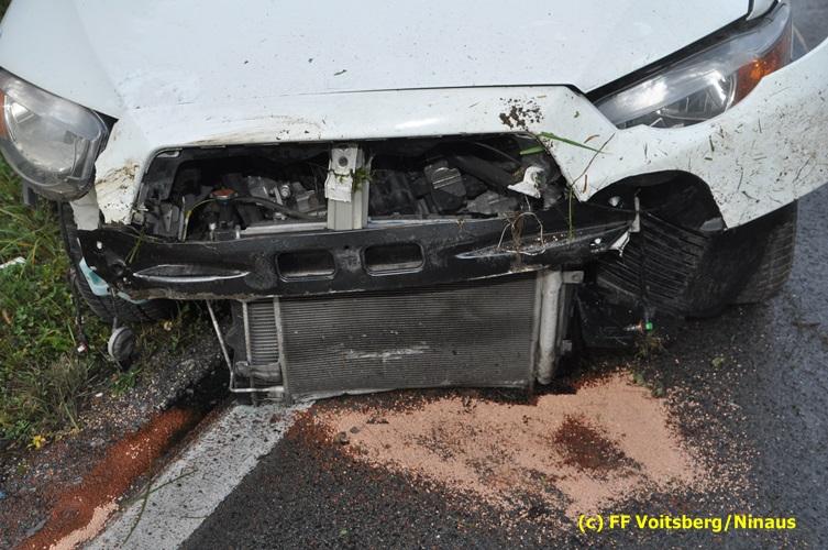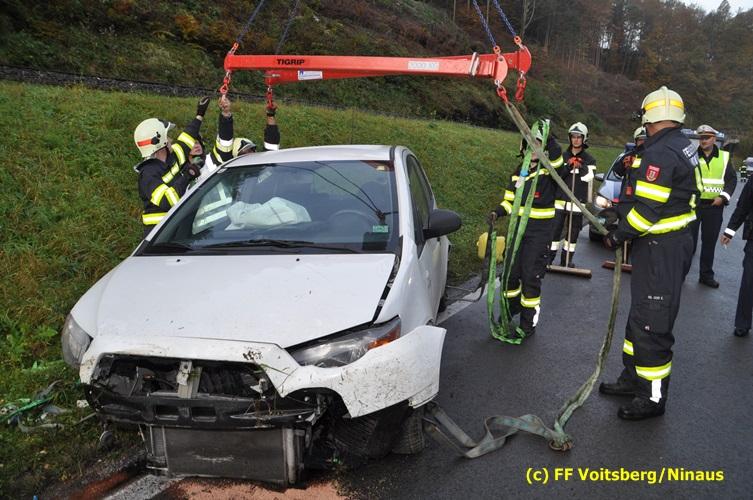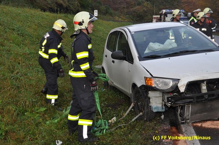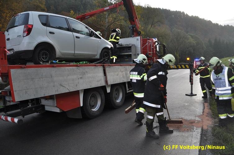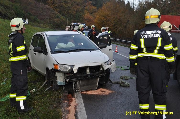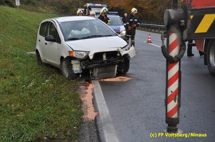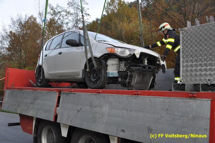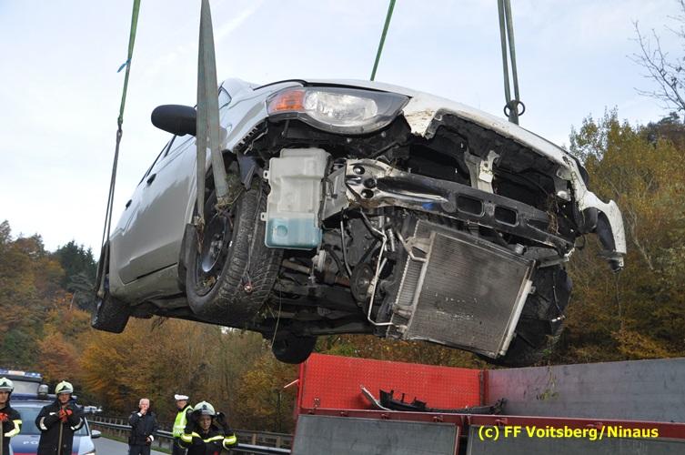VOITSBERG, am 25.10.2016 Ein PKW geriet aus unbekannten Gründen in Fahrtrichtung Graz in den Kremser Reihen rechts von der Straße ab, fuhr auf die Böschung zum Bahndamm, schleuderte zurück auf die Bundesstraße und kam schwer beschädigt dort zu stehen. Durch die Wucht des Aufpralls wurde der Motorblock aus der Verankerung gerissen. Die FF Krems baute einen Brandschutz auf, band ausgeflossene Betriebsmittel und sicherte die Unfallstelle ab. Die Bergung erfolgte mit dem WLF-Kran.