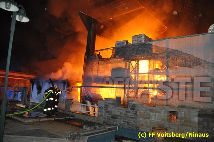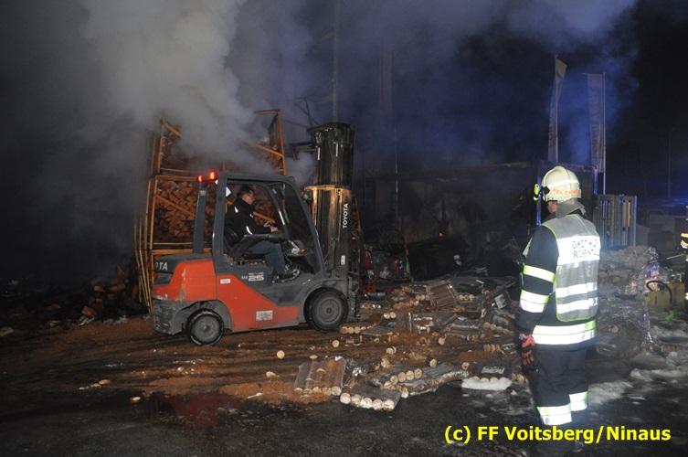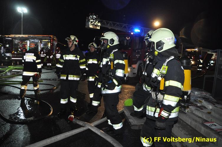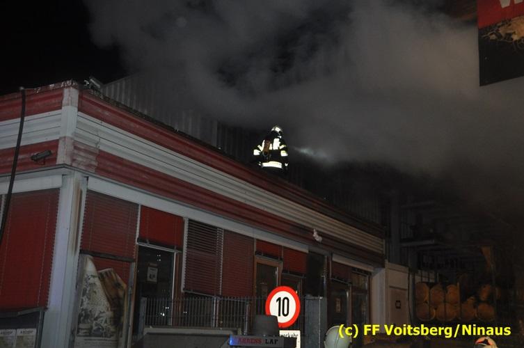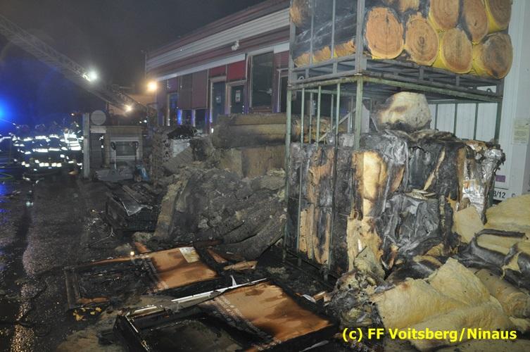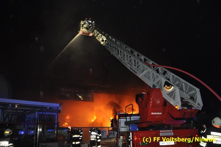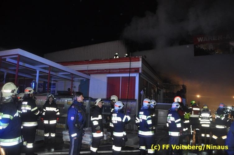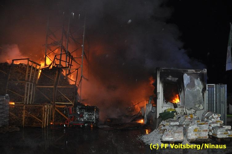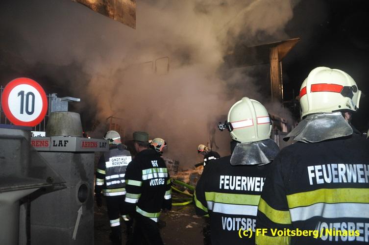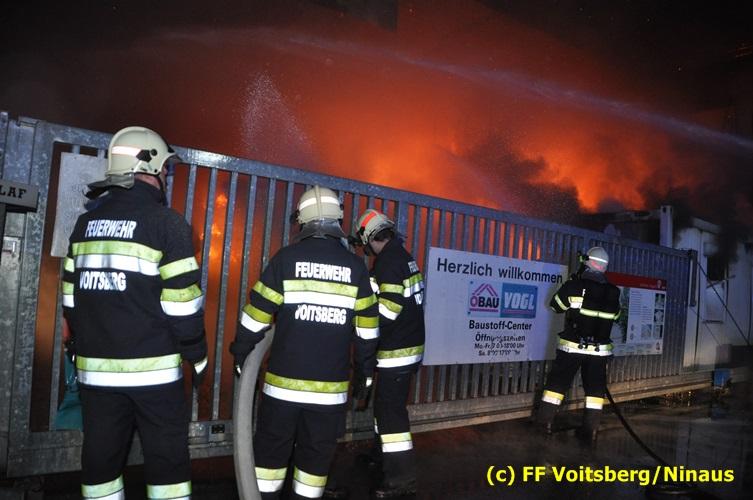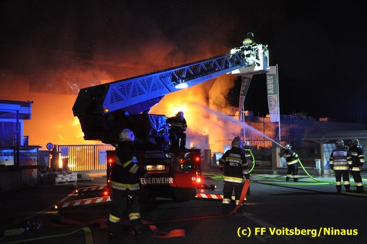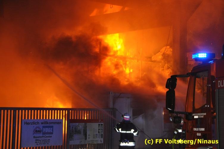 VOITSBERG, am 05.11.2016 Im Freigelände des Baustofflagers der Firma Hagebau Vogl in Rosental brach aus unbekannter Ursache ein Brand aus. Die Alarmierung der zuständigen Feuerwehr Rosental erfolgte nach dem Auslösen der Brandmeldeanlage durch die LLZ n Lebring. Bereits bei der Anfahrt wurde seitens des Einsatzleiters Großalarm ausgelöst. Ein Bürocontainer sowie ca. 200 m Regale standen in Vollbrand. Es drohte auch ein Übergriff auf das angrenzende Geschäft mit Büros, was aber durch den gezielten Einsatz der Feuerwehren verhindert werden konnte. Der Brand konnte nach einer halben Stunde unter Kontrolle gebracht werden. Durch den raschen Einsatz mit Tanklöschfahrzeugen und der Drehleiter konnte Ärgeres verhindert werden. Das Löschwasser musste aus einer Entfernung von ca. 300 m aus einem Teich gepumpt werden.