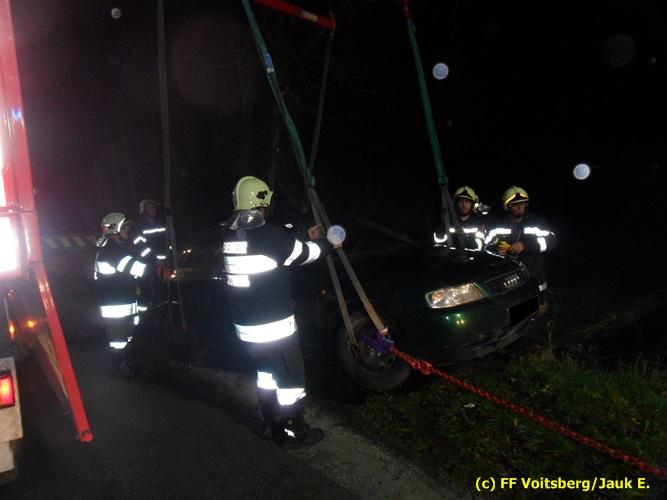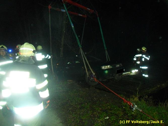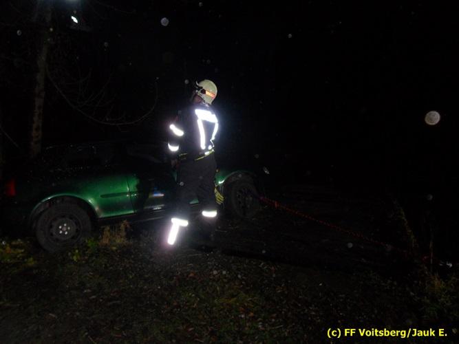 VOITSBERG, am 23.11.2016 Ein PKW kam aus ungeklärter Ursache von der Gemeindestrasse ab und landete quer auf einer Holzbrücke und drohte abzustürzen. Aufgabe der Feuerwehren Rosental und Voitsberg war es, den PKW, der mit einer Achse in der Luft hing, von der Brücke zu bergen, was mit dem WLF-K Voitsberg durchgeführt wurde. Der Lenker konnte mit seinem PKW anschließend die Fahrt wieder fortsetzen.