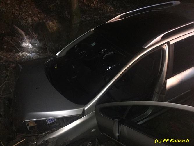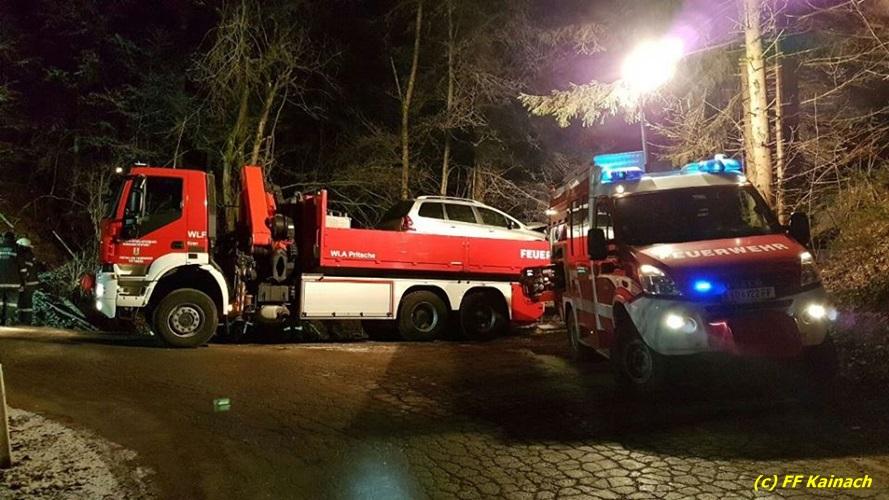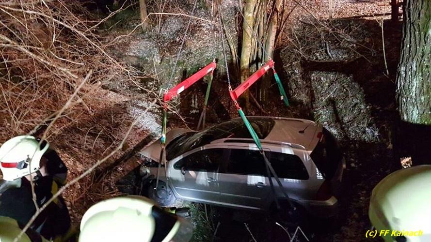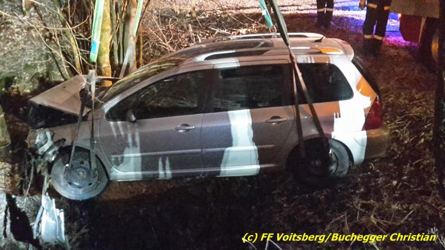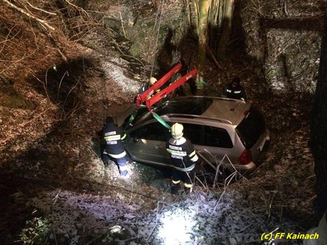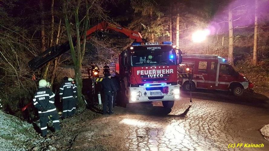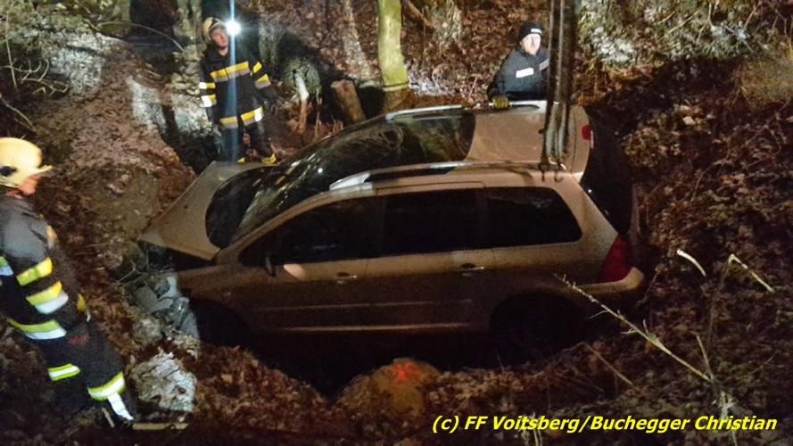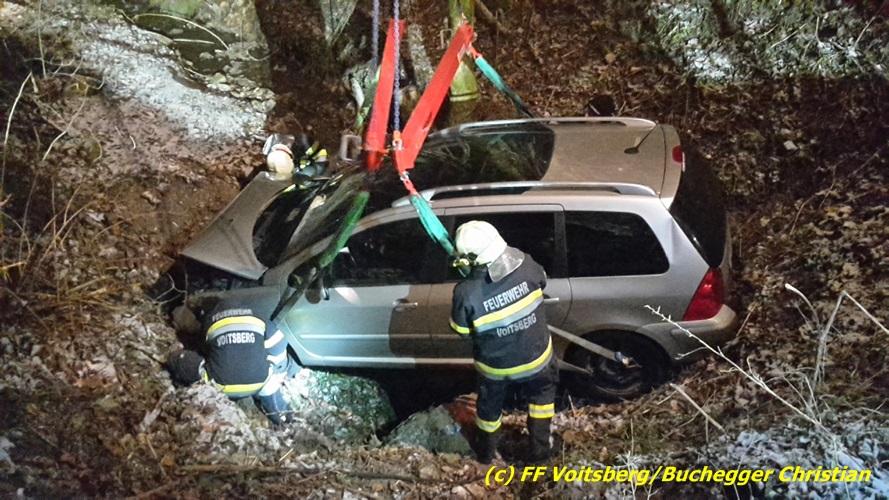 VOITSBERG, am 22.12.2016 Ein PKW kam in einer scharfen Kurve von der Fahrbahn ab und stürzte ca. 3 m tief in den Straßengraben. Der Lenker wurde mit Verletzungen unbestimmten Grades ins LKH Voitsberg eingeliefert. Am Fahrzeug entstand Totalschaden. Die Bergung erfolgte mit dem WLF-Kran der FF Voitsberg in Zusammenarbeit mit der FF Kainach.