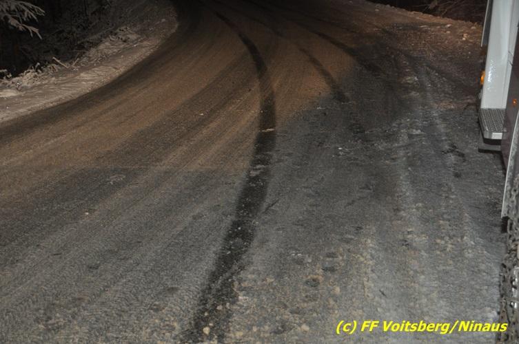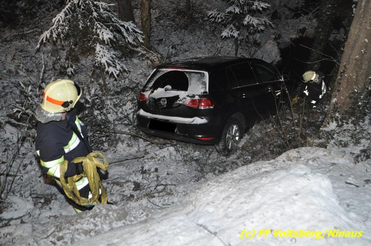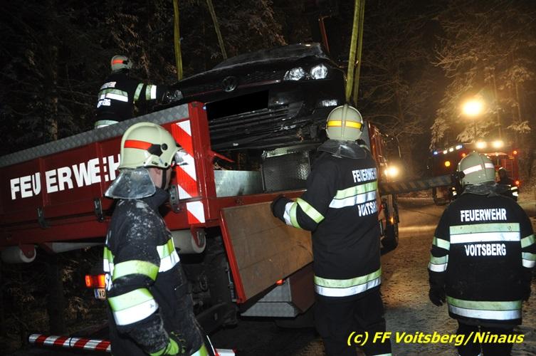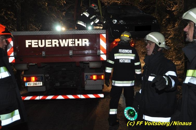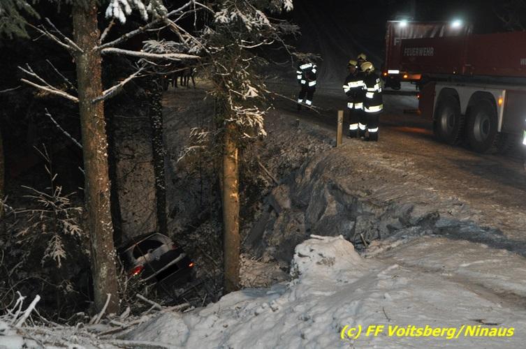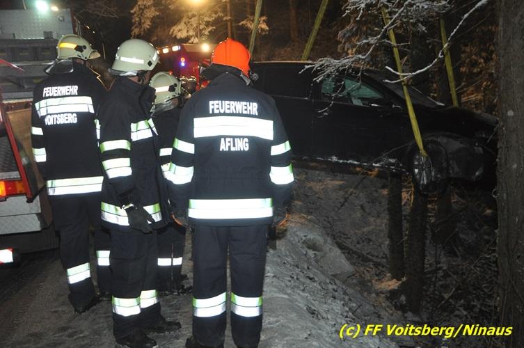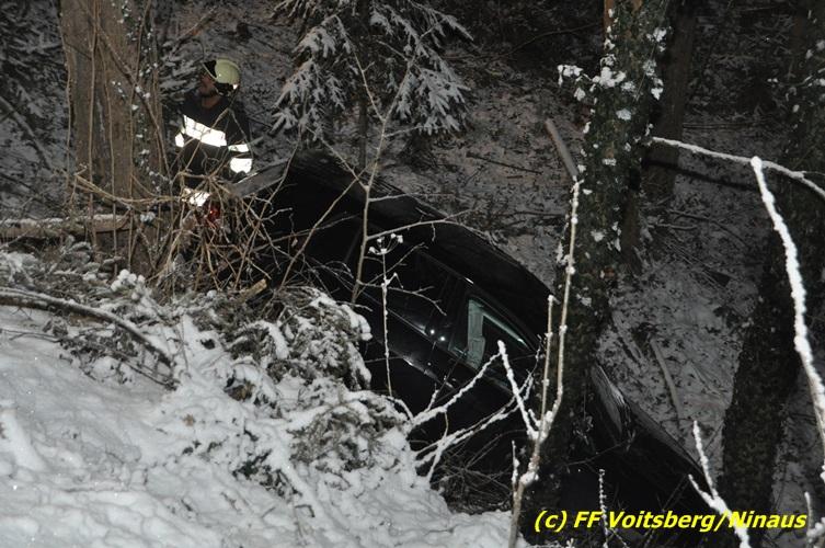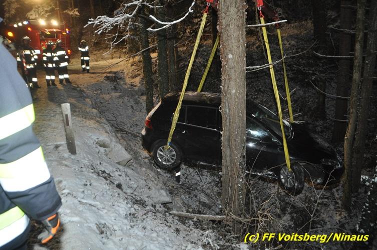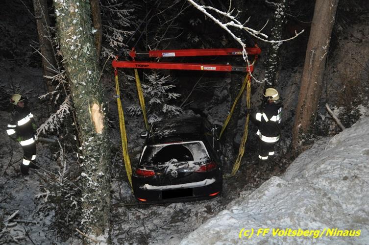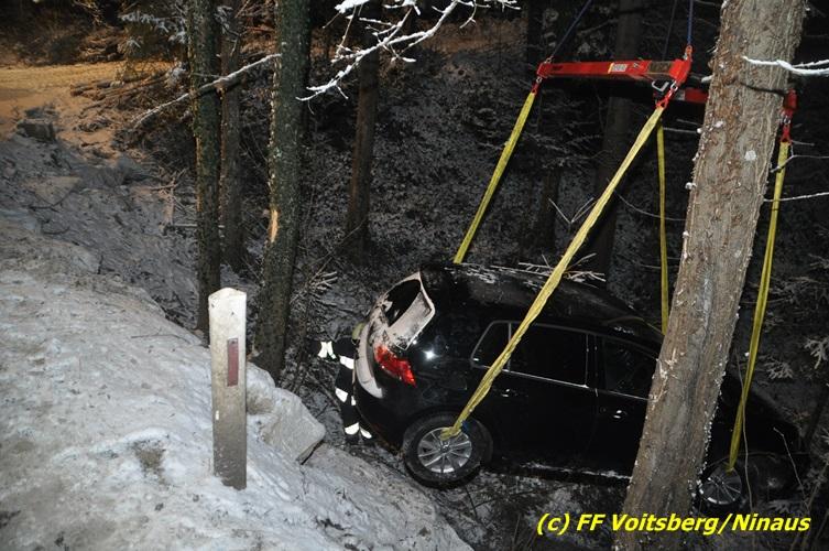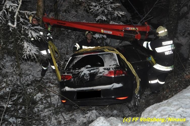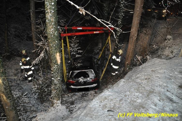 VOITSBERG, am 30.12.2016 Ein Fahrzeuglenkerin kam auf der schneeglatten Fahrbahn mit ihrem PKW von der Straße ab, stürzte ca. 10 m über eine Böschung und kam dort auf den Rädern zu stehen. Sie hatte Glück im Unglück, dass sie knapp neben Bäumen vorbeischlitterte und unverletzt blieb. Die Bergung wurde mit dem WLF-Kran der FF Voitsberg durchgeführt. Die einsatzleitende FF Afling sicherte die Unfallstelle ab.