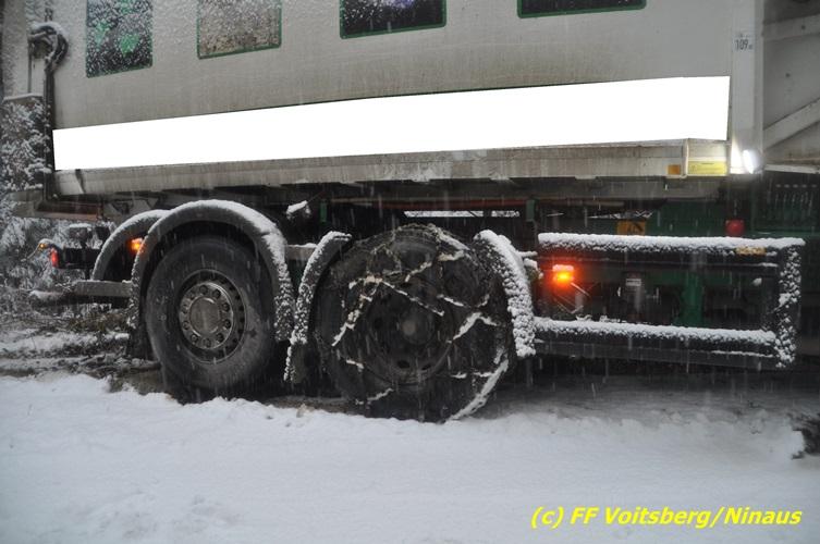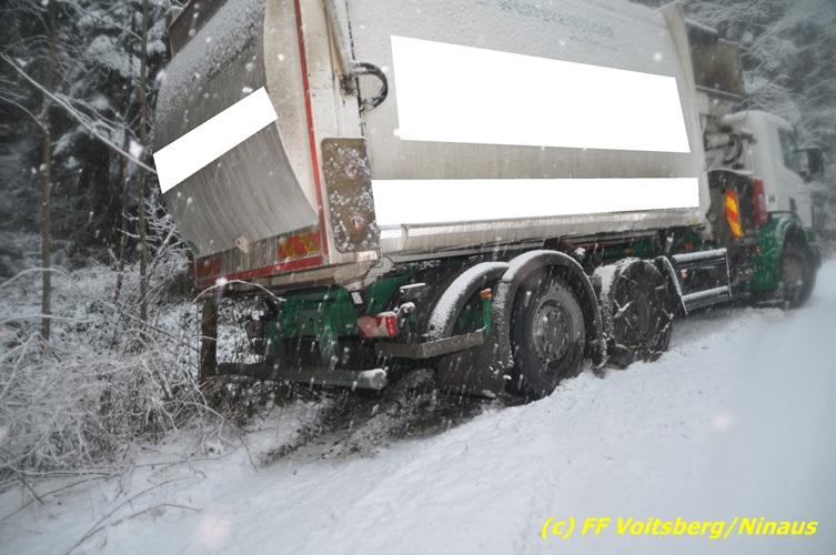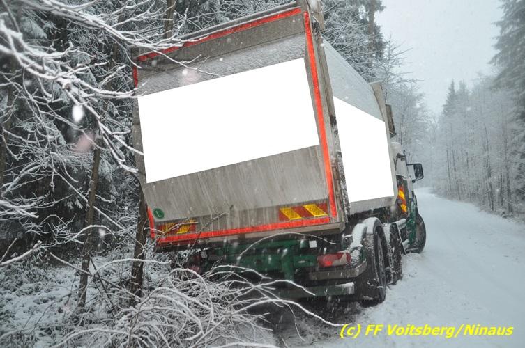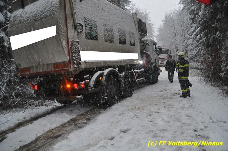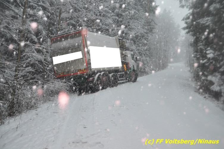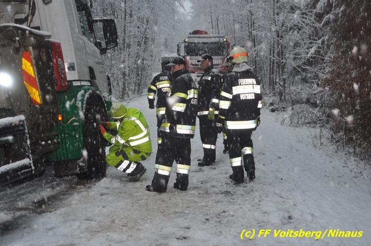 VOITSBERG, am 13.01.2017 Ein LKW kam auf der schneeglatten Fahrbahn ins Rutschen und geriet in einen Graben. Die Stadtfeuerwehr Voitsberg barg den 25 to schweren LKW mittels Seilwinde des WLF-Kran. Das Fahrzeug blieb unbeschädigt und konnte die Fahrt auf eigener Achse fortsetzen. Insgesamt war die FF Voitsberg mit 11 Einsatzkräften und 2 Fahrzeugen im Einsatz.
