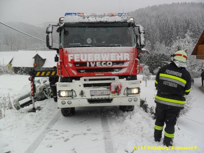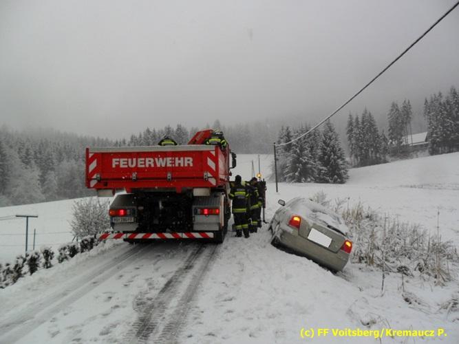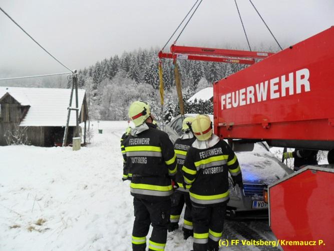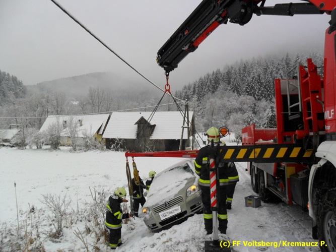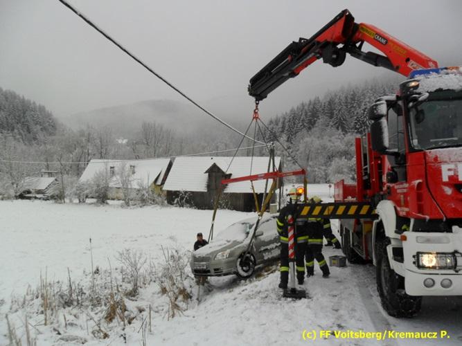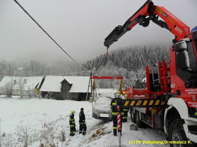 VOITSBERG, am 13.01.2017 Anforderung durch die FF Rosental - Bergung eines PKW mittels WLF-Kran aus einem Bachbett, nachdem dieser von der schneeglatten Fahrbahn abkam.