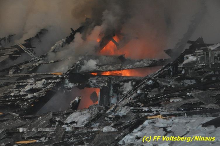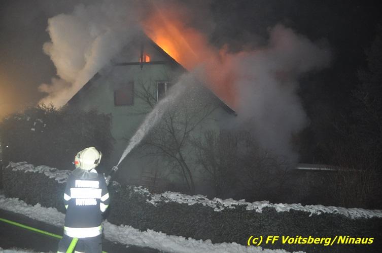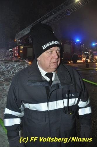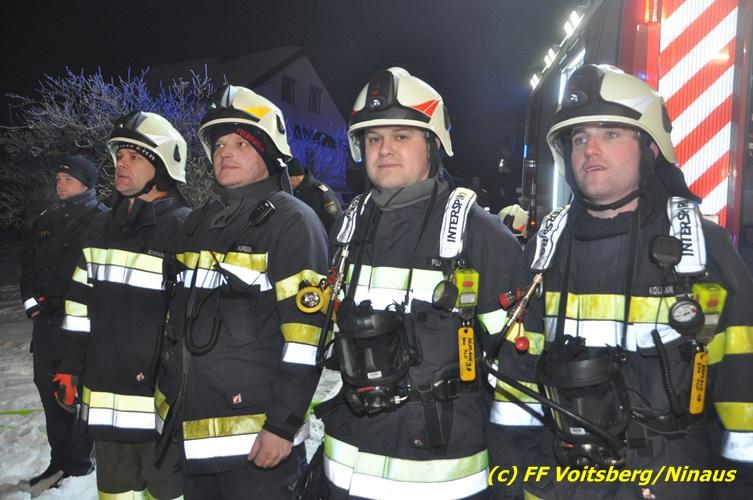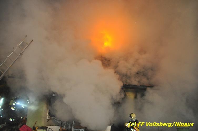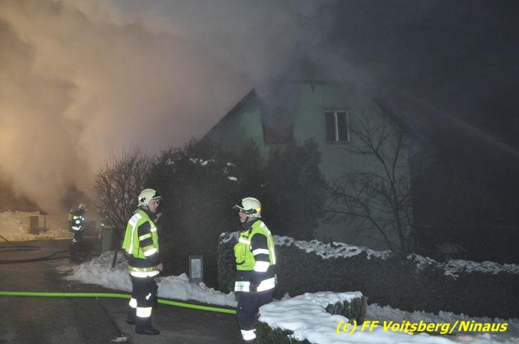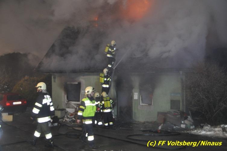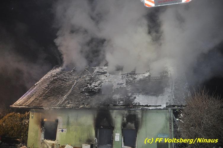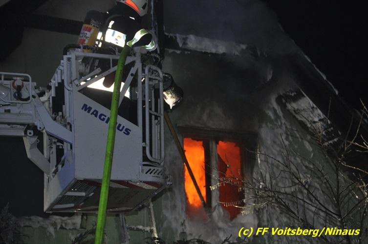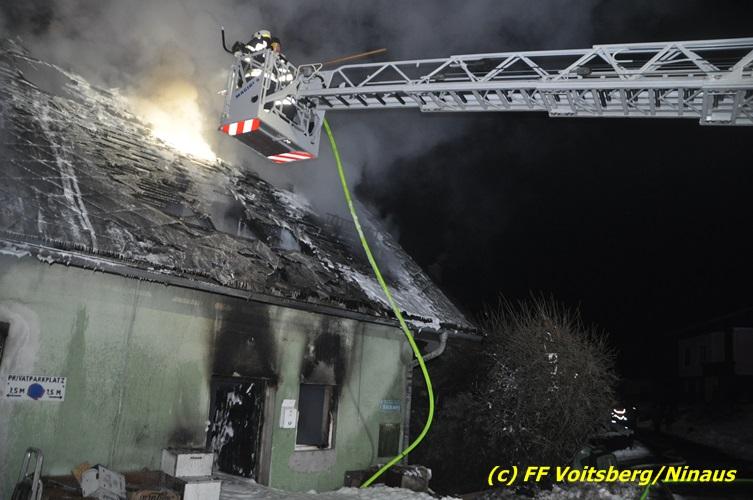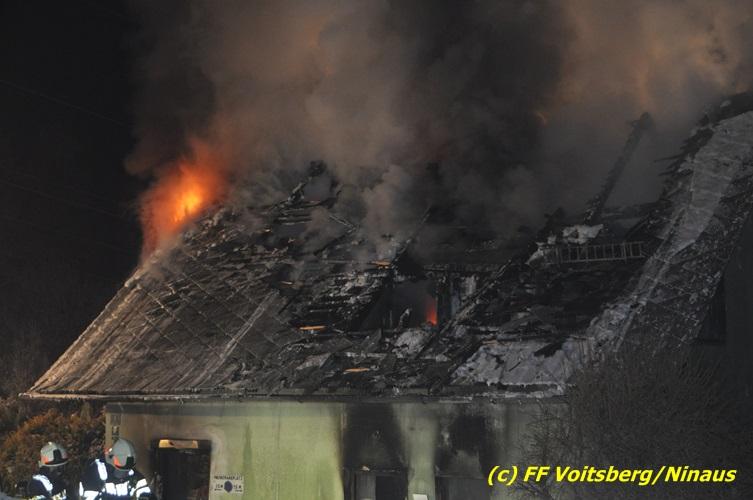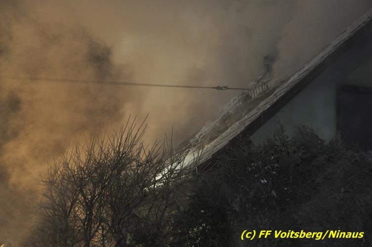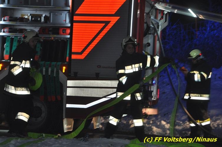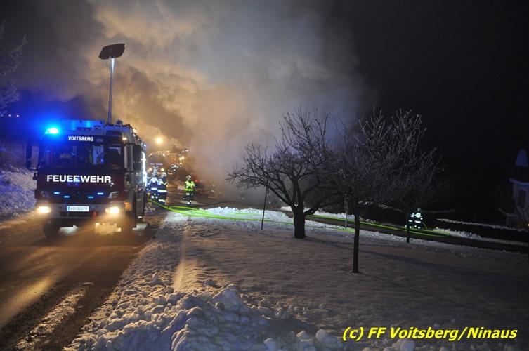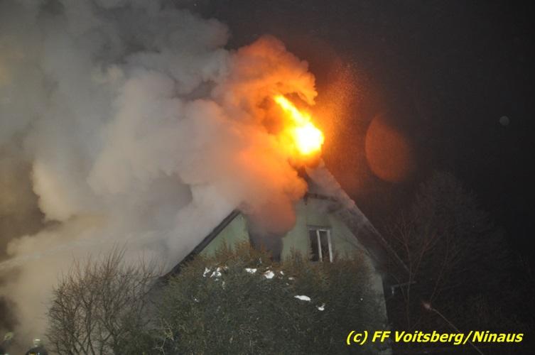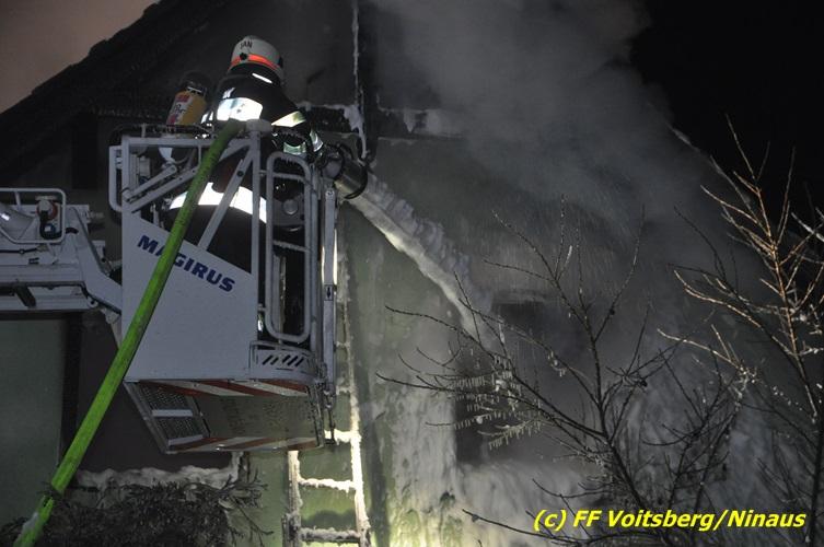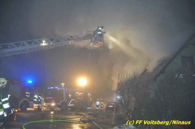 VOITSBERG, am 29.01.2017 Am Sonntag, 29. Jänner 2017 um 00:25 Uhr wurden die Feuerwehren Voitsberg, Krems, Bärnbach, Köflach und Rosental zu einem Wohnhausbrand in Voitsberg alarmiert. Bei Eintreffen am Einsatzort war das Wohnhaus bereits in Vollbrand. Unter schwerem Atemschutz wurde zuerst von außen mit 3 HD-Rohren eine Brandbekämpfung durchgeführt, ehe der Weg für einen Innenangriff frei wurde. Die Mannschaft stellte kurz nach Eindringen in das Haus fest, dass dort sehr viel Material gelagert war. Da der Brandangriff aus diesem Grund nur oberflächlich durchgeführt werden konnte, loderten immer wieder Flammen auf, sodass der Innenangriff abgebrochen werden musste. Um eine effiziente Brandbekämpfung durchführen zu können, musste man über Leiterwege und über die Drehleiter Köflach die Außenangriffe mittels Schaummittel fortsetzen, was aber nur zum Teil gelang, da aufgrund des gelagerten Materials ein Herankommen an die Brandherde nicht überall möglich war. Weiter wurde versucht, mit einer Seilwinde den Dachstuhl abzutragen, was aber aufgrund des angebrannten Holzes zu wenig Erfolg führte. Schlussendlich wurde mittels des WLF Voitsberg und Holzgreifer der Dachstuhl zum Teil abgetragen, um besser zu den Brandherden heranzukommen. Erschwerend wirkte sich die klirrende Kälte aus. Durch das Löschwasser war die gesamte Umgebung derart vereist, dass man Streusalz aufbringen musste. Auch die Leitern waren sehr vereist, was zu großer Vorsicht für die Mannschaft bedeutete. Glück im Unglück hatte die Besitzerin des Hauses. Sie entdeckte den Brand, nachdem sie nachhause kam. Sie versuchte diesen noch mit Schnee zu löschen, was klarerweise nicht gelang. Das Haus wird mit hoher Wahrscheinlichkeit nicht mehr bewohnbar. An der Brandbekämpfung beteiligten sich 5 Feuerwehren mit 16 Fahrzeugen und 77 Einsatzkräften. Ein Kamerad verletzte sich bei den Löscharbeiten an der Hand. Weiter waren das Rote Kreuz Voitsberg mit einem RTW und zwei Helfern sowie die Polizei mit einer Streife anwesend. Die Brandursache und die Schadenshöhe sind noch nicht bekannt.