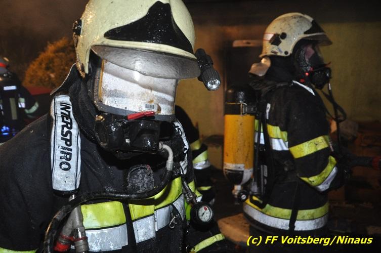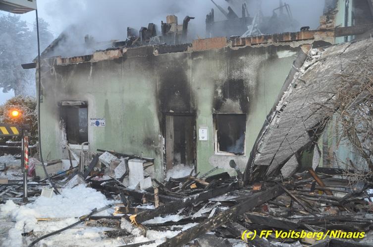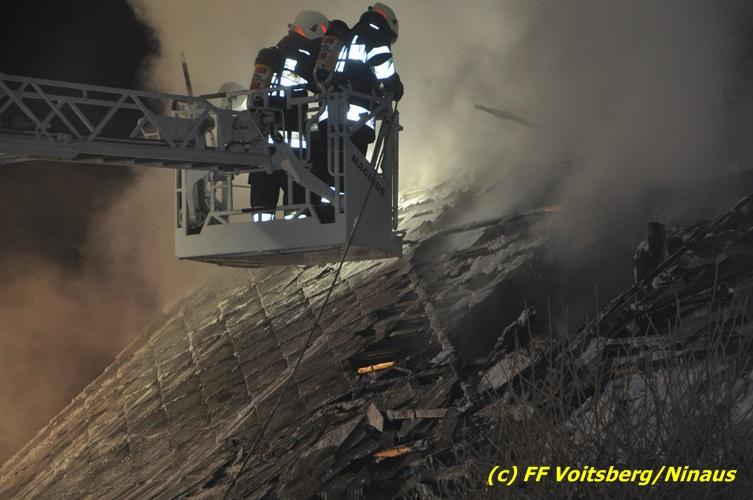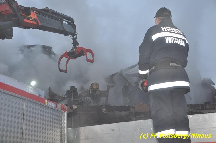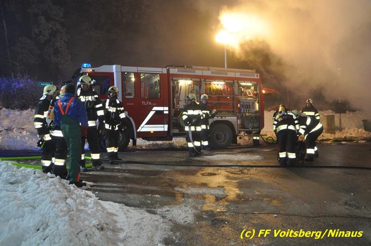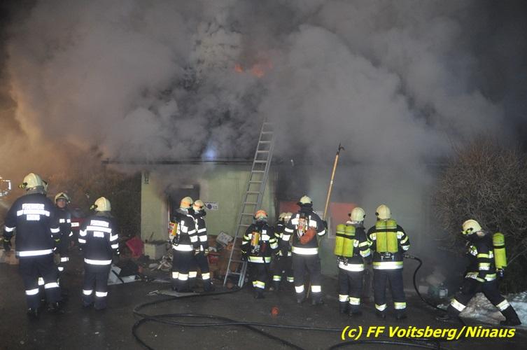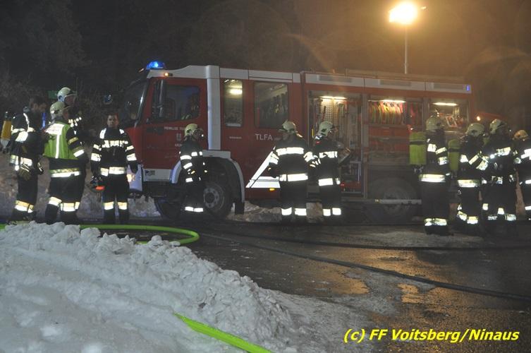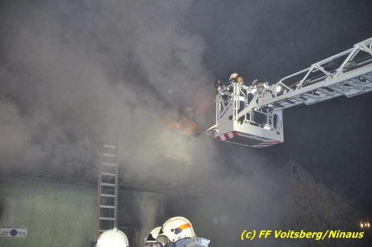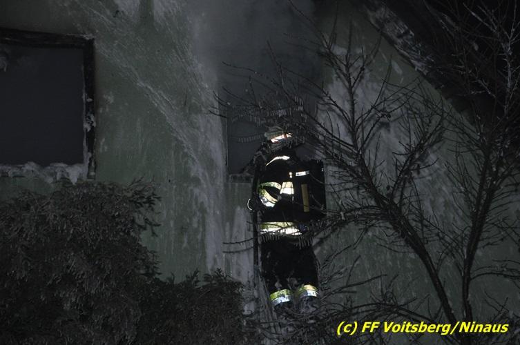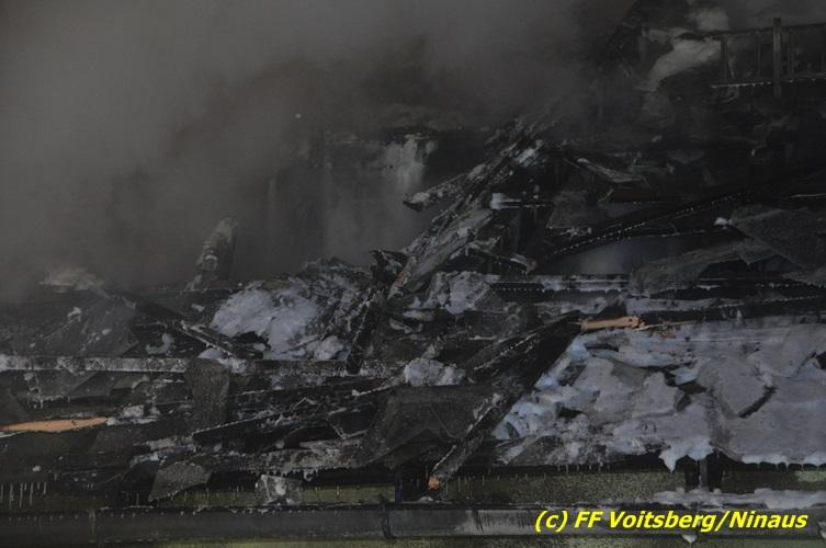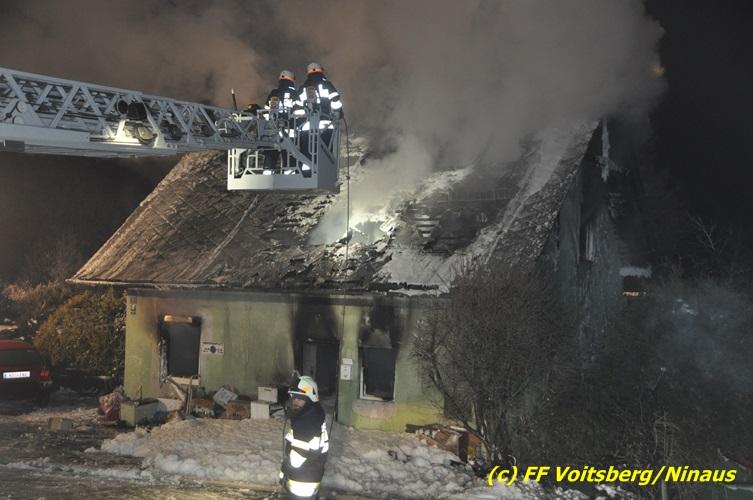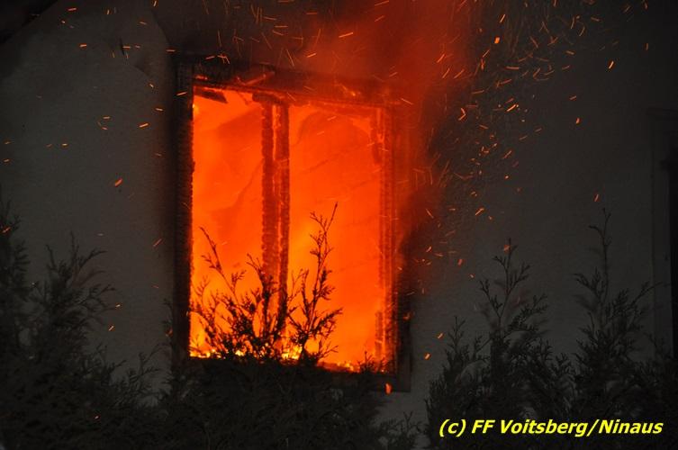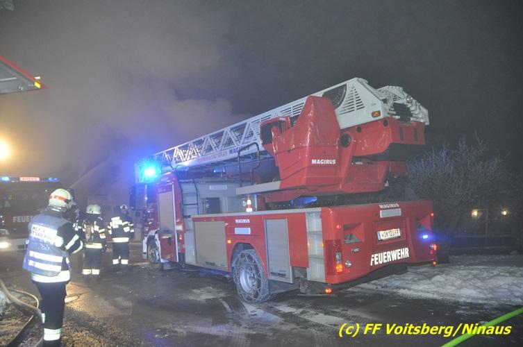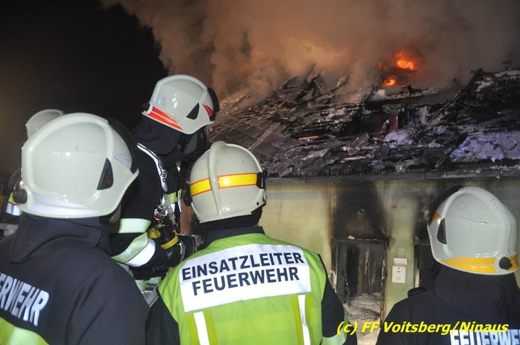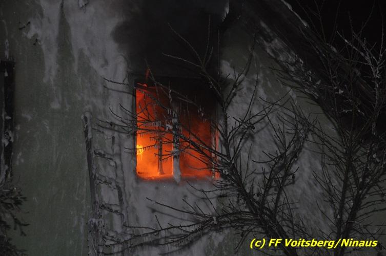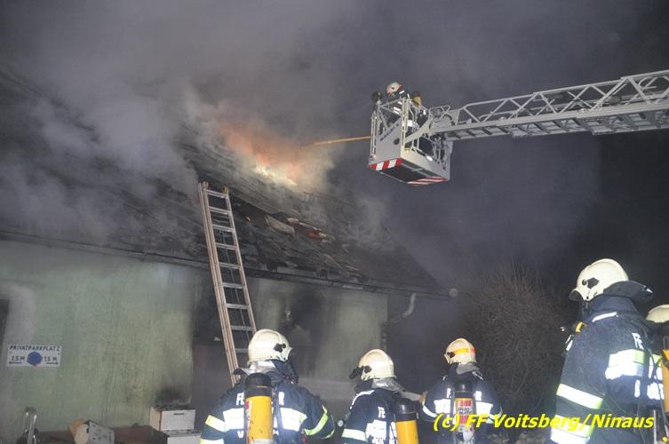 VOITSBERG, am 29.01.2017 Am Sonntag, 29. Jänner 2017 um 00:25 Uhr wurden die Feuerwehren Voitsberg, Krems, Bärnbach, Köflach und Rosental zu einem Wohnhausbrand in Voitsberg alarmiert. Bei Eintreffen am Einsatzort war das Wohnhaus bereits in Vollbrand. Unter schwerem Atemschutz wurde zuerst von außen mit 3 HD-Rohren eine Brandbekämpfung durchgeführt, ehe der Weg für einen Innenangriff frei wurde. Die Mannschaft stellte kurz nach Eindringen in das Haus fest, dass dort sehr viel Material gelagert war. Da der Brandangriff aus diesem Grund nur oberflächlich durchgeführt werden konnte, loderten immer wieder Flammen auf, sodass der Innenangriff abgebrochen werden musste. Um eine effiziente Brandbekämpfung durchführen zu können, musste man über Leiterwege und über die Drehleiter Köflach die Außenangriffe mittels Schaummittel fortsetzen, was aber nur zum Teil gelang, da aufgrund des gelagerten Materials ein Herankommen an die Brandherde nicht überall möglich war. Weiter wurde versucht, mit einer Seilwinde den Dachstuhl abzutragen, was aber aufgrund des angebrannten Holzes zu wenig Erfolg führte. Schlussendlich wurde mittels des WLF Voitsberg und Holzgreifer der Dachstuhl zum Teil abgetragen, um besser zu den Brandherden heranzukommen. Erschwerend wirkte sich die klirrende Kälte aus. Durch das Löschwasser war die gesamte Umgebung derart vereist, dass man Streusalz aufbringen musste. Auch die Leitern waren sehr vereist, was zu großer Vorsicht für die Mannschaft bedeutete. Glück im Unglück hatte die Besitzerin des Hauses. Sie entdeckte den Brand, nachdem sie nachhause kam. Sie versuchte diesen noch mit Schnee zu löschen, was klarerweise nicht gelang. Das Haus wird mit hoher Wahrscheinlichkeit nicht mehr bewohnbar. An der Brandbekämpfung beteiligten sich 5 Feuerwehren mit 16 Fahrzeugen und 77 Einsatzkräften. Ein Kamerad verletzte sich bei den Löscharbeiten an der Hand. Weiter waren das Rote Kreuz Voitsberg mit einem RTW und zwei Helfern sowie die Polizei mit einer Streife anwesend. Die Brandursache und die Schadenshöhe sind noch nicht bekannt.