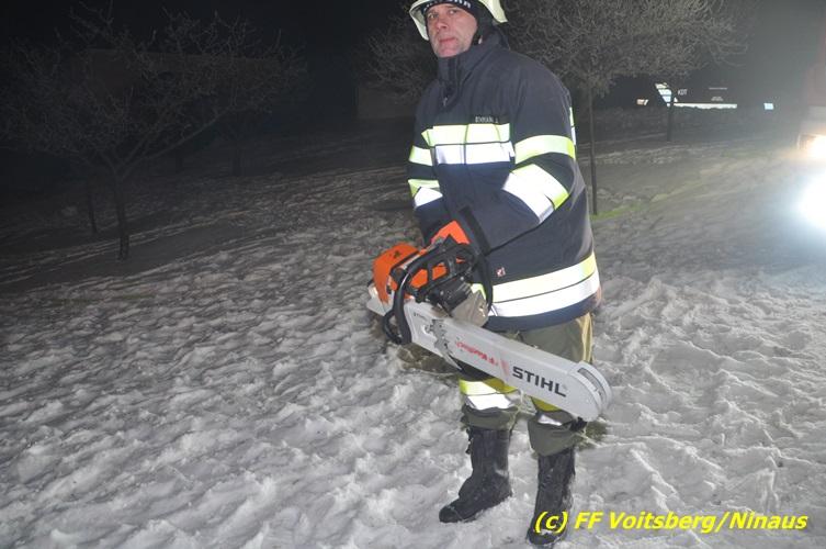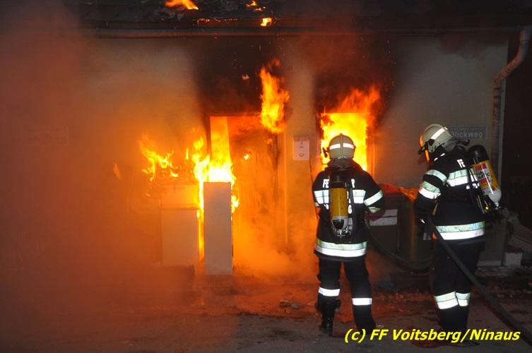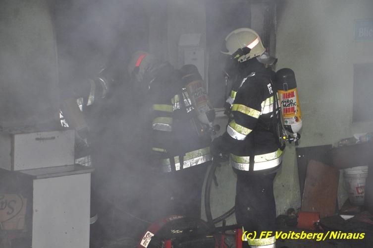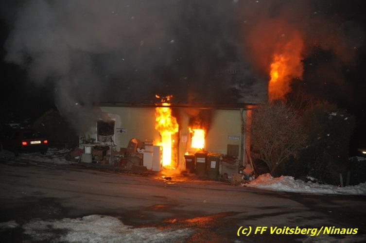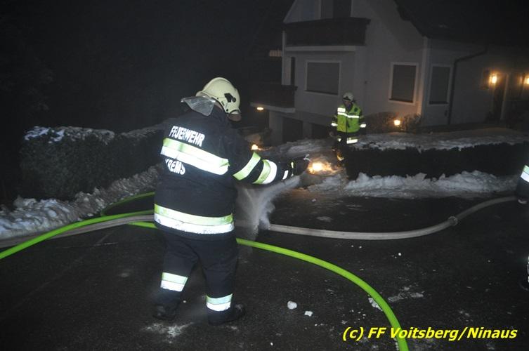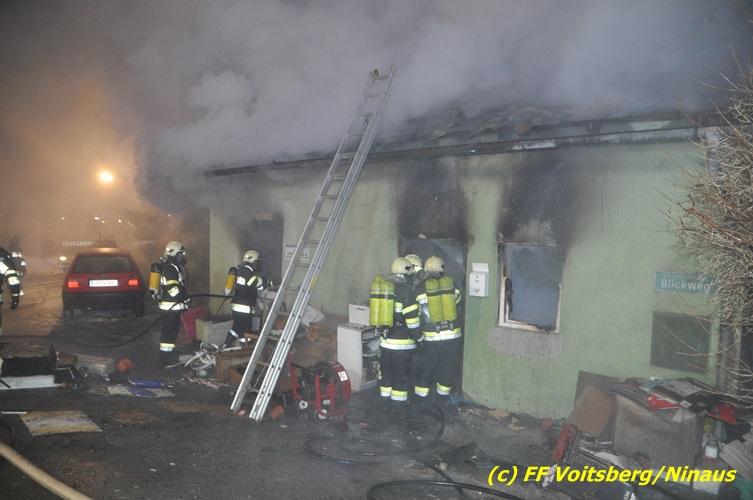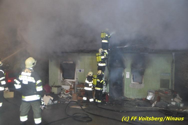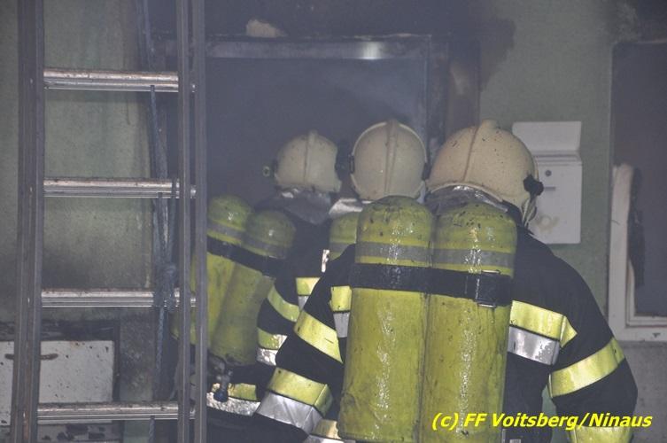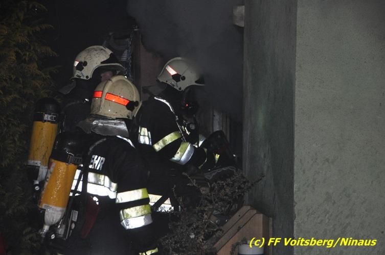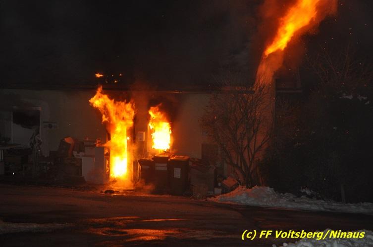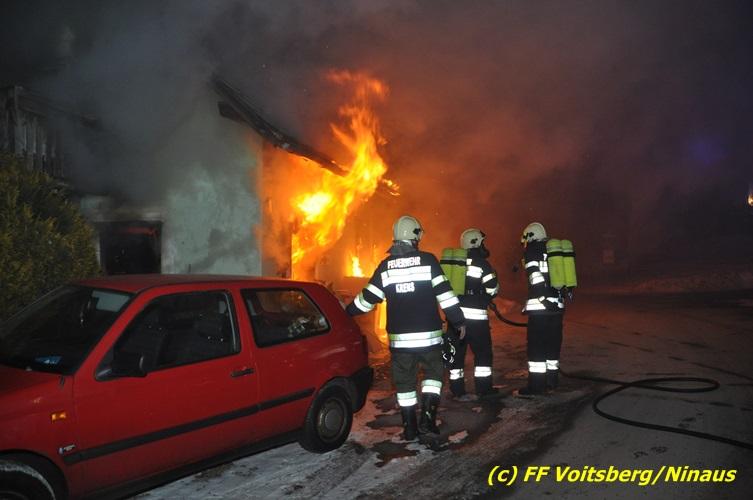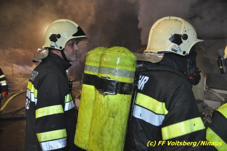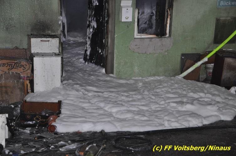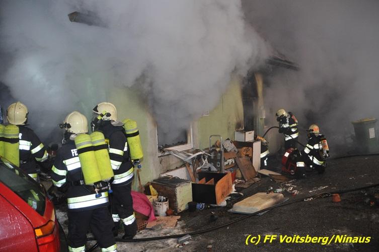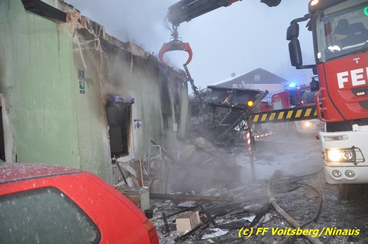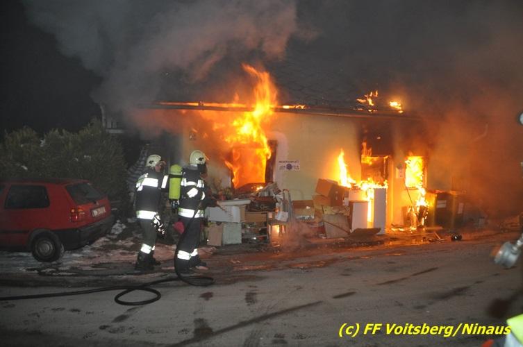 VOITSBERG, am 29.01.2017 Am Sonntag, 29. Jänner 2017 um 00:25 Uhr wurden die Feuerwehren Voitsberg, Krems, Bärnbach, Köflach und Rosental zu einem Wohnhausbrand in Voitsberg alarmiert. Bei Eintreffen am Einsatzort war das Wohnhaus bereits in Vollbrand. Unter schwerem Atemschutz wurde zuerst von außen mit 3 HD-Rohren eine Brandbekämpfung durchgeführt, ehe der Weg für einen Innenangriff frei wurde. Die Mannschaft stellte kurz nach Eindringen in das Haus fest, dass dort sehr viel Material gelagert war. Da der Brandangriff aus diesem Grund nur oberflächlich durchgeführt werden konnte, loderten immer wieder Flammen auf, sodass der Innenangriff abgebrochen werden musste. Um eine effiziente Brandbekämpfung durchführen zu können, musste man über Leiterwege und über die Drehleiter Köflach die Außenangriffe mittels Schaummittel fortsetzen, was aber nur zum Teil gelang, da aufgrund des gelagerten Materials ein Herankommen an die Brandherde nicht überall möglich war. Weiter wurde versucht, mit einer Seilwinde den Dachstuhl abzutragen, was aber aufgrund des angebrannten Holzes zu wenig Erfolg führte. Schlussendlich wurde mittels des WLF Voitsberg und Holzgreifer der Dachstuhl zum Teil abgetragen, um besser zu den Brandherden heranzukommen. Erschwerend wirkte sich die klirrende Kälte aus. Durch das Löschwasser war die gesamte Umgebung derart vereist, dass man Streusalz aufbringen musste. Auch die Leitern waren sehr vereist, was zu großer Vorsicht für die Mannschaft bedeutete. Glück im Unglück hatte die Besitzerin des Hauses. Sie entdeckte den Brand, nachdem sie nachhause kam. Sie versuchte diesen noch mit Schnee zu löschen, was klarerweise nicht gelang. Das Haus wird mit hoher Wahrscheinlichkeit nicht mehr bewohnbar. An der Brandbekämpfung beteiligten sich 5 Feuerwehren mit 16 Fahrzeugen und 77 Einsatzkräften. Ein Kamerad verletzte sich bei den Löscharbeiten an der Hand. Weiter waren das Rote Kreuz Voitsberg mit einem RTW und zwei Helfern sowie die Polizei mit einer Streife anwesend. Die Brandursache und die Schadenshöhe sind noch nicht bekannt.