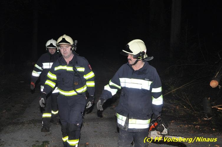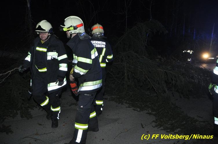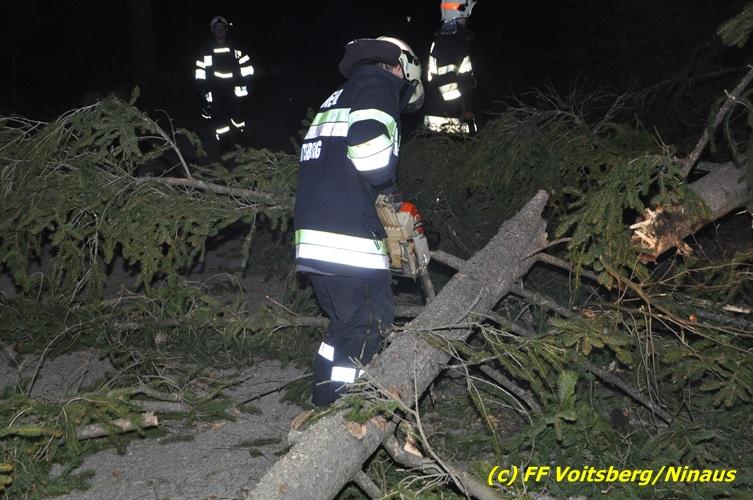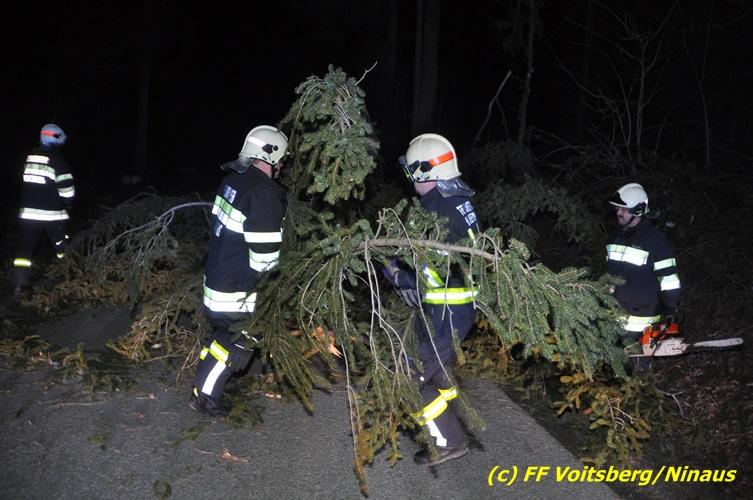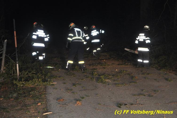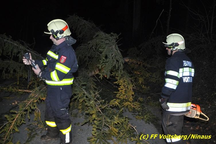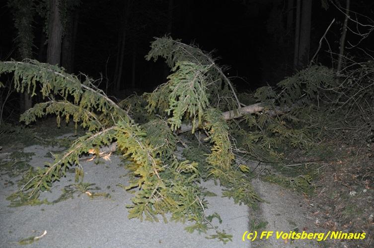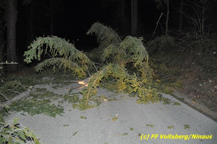 Die Gemeindestrasse war wegen eines umgestürzten Baumes unpassierbar. Entfernen des Baumes unter Einsatz einer Motorsäge.