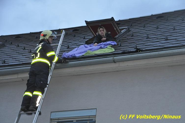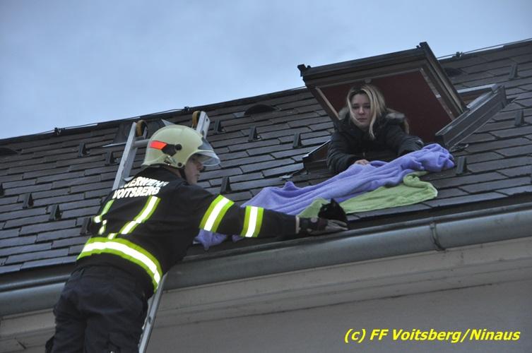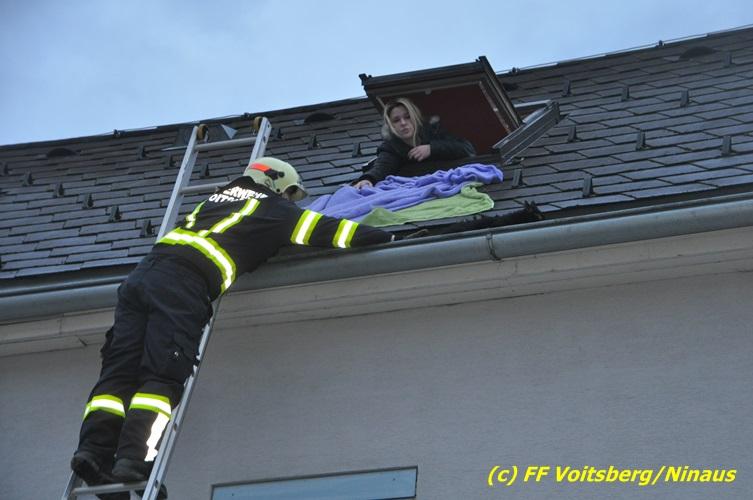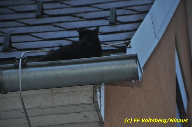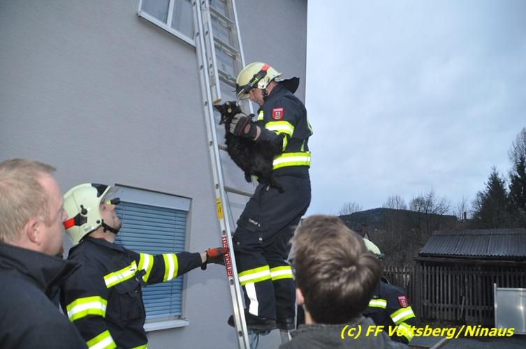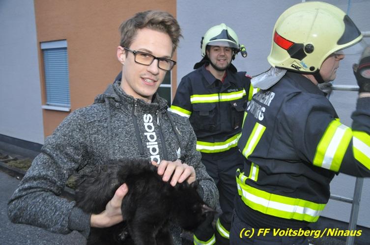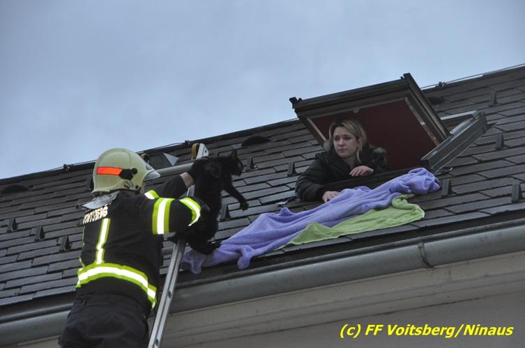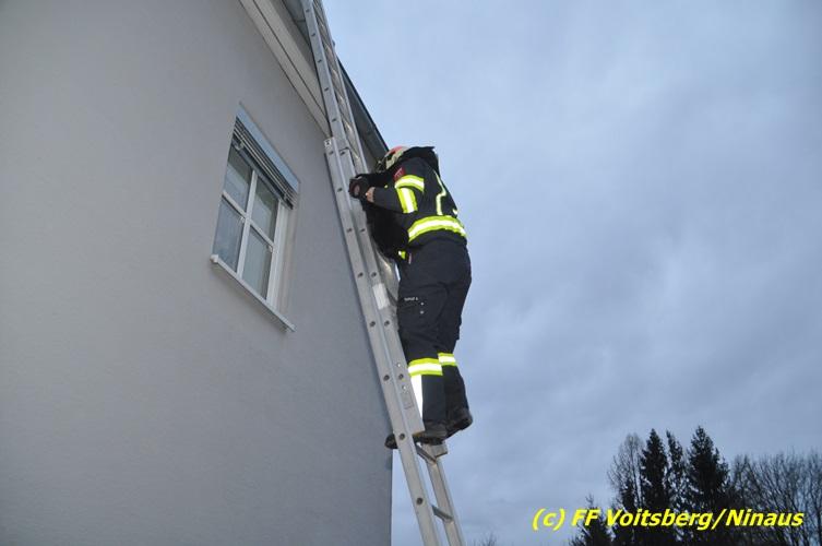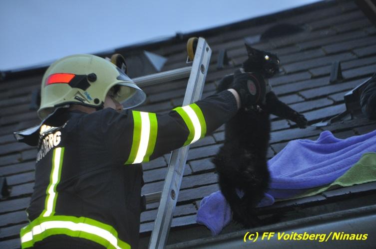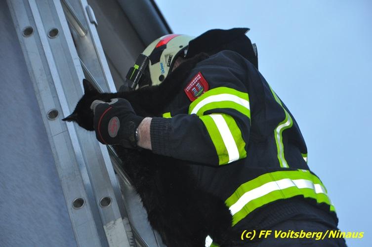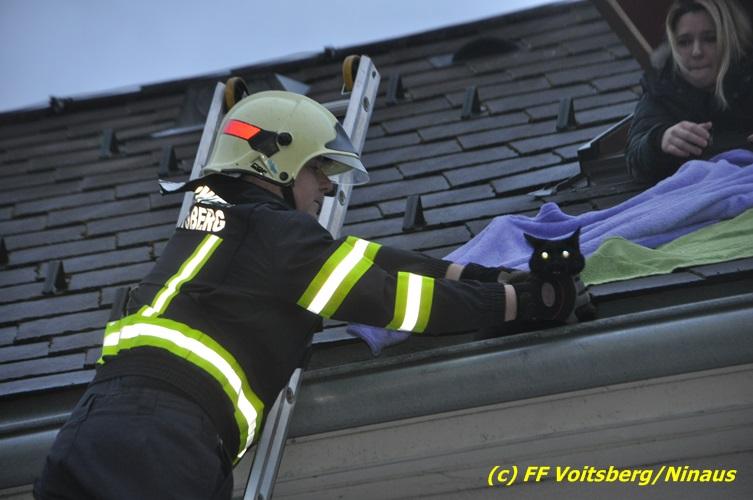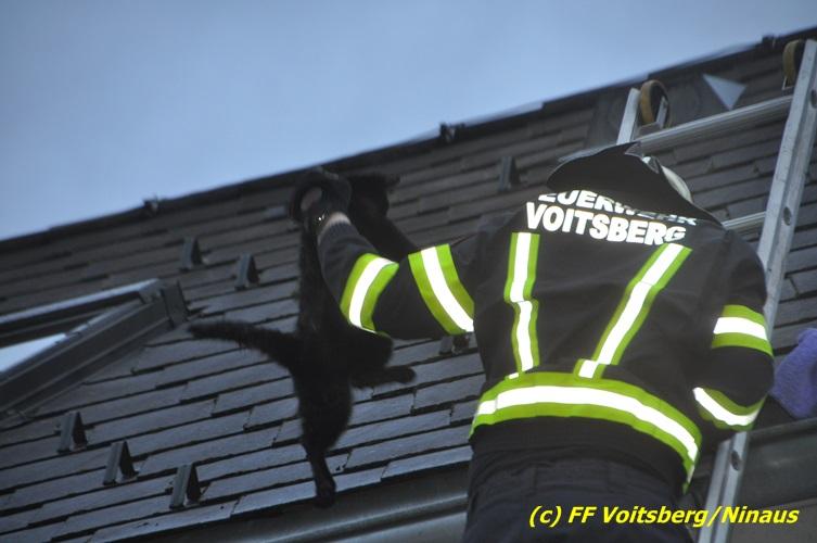 VOITSBERG, am 01.03.2017 Eine Katze geriet aus unerklärlichen Gründen durch ein Fenster einer Dachgaube im dritten Obergeschoss auf das Dach und rutschte in eine Dachrinne. Die Besitzer versuchten mit Tüchern einen Rückweg für das Tier herzustellen, was aber von der Katze nicht angenommen wurde. Über die LLZ Steiermark wurde die FF Voitsberg zur Tierrettung alarmiert. Über eine Schiebeleiter wurde das verängstigte Tier schlussendlich von einem Kameraden eingefangen und zu Boden gebracht. Bei der Rettung wurde der Kamerad von der Katze im Gesicht leicht verletzt. Der überglückliche Mitbesitzer konnte das nervöse, aber unverletzte Tier von der Feuerwehr übernehmen und den Dank an die Einsatzkräfte aussprechen.