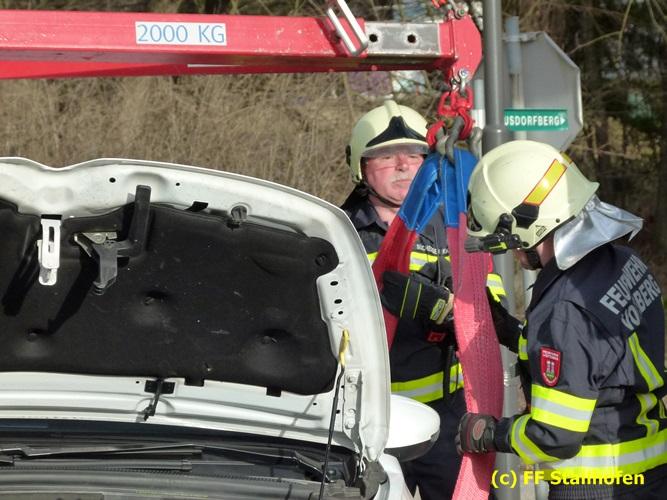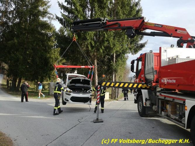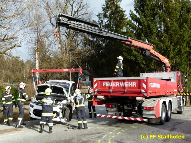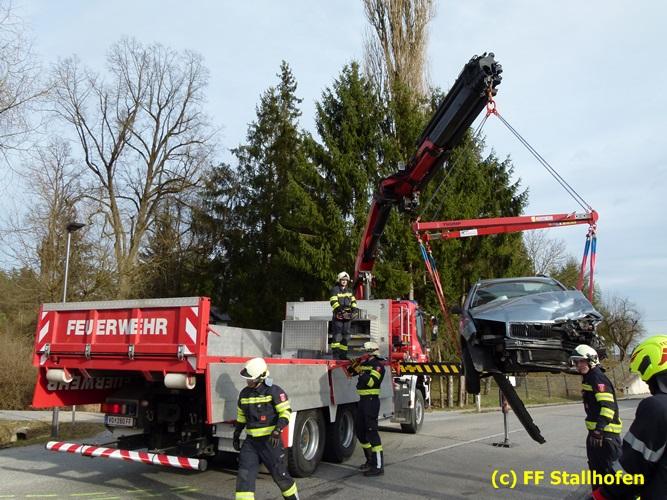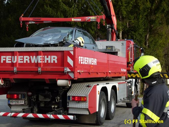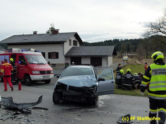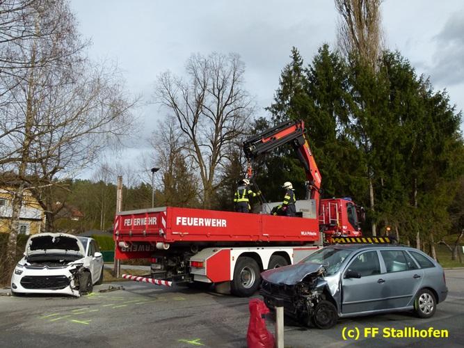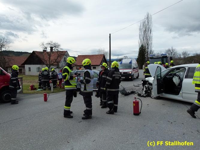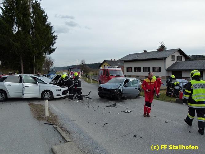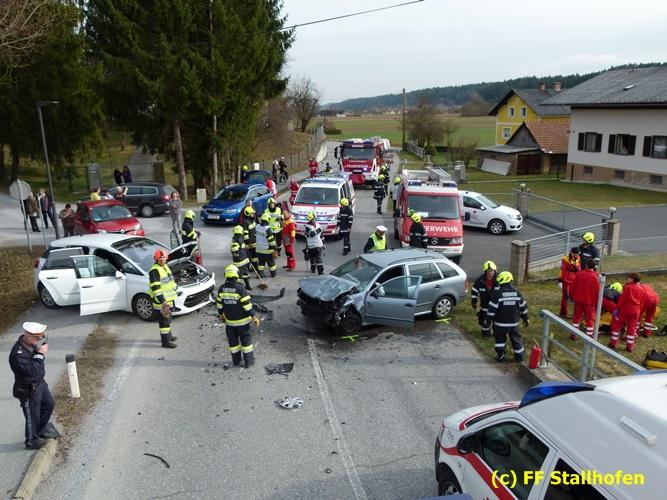 Laut Polizei kam es zu dem Unfall, nachdem ein Auto zum Linksabbiegen angehalten hatte. Der Lenker des nachkommenden Pkw erkannte das zu spät und wich nach links aus um einen Auffahrunfall zu verhindern. Dabei krachte er frontal in das entgegenkommende Auto eines weststeirischen Paares mit ihrem Kleinkind. Die Verletzten wurden von den Feuerwehren Stallhofen und Berndorf aus ihren Fahrzeugen befreit und vom Roten Kreuz sowie dem Rettungshubschrauber C12 ins UKH Graz eingeliefert. Die Bergung der Fahrzeuge wurde mit dem WLF-Kran der FF Voitsberg durchgeführt.