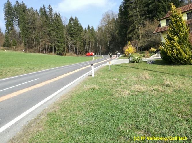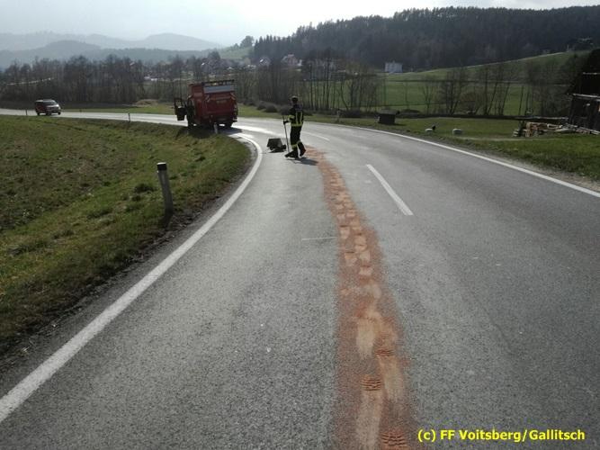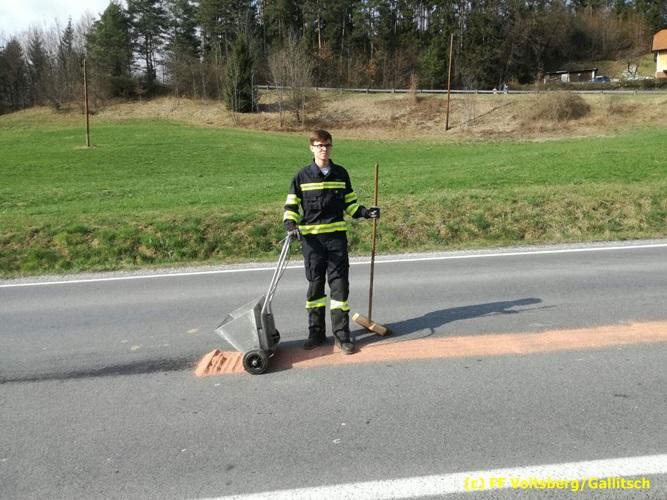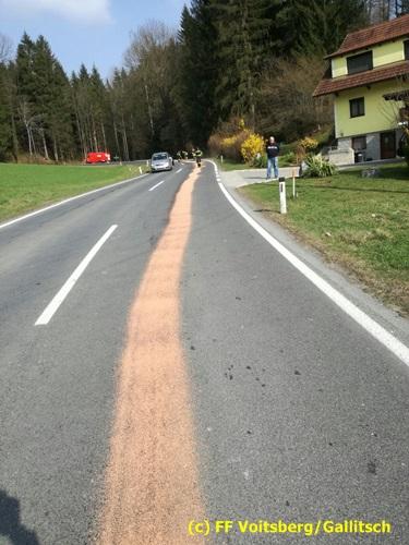 VOITSBERG, am 26.03.2017 Nach Anforderung der FF Krems zur Mithilfe an der Beseitigung einer langen Ölspur auf der Landesstrasse zwischen Krems und der Ruppbauernhöhe wurde Ölbindemittel aufgebracht und entsorgt.