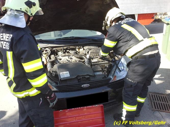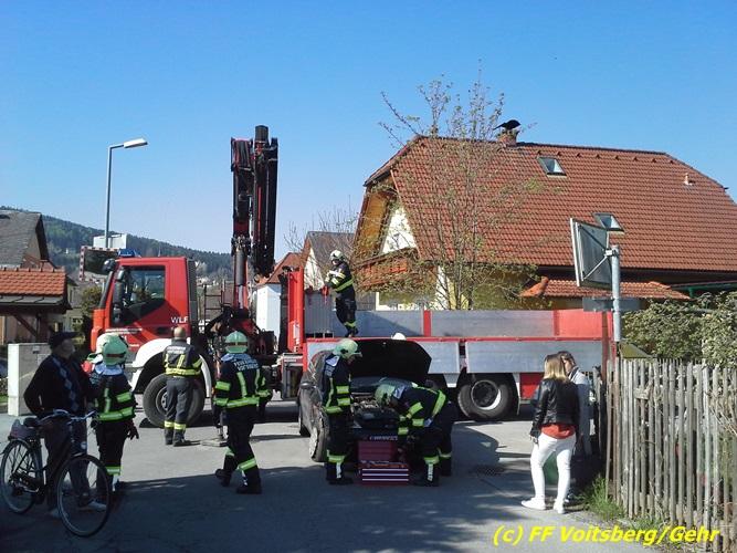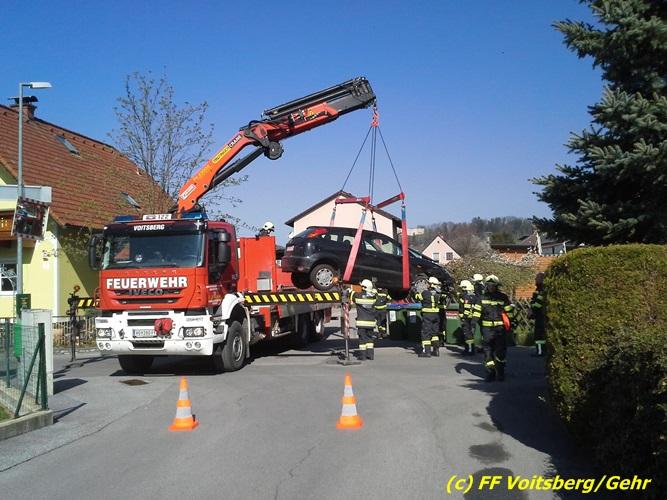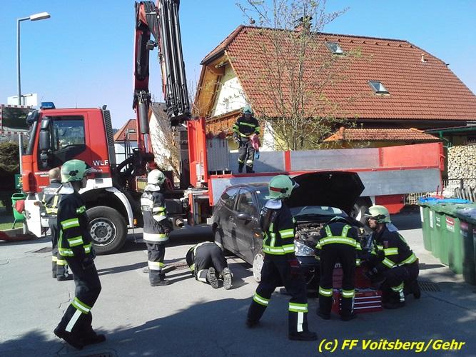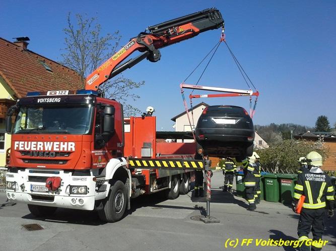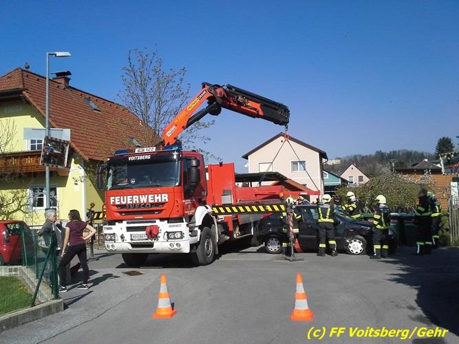 VOITSBERG, am 10.04.2017 Nach einem Zusammenstoß zweier PKW an einer Kreuzung wurde ein Fahrzeug mittels WLF-Kran geborgen und von der Unfallstelle entfernt. Während der Bergungsarbeiten wurde ein Brandschutz aufgebaut.