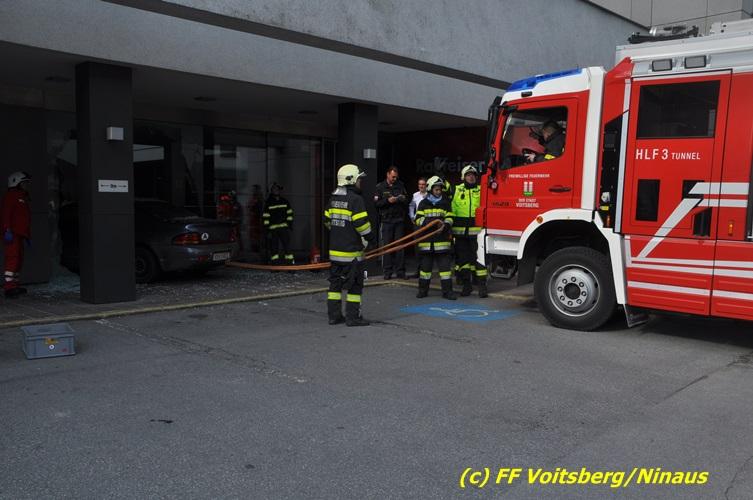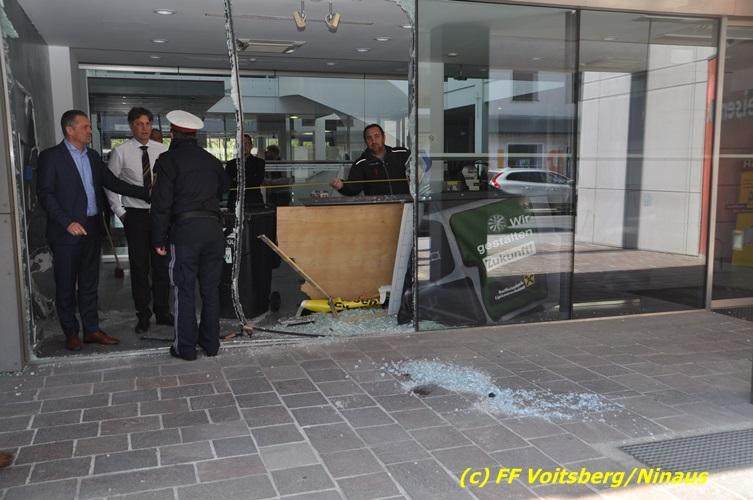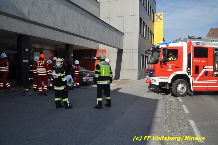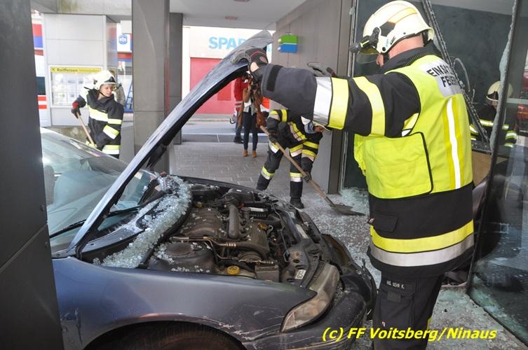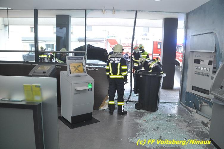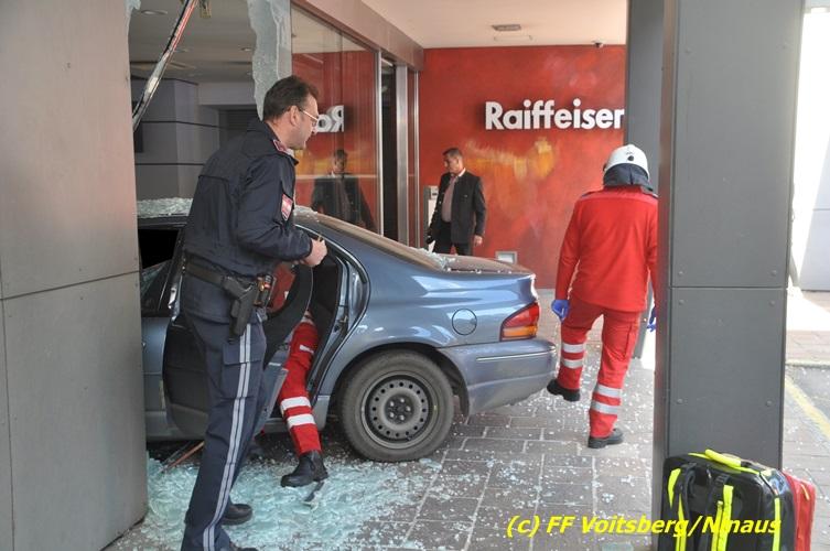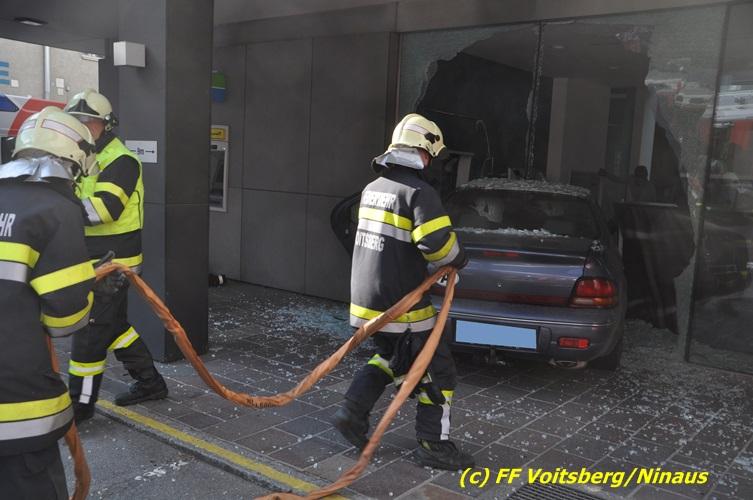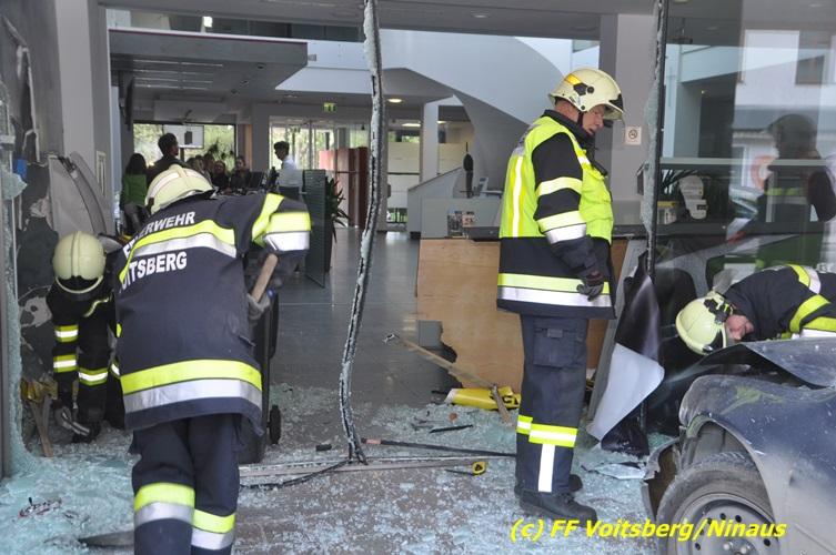 VOITSBERG, am 20.04.2017 Plötzlich stand ein PKW in der Bank Am Donnerstag, 20. April 2017 kurz vor 9 Uhr durchbrach ein PKW das Glasportal der Raiba - Hauptanstalt in Voitsberg, nachdem der Lenker vermutlich das Gaspedal anstatt dem Bremspedal betätigte. Das Fahrzeug kam im Schalterraum der Bank so zu stehen, dass die Fahrertür des Unfallfahrzeuges nicht geöffnet werden konnte. Die FF Voitsberg barg das schwer beschädigte Fahrzeug, ehe der Lenker von Helfern des Roten Kreuzes gerettet werden konnte. Der Mann erlitt einen Schock und wurde ins LKH Voitsberg eingeliefert. Während der Bergungsarbeiten wurde ein zweifacher Brandschutz aufgebaut. Die ebenfalls alarmierte FF Krems war an der Einsatzstelle als Reserve anwesend. Die Erhebungen wurden von der Polizei Voitsberg durchgeführt. Während des Einsatzes kam es im Voitsberger Stadtgebiet kurz zu einem Stau. Großes Glück hatten zwei Personen, welche kurz vor dem Unfall in der Bank Geldautomaten betätigten und unversehrt blieben. Der Sachschaden am Gebäude und der Einrichtung ist enorm. Eingesetzt waren 11 Kräfte der FF Voitsberg unter Einsatzleiter ABI Ing. Klaus Gehr, das Rote Kreuz Voitsberg mit 6 Helfern und die Polizei Voitsberg mit 2 Beamten. Walter Ninaus, FF Voitsberg (Text und Fotos)