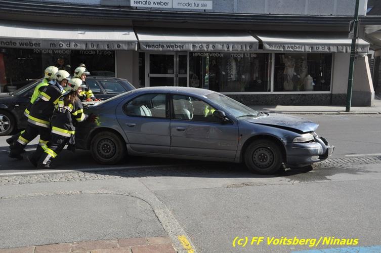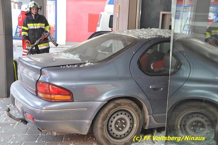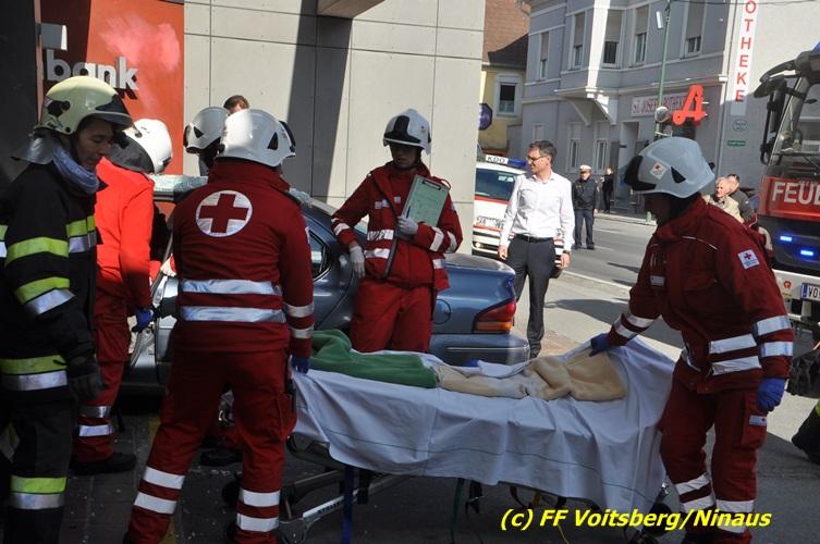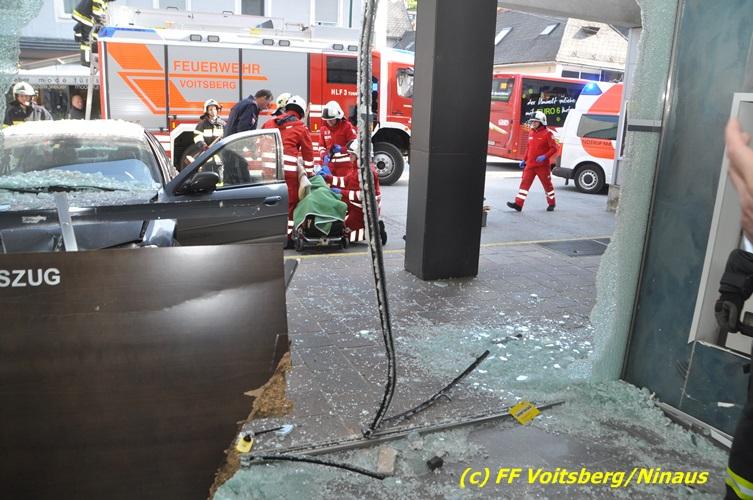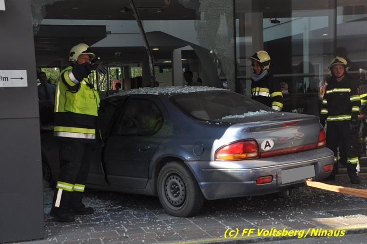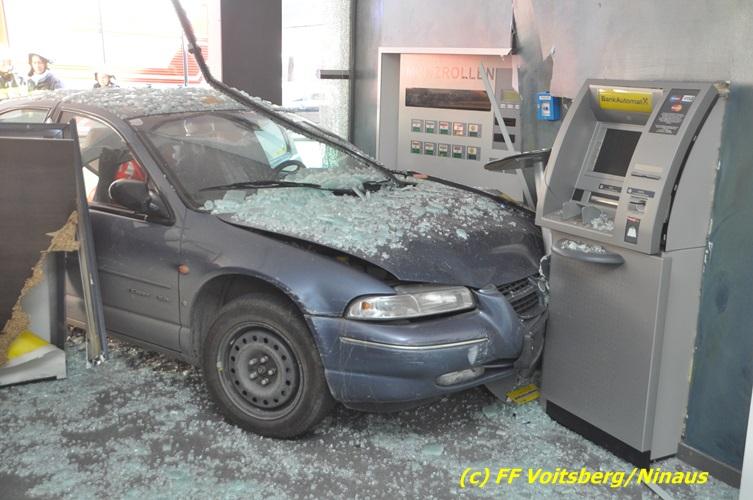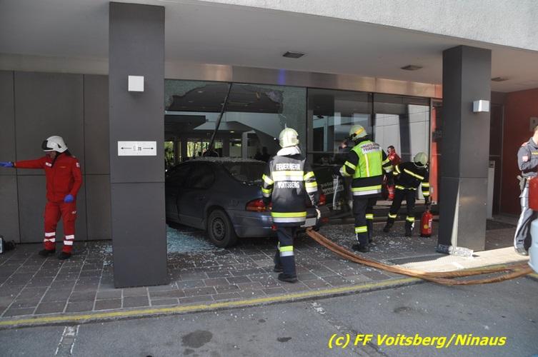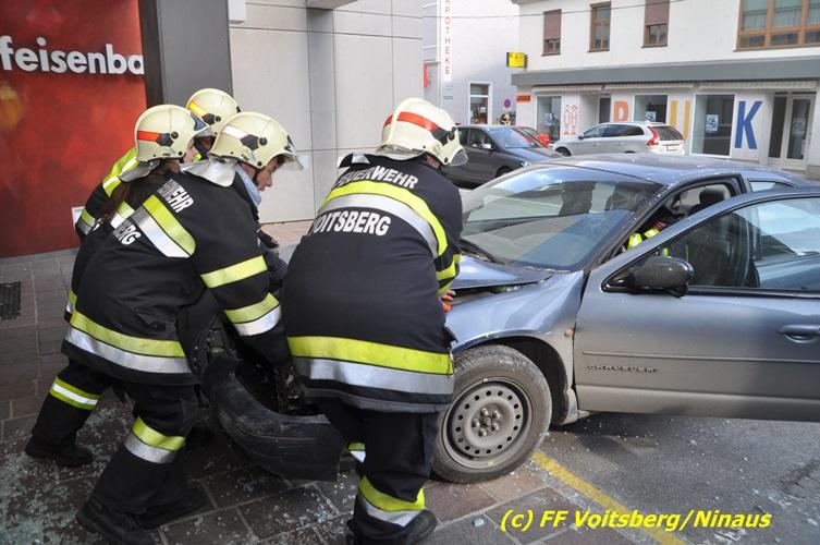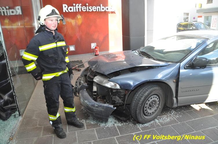 VOITSBERG, am 20.04.2017 Plötzlich stand ein PKW in der Bank Am Donnerstag, 20. April 2017 kurz vor 9 Uhr durchbrach ein PKW das Glasportal der Raiba - Hauptanstalt in Voitsberg, nachdem der Lenker vermutlich das Gaspedal anstatt dem Bremspedal betätigte. Das Fahrzeug kam im Schalterraum der Bank so zu stehen, dass die Fahrertür des Unfallfahrzeuges nicht geöffnet werden konnte. Die FF Voitsberg barg das schwer beschädigte Fahrzeug, ehe der Lenker von Helfern des Roten Kreuzes gerettet werden konnte. Der Mann erlitt einen Schock und wurde ins LKH Voitsberg eingeliefert. Während der Bergungsarbeiten wurde ein zweifacher Brandschutz aufgebaut. Die ebenfalls alarmierte FF Krems war an der Einsatzstelle als Reserve anwesend. Die Erhebungen wurden von der Polizei Voitsberg durchgeführt. Während des Einsatzes kam es im Voitsberger Stadtgebiet kurz zu einem Stau. Großes Glück hatten zwei Personen, welche kurz vor dem Unfall in der Bank Geldautomaten betätigten und unversehrt blieben. Der Sachschaden am Gebäude und der Einrichtung ist enorm. Eingesetzt waren 11 Kräfte der FF Voitsberg unter Einsatzleiter ABI Ing. Klaus Gehr, das Rote Kreuz Voitsberg mit 6 Helfern und die Polizei Voitsberg mit 2 Beamten. Walter Ninaus, FF Voitsberg (Text und Fotos)