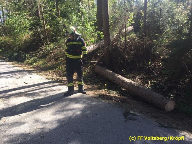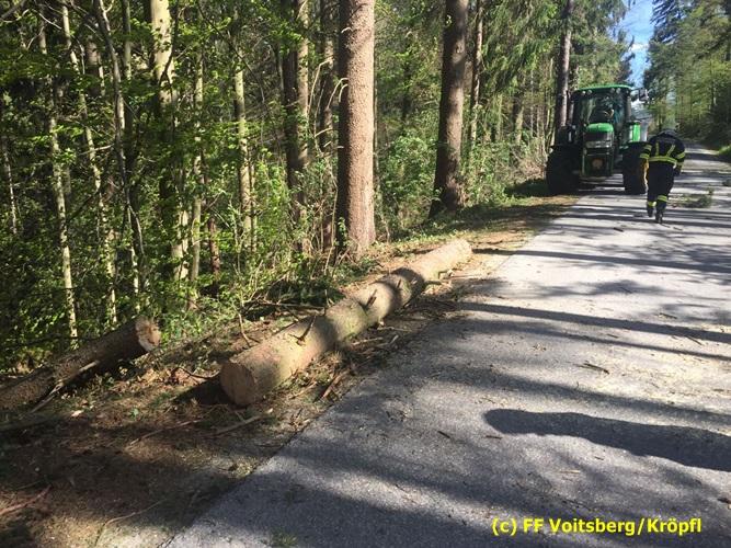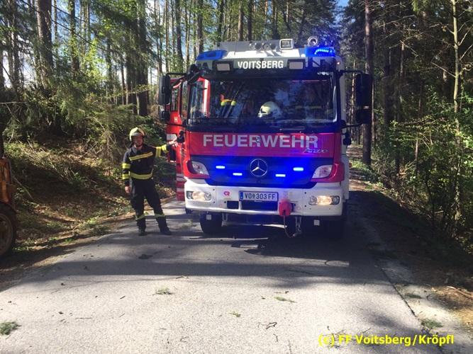 VOITSBERG, am 25.04.2017 Während eines Sturms stürzte ein Baum auf eine Gemeindestrasse. Bei Eintreffen der Feuerwehr war der Baum von einem Landwirt bereits fachgerecht geschnitten, sodass die Mannschaft nur mehr die Holzstücke von der Fahrbahn entfernen musste.