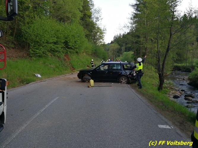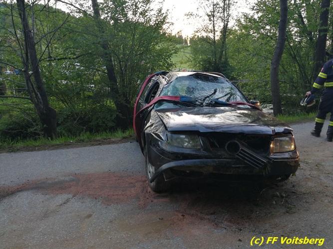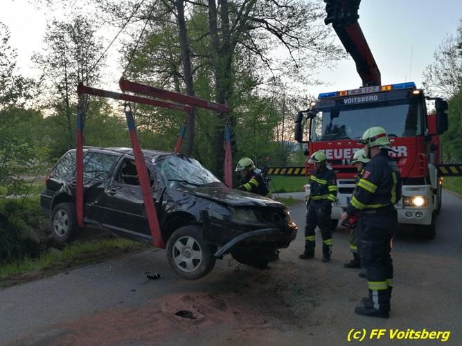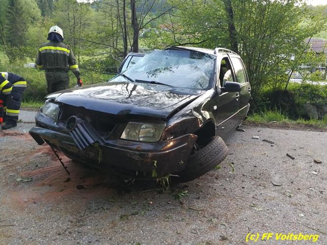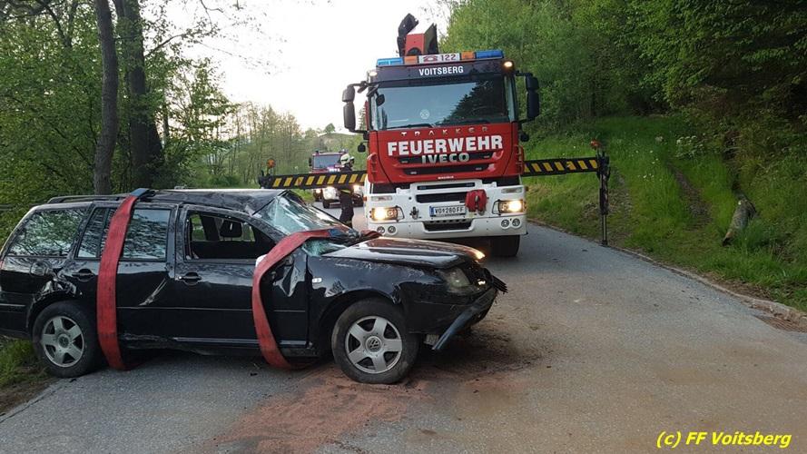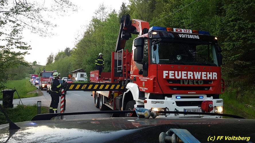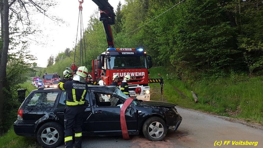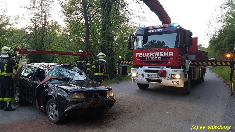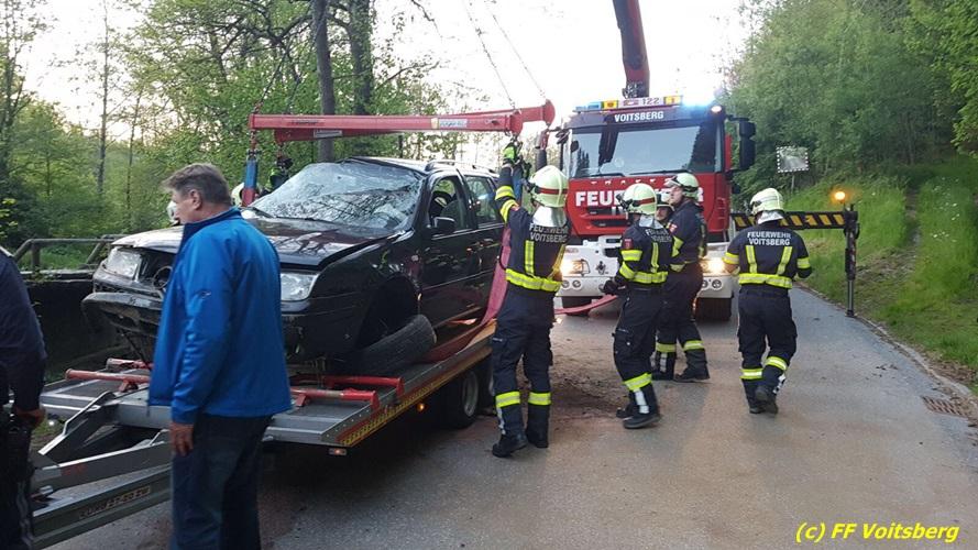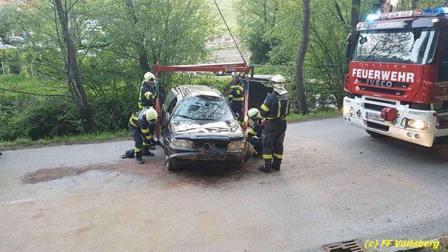 VOITSBERG, am 10.05.2017 Ein PKW kam von einer Landesstrasse ab, touchierte einen Felsen und einen Strommasten, überschlug sich und kam schwer beschädigt auf der Straße zu stehen. Das schwer beschädigte Fahrzeug wurde mit dem WLF-Kran auf einen Abschleppanhänger für den Abtransport verladen.