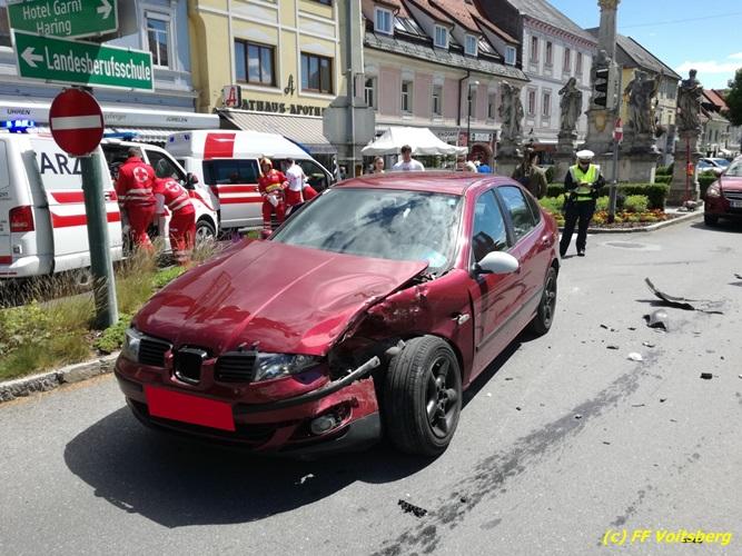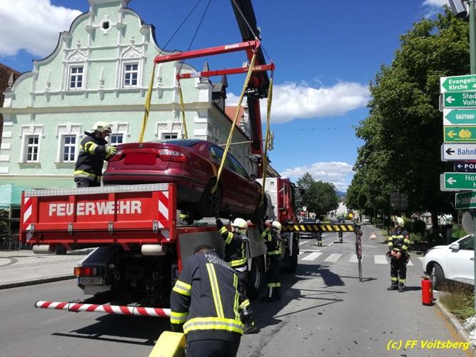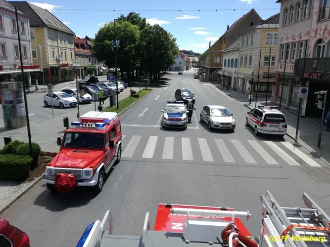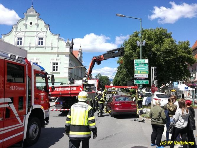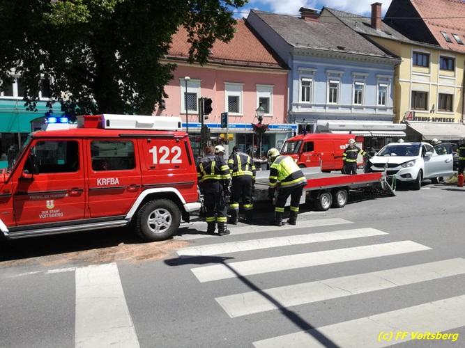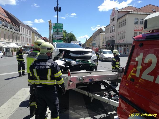 VOITSBERG, am 25.05.2017 Die Feuerwehren Voitsberg und Krems wurden mit dem Einsatzbefehl „Verkehrsunfall mit Menschenrettung am Hauptplatz Voitsberg“ alarmiert. Am Einsatzort angekommen konnte Einsatzleiter ABI Ing. Klaus Gehr feststellen, dass glücklicherweise keine Personen in den Fahrzeugen eingeklemmt waren. So war es Aufgabe der Feuerwehr, die Einsatzstelle abzusichern, den Brandschutz aufzubauen und die ausgelaufenen Betriebsmittel zu binden. Die verunfallten Fahrzeuge wurden mit dem WLF-K sowie mit dem Mehrzweckanhänger aus dem Gefahrenbereich verbracht. Nach gut einer Stunde war der Einsatz für die Feuerwehr beendet.