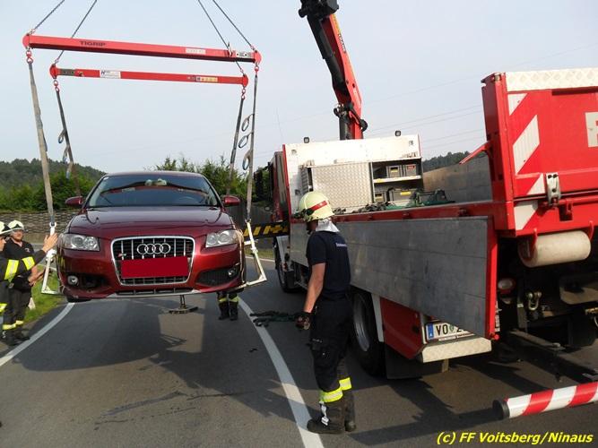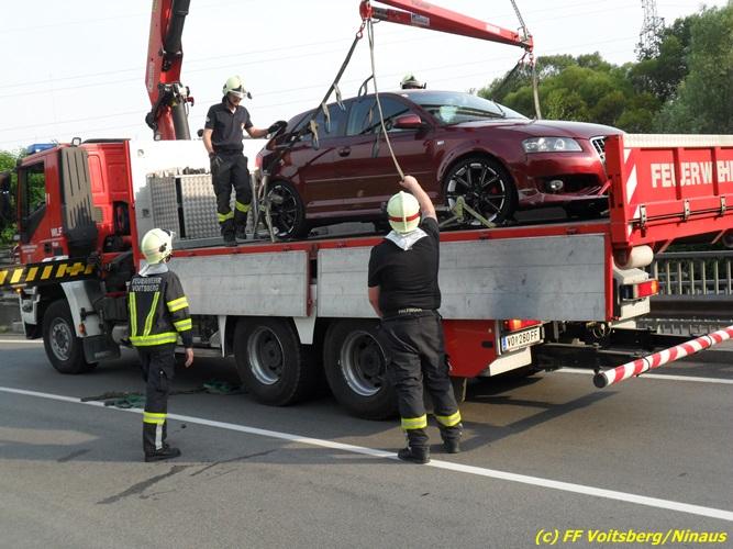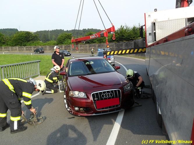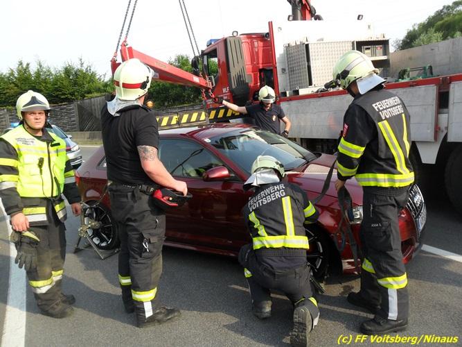 VOITSBERG, am 24.06.2017 Vermutlich wegen zu hoher Geschwindigkeit geriet ein PKW auf der Abfahrtsrampe Krems der Umfahrungsstrasse Voitsberg ins Schleudern, prallte gegen einen betonierten Brückensteg und beschädigte dabei die Vorderachse. Die alarmierte Feuerwehr Krems regelte den Verkehr und alarmierte über die LLZ Steiermark das WLF-Kran der FF Voitsberg zwecks Bergung und Entfernung des Fahrzeuges von der Unfallstelle. Verletzt wurde niemand.