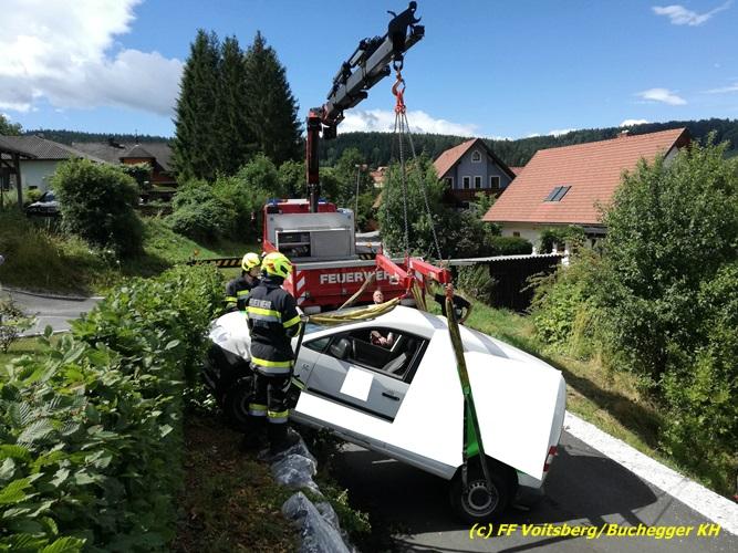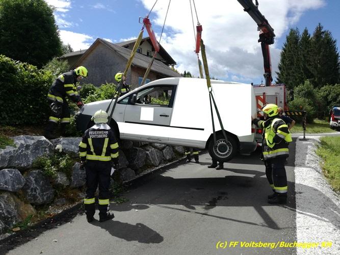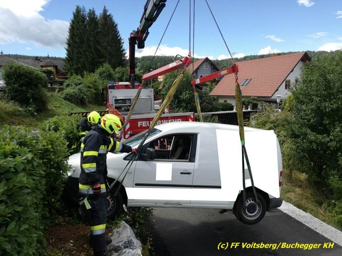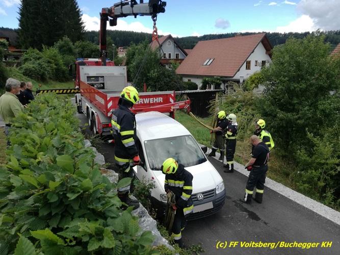 VOITSBERG, am 29.06.2017 Bergung eines PKW mittels WLF-Kran nach Anforderung durch die FF Rosental, nachdem dieser von einem Parkplatz über eine Kante rollte und dort stecken blieb. Der Lenker konnte die Fahrt auf eigener Achse fortsetzen.