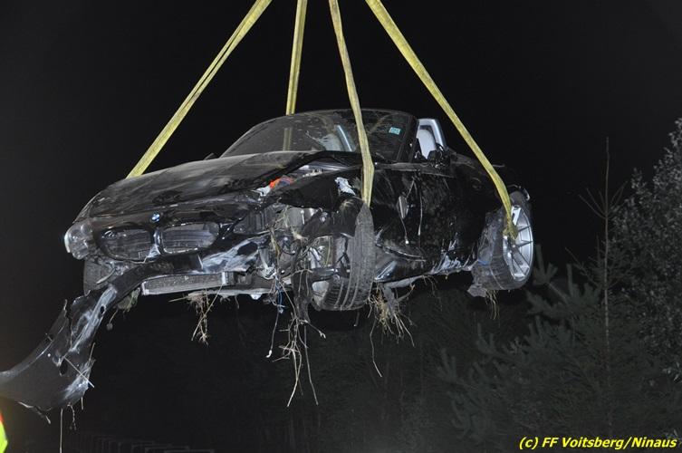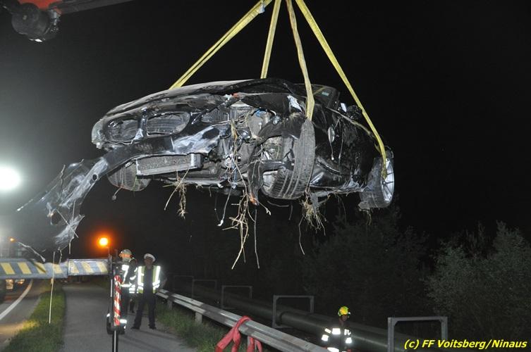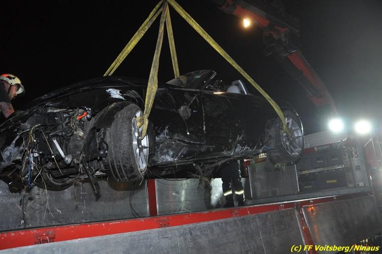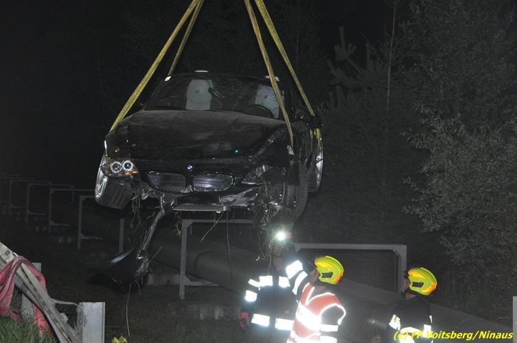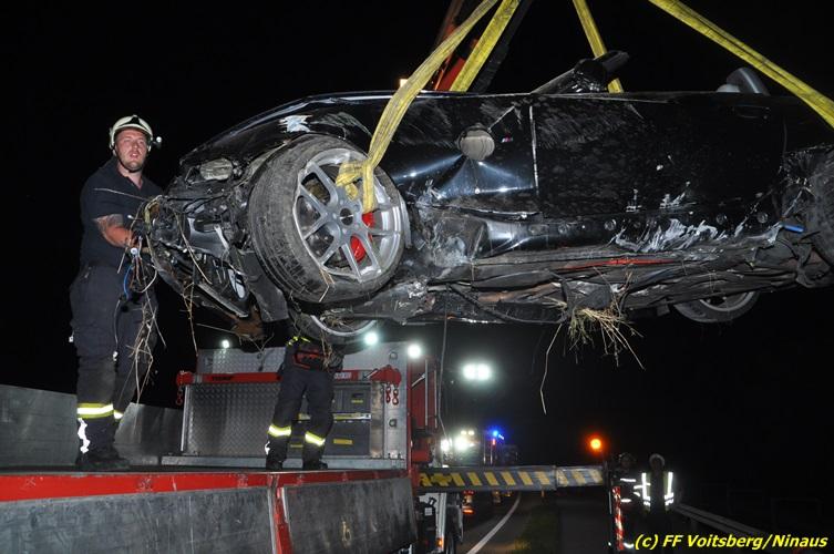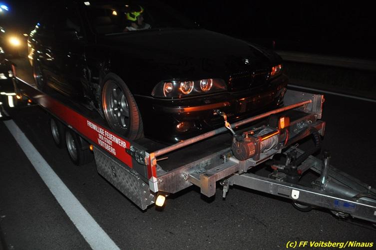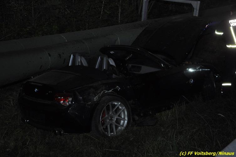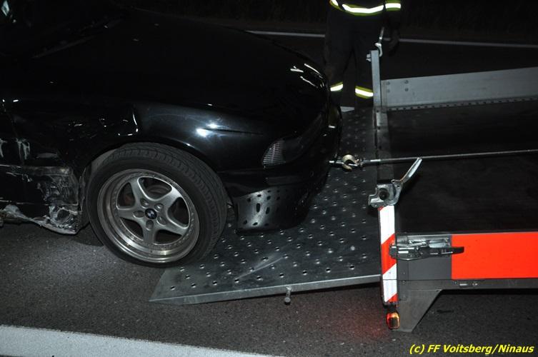 VOITSBERG, am 18.07.2017 Aufgrund zu hoher Geschwindigkeit touchierten zwei PKW auf der zweispurigen Richtungsfahrbahn der LB 70 Richtung Graz zwischen Köflach und Rosental seitlich, sodass ein Fahrzeug schwer beschädigt nach 140 Meter auf der Fahrbahn zu stehen kam. Das zweite Fahrzeug kam nach dem Zusammenstoß rechts von der Bundesstraße ab, schlitterte auf einer Leitschiene entlang des Gehsteiges, gelangte nochmals auf den Gehsteig und katapultierte sich letztendlich über die Leitschiene in einen Graben und kam dort auf den Rädern zu stehen. Die Insassen beider Fahrzeuge hatten Riesenglück, dass sie unverletzt blieben. Die alarmierte FF Rosental baute einen Brandschutz auf, lotste die Fahrzeuge an der Unfallstelle vorbei, band mit Bindemittel ausgeflossene Betriebsmittel und entfernte herumliegende Wrackteile. Zur Bergung der Fahrzeuge wurde die FF Voitsberg mit dem WLF-Kran und dem Mehrzweckanhänger angefordert. Die polizeilichen Erhebungen wurden von der PI Köflach durchgeführt. Eingesetzt waren die FF Rosental und die FF Voitsberg mit insgesamt 22 Kräften und 4 Fahrzeugen, die Polizei mit 2 Beamten und 1 Fahrzeug sowie das Rote Kreuz mit 2 Fahrzeugen und 5 Helfern, welche aber nicht in Tätigkeit treten mussten.