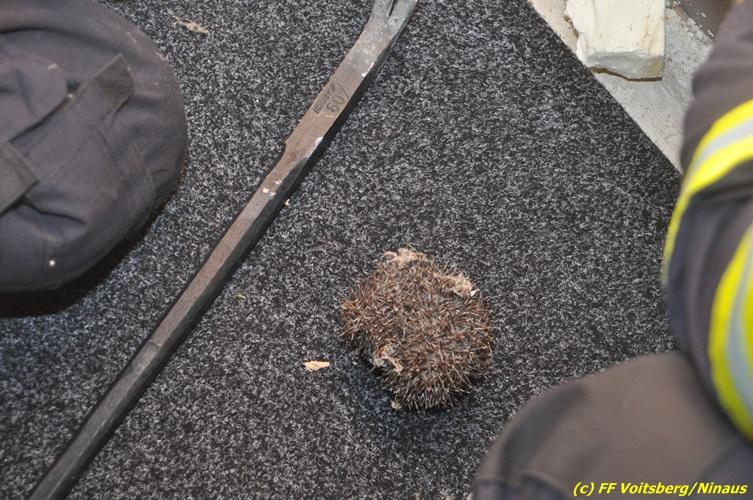 VOITSBERG, am 15.08.2017 Ein junger Igel stürzte, nachdem er vermutlich von Katzen in die Enge getrieben wurde, in einen Regenschacht und konnte sich nicht mehr befreien. Der Hausbesitzer verständigte zwecks Hilfeleistung über die LLZ die FF Voitsberg. Die Kameraden bauten das Rohr, welches in den Schacht führt ab und konnten den unverletzten Igel retten und in der Natur wieder aussetzen.