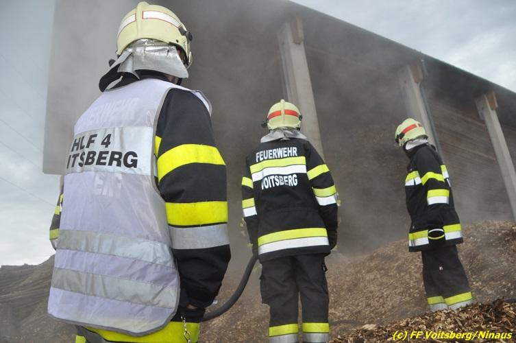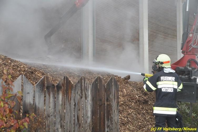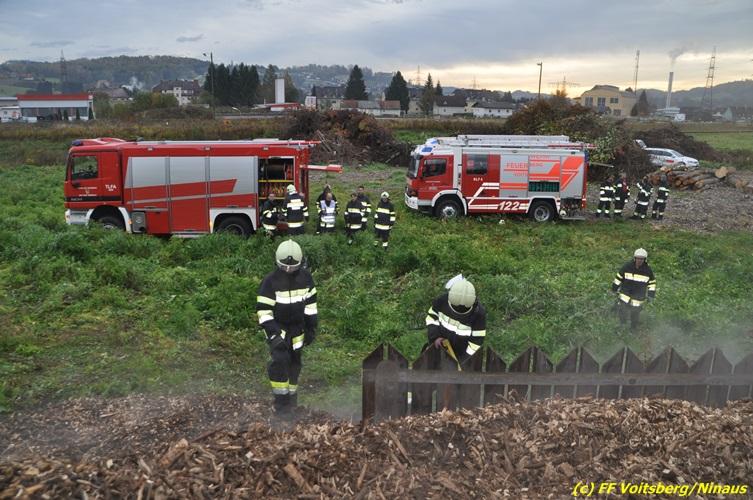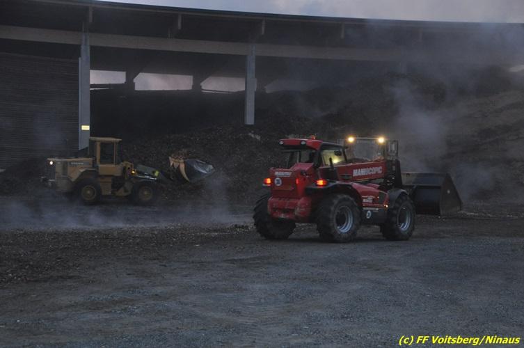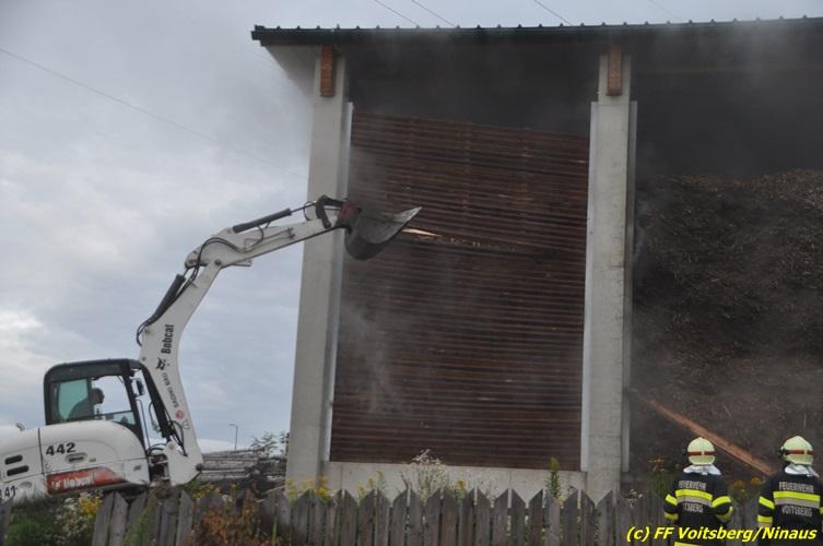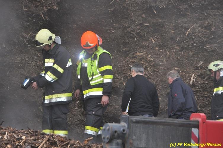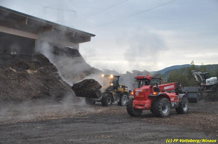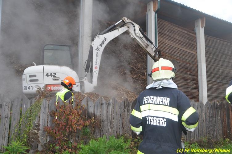 VOITSBERG, am 27.10.2017 In den frühen Morgenstunden wurde im Hackschnitzellager eines Biomasse-Heizwerkes einer Firma in Bärnbach aufsteigender Rauch entdeckt. Die alarmierten Feuerwehren Bärnbach und Voitsberg führten Erstmaßnahmen in Form von Kühlen der Verkleidung durch, um ein Ausbrechen eines Großbrandes zu verhindern. Inzwischen verständigte und eingetroffene schwere Gerätschaften begannen mit dem Ausräumen des laut Besitzers mit ca. 6.000 m³ Hackschnitzel befüllten Lagers. Auf der Ostseite des Areals wurden drei Felder der aus Holz bestehenden Wand entfernt und mit dem Ausräumen und Löschen begonnen. Der inzwischen eingetroffene Sachverständige und die Brandermittlung der Polizei konnten als Brandursache Selbstentzündung feststellen. Ein weiteres Übergreifen auf andere Teile der Halle konnte verhindert werden. Der Sachschaden ist noch nicht bekannt. Seitens der Feuerwehren waren unter der Einsatzleitung von OBI Michael Witreich (FF Bärnbach) insgesamt 28 Kameraden der Feuerwehren Bärnbach und Voitsberg im Einsatz.