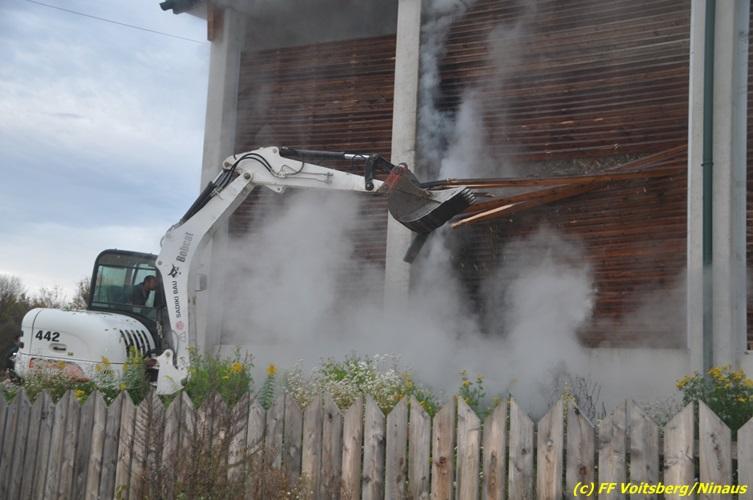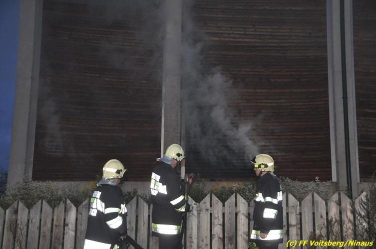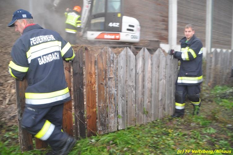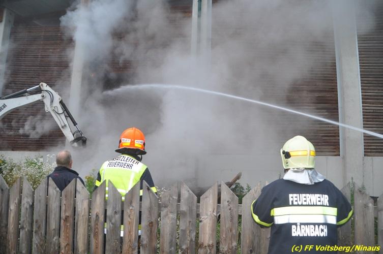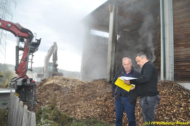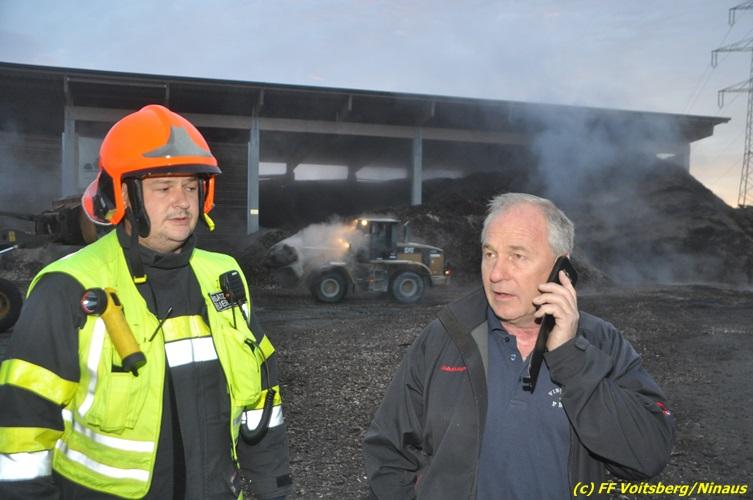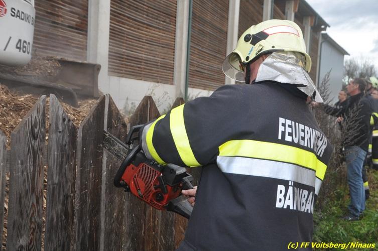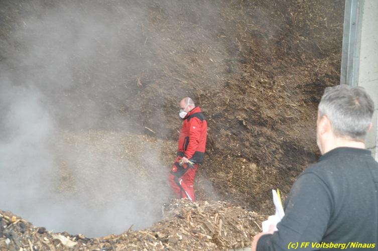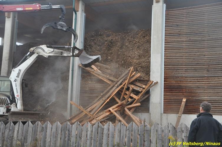 VOITSBERG, am 27.10.2017 In den frühen Morgenstunden wurde im Hackschnitzellager eines Biomasse-Heizwerkes einer Firma in Bärnbach aufsteigender Rauch entdeckt. Die alarmierten Feuerwehren Bärnbach und Voitsberg führten Erstmaßnahmen in Form von Kühlen der Verkleidung durch, um ein Ausbrechen eines Großbrandes zu verhindern. Inzwischen verständigte und eingetroffene schwere Gerätschaften begannen mit dem Ausräumen des laut Besitzers mit ca. 6.000 m³ Hackschnitzel befüllten Lagers. Auf der Ostseite des Areals wurden drei Felder der aus Holz bestehenden Wand entfernt und mit dem Ausräumen und Löschen begonnen. Der inzwischen eingetroffene Sachverständige und die Brandermittlung der Polizei konnten als Brandursache Selbstentzündung feststellen. Ein weiteres Übergreifen auf andere Teile der Halle konnte verhindert werden. Der Sachschaden ist noch nicht bekannt. Seitens der Feuerwehren waren unter der Einsatzleitung von OBI Michael Witreich (FF Bärnbach) insgesamt 28 Kameraden der Feuerwehren Bärnbach und Voitsberg im Einsatz.