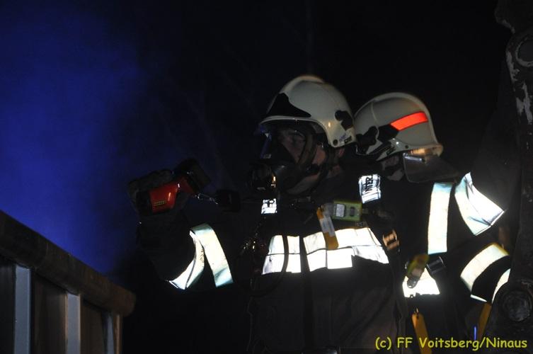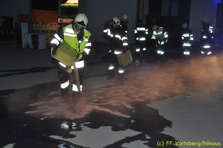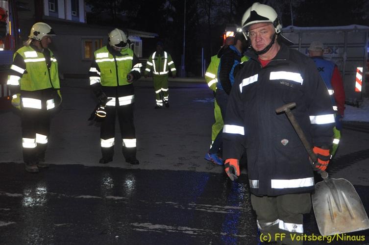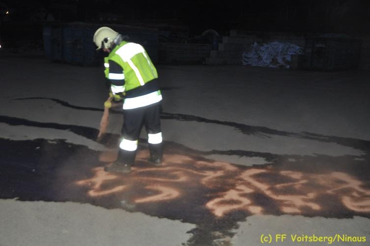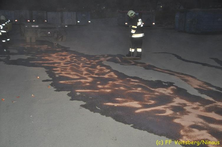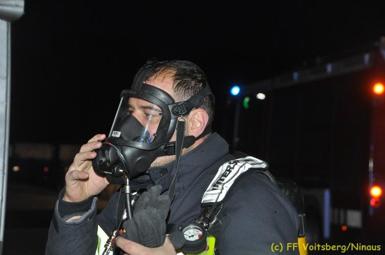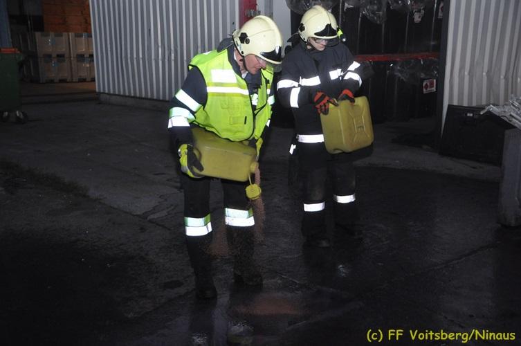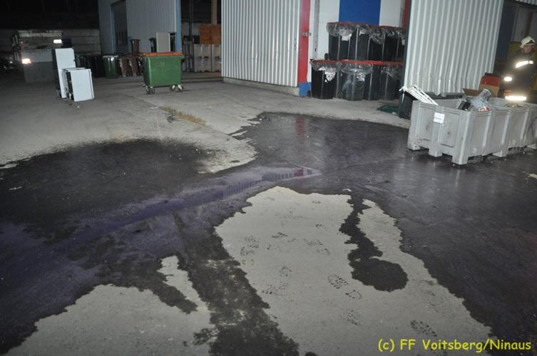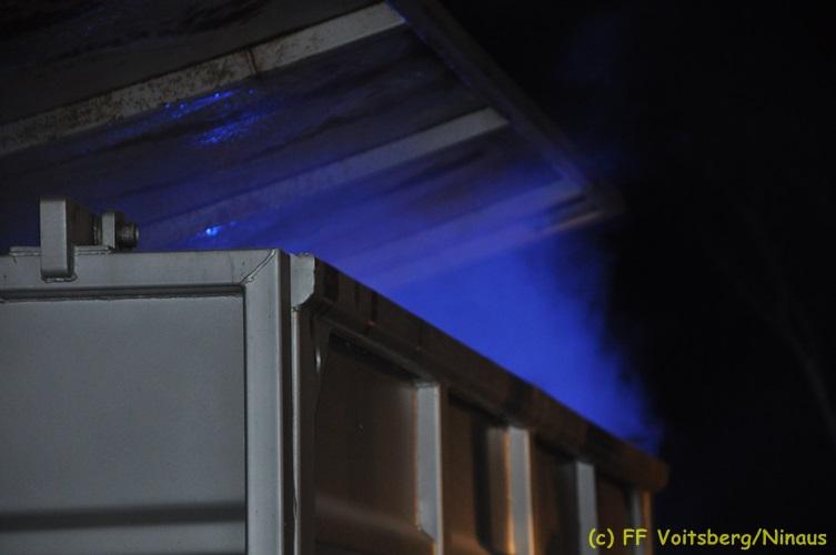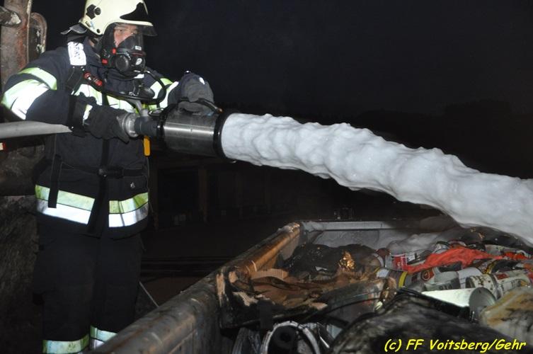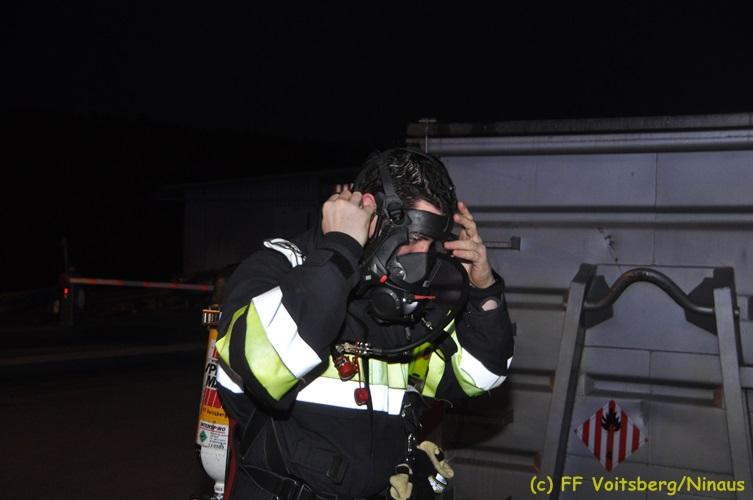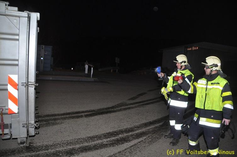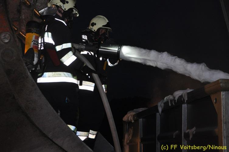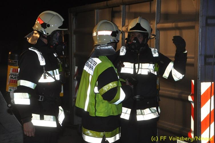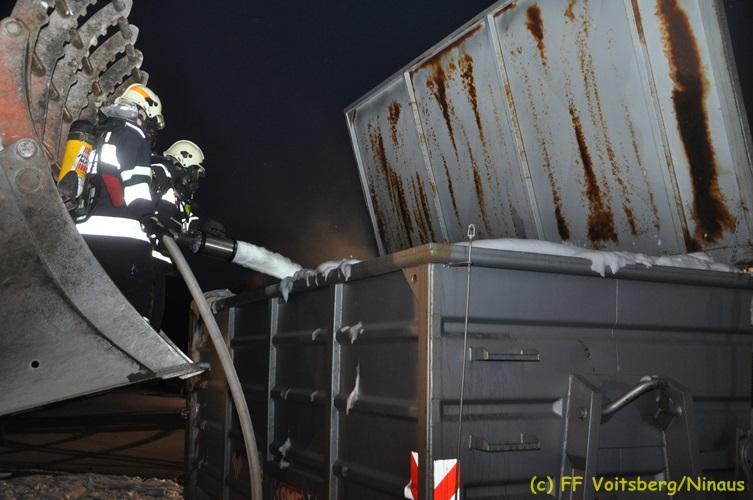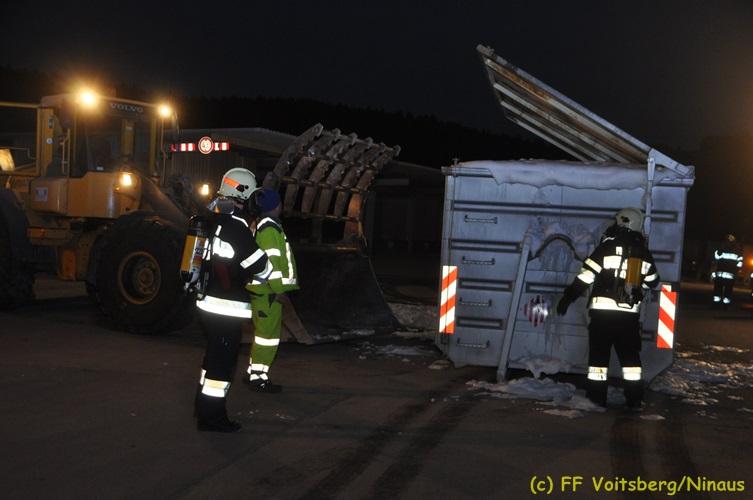 VOITSBERG, am 16.11.2017 Arbeiter bemerkten einen auf einem Betriebsgelände eines Abfallentsorgungsunternehmens rauchenden, mit Lack- und Farbabfällen abgestellten Großcontainer. Die Arbeiter brachten sofort den Container auf einen sicheren Platz und verständigten die Einsatzkräfte. Diese erkundeten nach Eintreffen die Lage und Feuerwehrkameraden unter schwerem Atemschutz fluteten danach mit Hilfe eines werkseigenen Ladegerätes den brennenden Inhalt mit Schaum, sodass das Feuer erstickt werden konnte. Ausgelaufene Flüssigkeiten wurden mit Bindemittel gebunden. Für die Umwelt bestand keine Gefahr. Bei diesem Ereignis konnte kein Sachschaden festgestellt werden. Die Feuerwehren Voitsberg und Krems waren unter Einsatzleitung von ABI Ing. Klaus Gehr und OBI Ing. Bernd Unger mit insgesamt 15 Kräften und die Polizei mit 2 Beamten im Einsatz. Text: Walter Ninaus Fotos: Klaus Gehr, Walter Ninaus