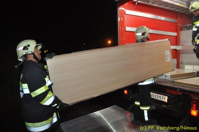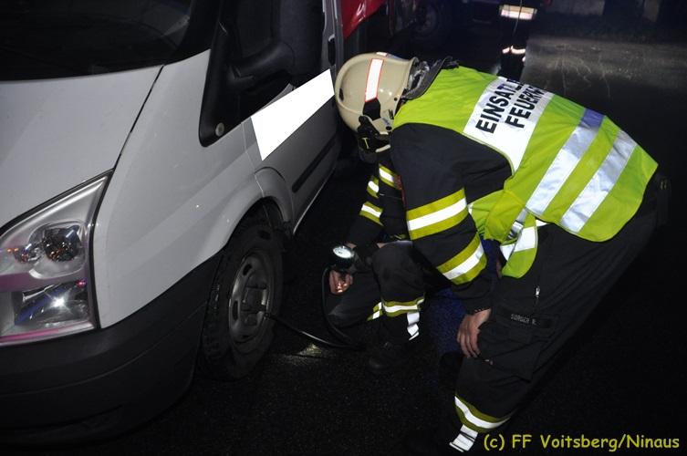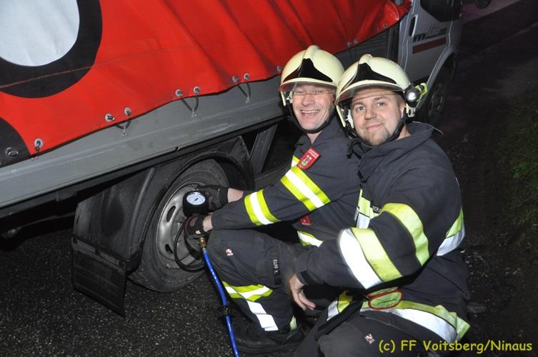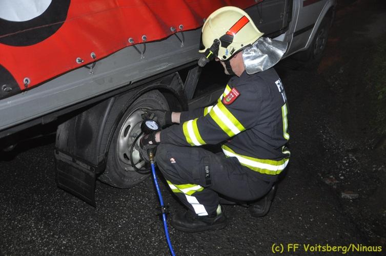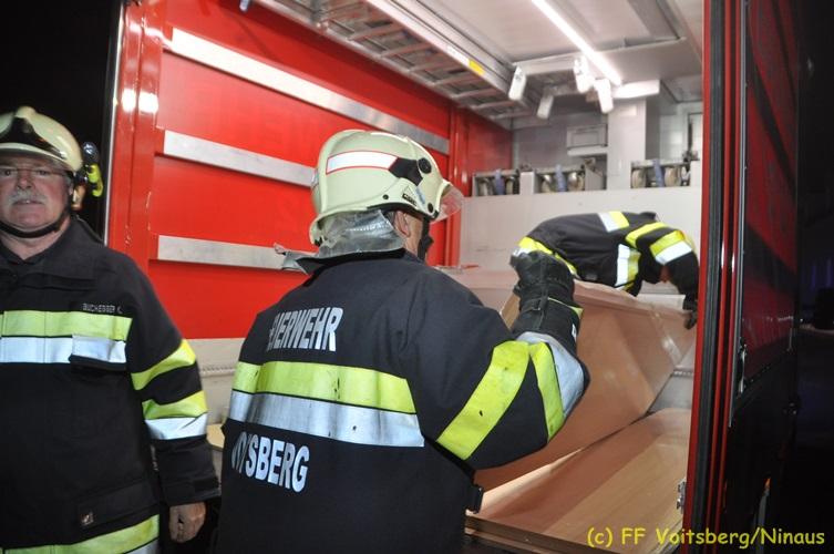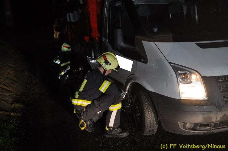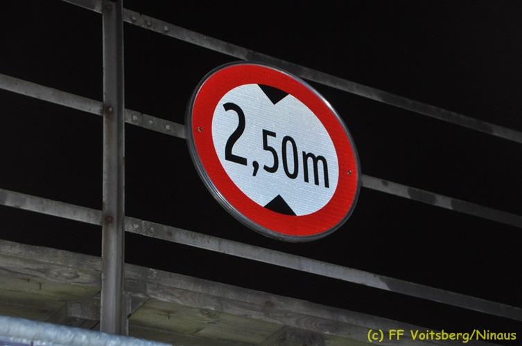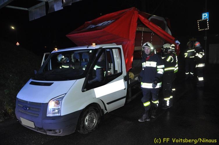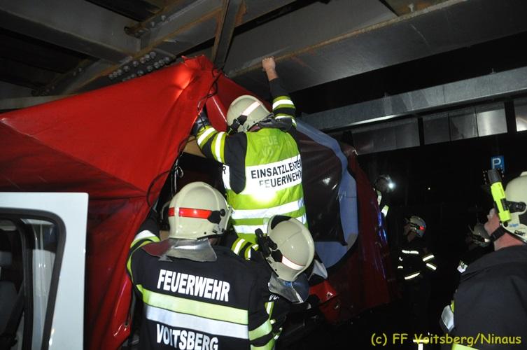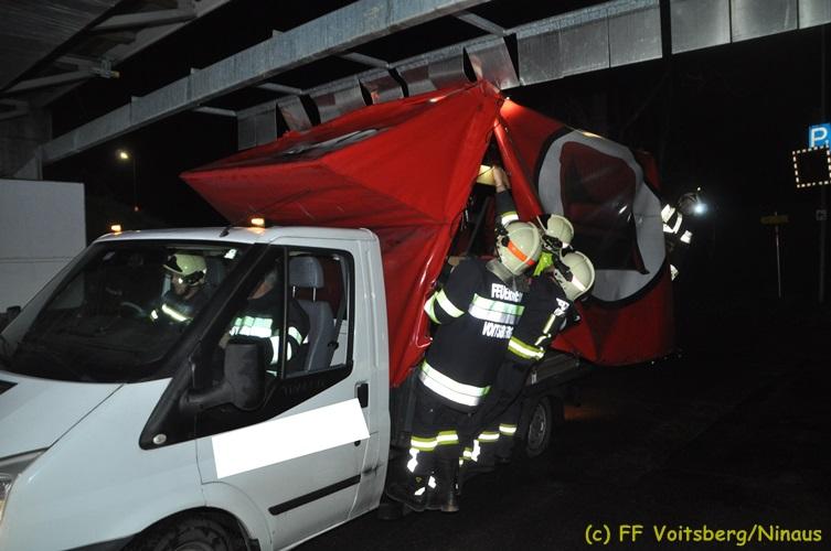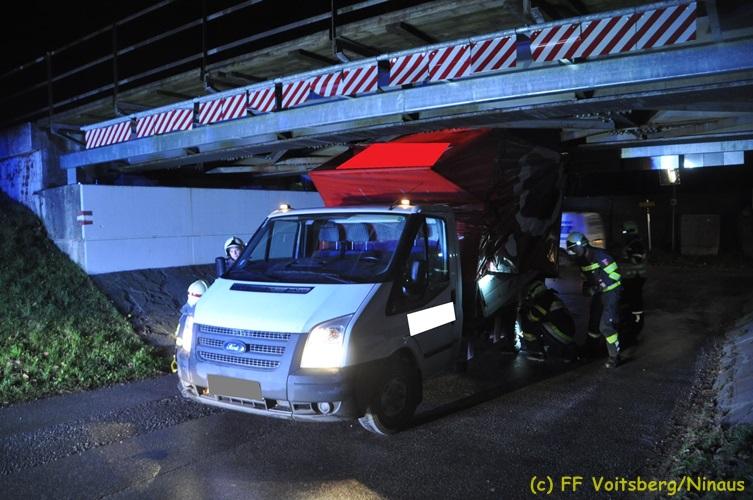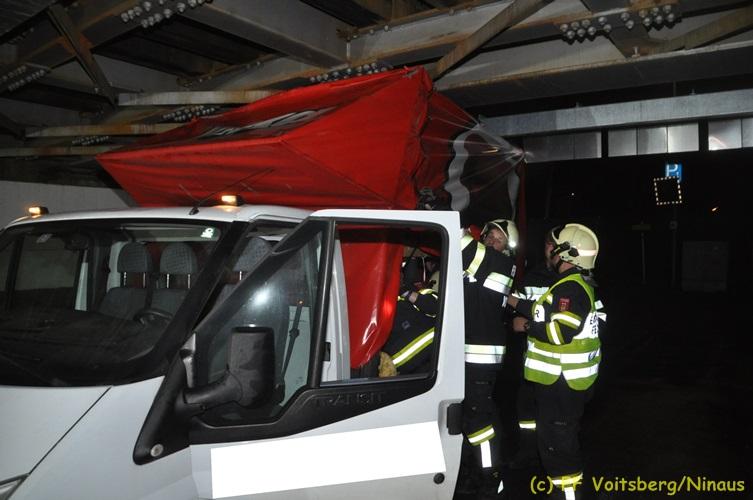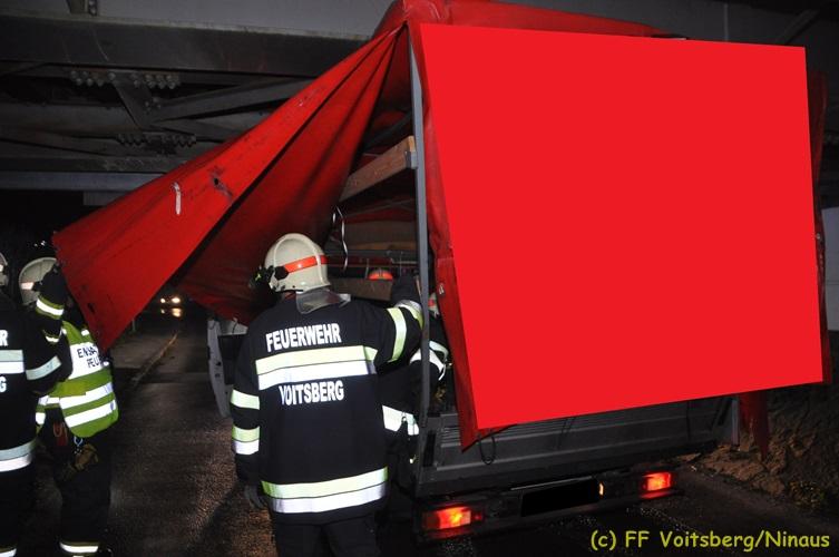 VOITSBERG, am 17.11.2017 Die Unachtsamkeit einer Lenkerin ist Schuld, dass ein Leih-Klein-LKW einer Möbelfirma bei der Bahnunterführung in der Greißeneggerstrasse in Voitsberg stecken blieb. Sie hatte die höchst mögliche Durchfahrtshöhe von 2,50 Meter übersehen. Die alarmierte FF Voitsberg ließ beim Fahrzeug Luft aus den Reifen, beschwerte das Fahrzeug mit Mannes/Frauenkraft und fuhr rückwärtsfahrend aus der misslichen Lage. Sodann wurden mit dem Kompressor des HLF3 wieder die Räder aufgepumpt und das Fahrzeug von der Unfallstelle entfernt. Das Ladegut wurde auf den LKW-A der FF Voitsberg umgeladen. Am Aufbau entstand großer Sachschaden. Die polizeilichen Erhebungen wurden von der PI Voitsberg durchgeführt. Ein verständigter Mitarbeiter der GKB konnte keine Schäden an der Brücke feststellen, sodass der Bahnverkehr nicht betroffen war.