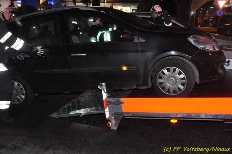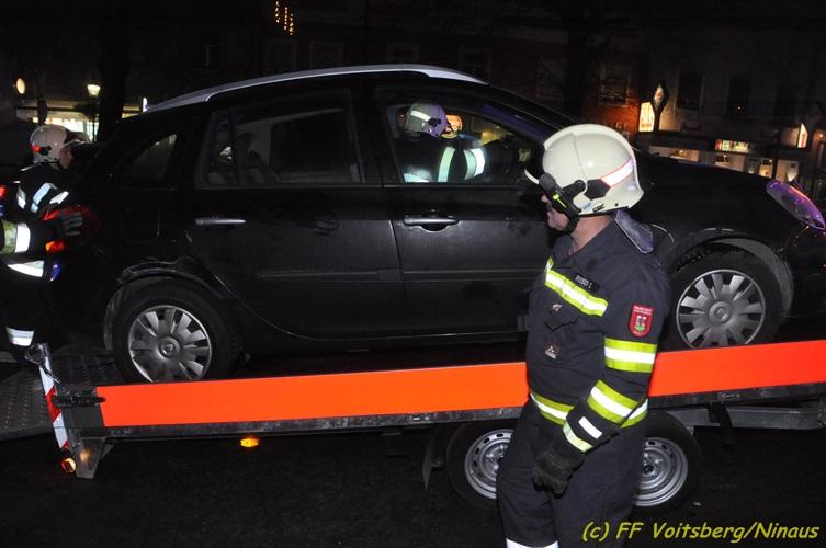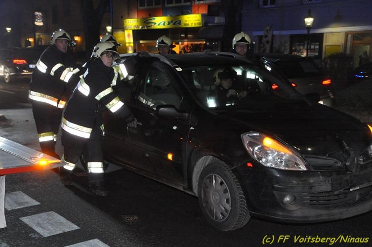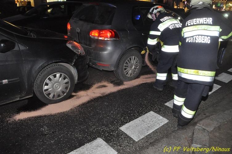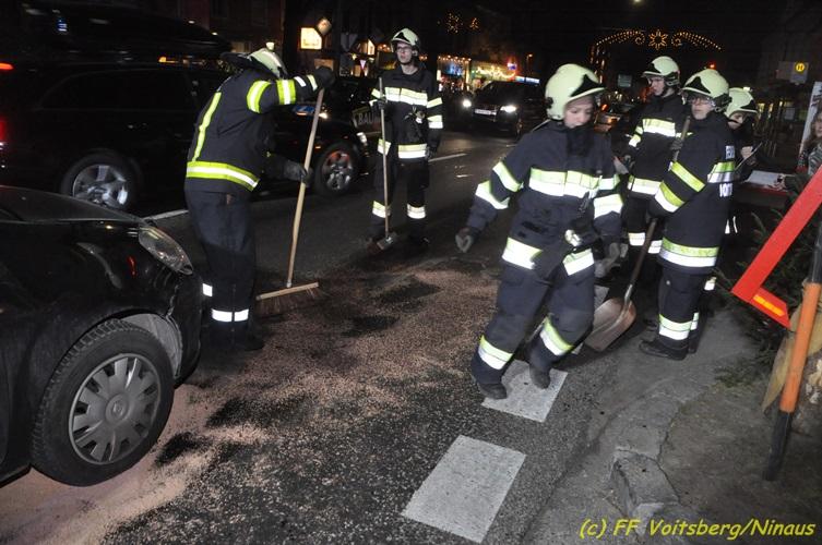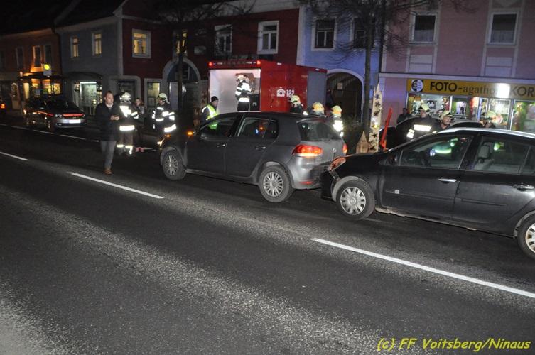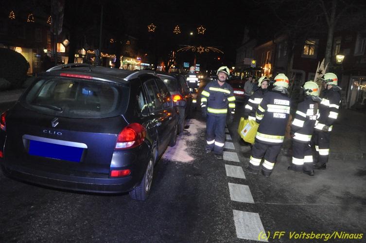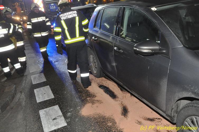 In den frühen Abendstunden des Mittwoch, 20. Dezember 2017 kam es am Voitsberger Hauptplatz zu einem Auffahrunfall. Ein in Richtung Graz fahrender Lenker fuhr mit seinem Fahrzeug auf ein vor ihm fahrendes Fahrzeug auf und verletzte die Lenkerin leicht. Bei einem Fahrzeug gelangten Betriebsmittel auf die Fahrbahn, welche von der FF Voitsberg gebunden wurden. Beide Fahrzeuge wurden von der Unfallstelle entfernt, wobei ein Fahrzeug aufgrund auslaufender Betriebsmittel von der Feuerwehr zu einem gesicherten Abstellplatz gebracht wurde. Aufgrund des Unfalls kam es zu einem Stau in beiden Richtungen. Die FF Voitsberg war mit 13 Einsatzkräften und drei Fahrzeugen unter dem Einsatzleiter Rene Sorger im Einsatz. Das Rote Kreuz versorgte die Verletzte und brachte sie in ein Krankenhaus. Die polizeilichen Erhebungen wurden von der PI Voitsberg durchgeführt. Text und Fotos: Walter Ninaus, FF Voitsberg