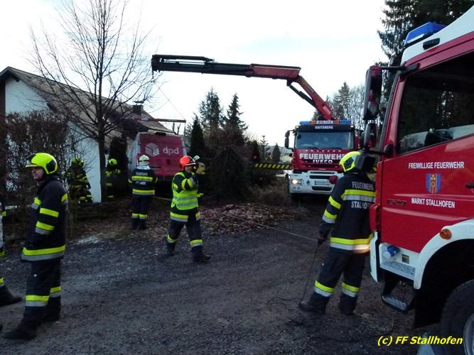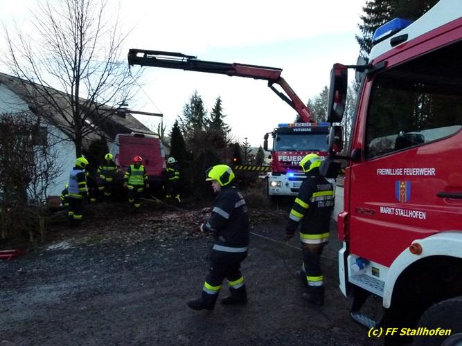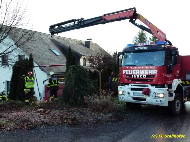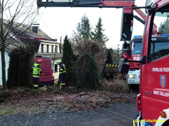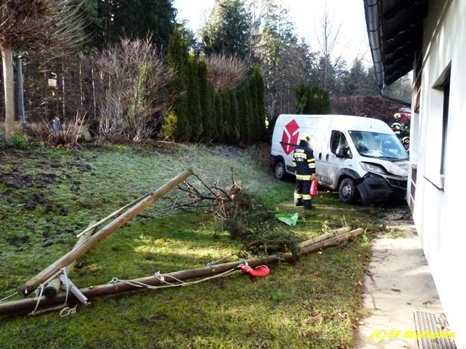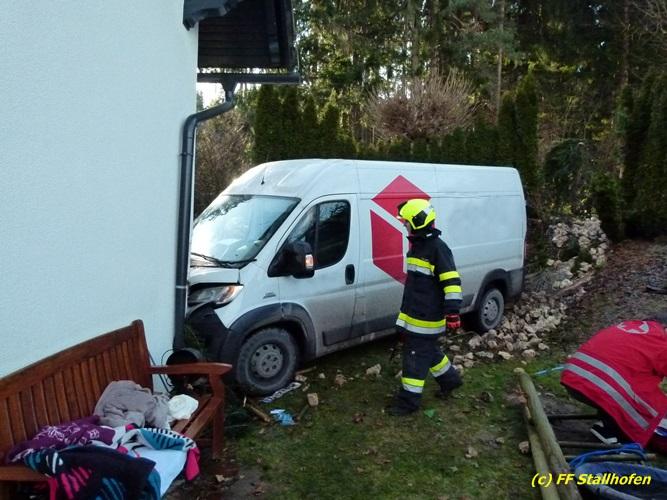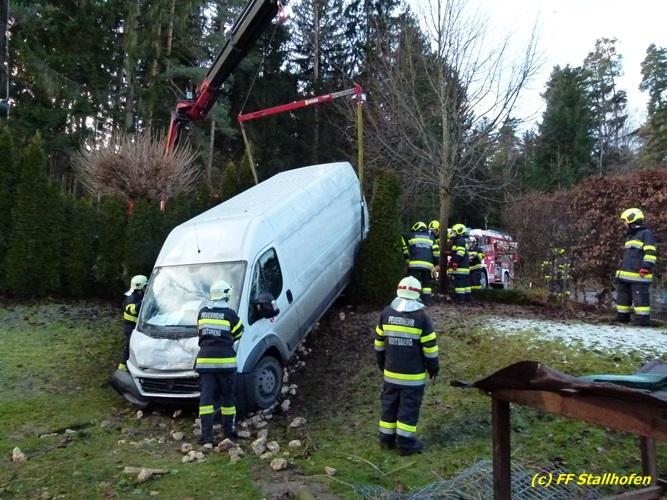 VOITSBERG, am 23.12.2017 In den Vormittagsstunden des Samstag, 23. Dezember 2017 kam ein Lenker eines Kleintransporters aus ungeklärter Ursache von der Landesstrasse zwischen Stallhofen und Bernau ab, durchstieß einen bepflanzten Zaun und prallte gegen eine Hausmauer. Bei diesem Unfall kann man von Glück sprechen, dass sich dort zum Unfallzeitpunkt niemand aufhielt. Der Lenker wurde von einem First Responder und Sanitätern der FF Stallhofen erstversorgt, mit Verletzungen unbestimmten Grades dem Roten Kreuz übergeben und ins LKH Voitsberg eingeliefert. Die Bergung des Fahrzeuges wurde in Zusammenarbeit der Feuerwehren Stallhofen (Seilwinde) und dem WLF-Kran Voitsberg durchgeführt. Eingesetzt waren insgesamt 34 Einsatzkräfte der Feuerwehren, des Rote Kreuzes und der Polizei. Nach 1,5 Stunden konnte der Einsatzleiter HBI Rupert Preglau das Ende des Einsatzes an Florian Steiermark melden.