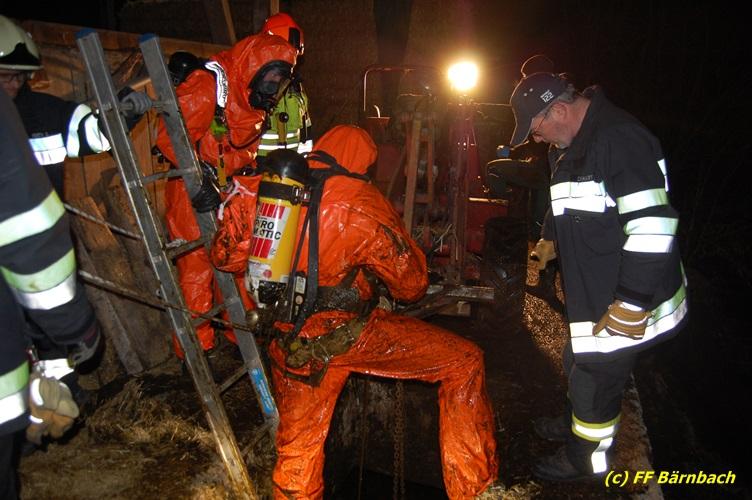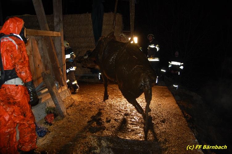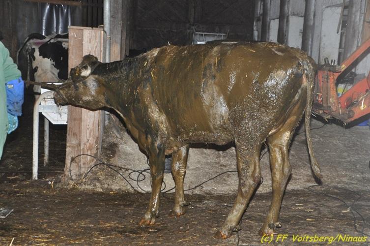 VOITSBERG, am 20.01.2018 In den frühen Abendstunden des Samstag, 20. Jänner 2018 stürzte auf einem bäuerlichen Anwesen im Ortsteil Lichtenegg der Stadtgemeinde Bärnbach eine Kuh in eine ca. 4 m tiefe, gefüllte Jauchengrube. Nach ersten erfolglosen Versuchen des Landwirtes und seines Sohnes das Tier zu retten wurde die FF Bärnbach über die LLZ Steiermark alarmiert. Nach dem Eintreffen begaben sich zwei Kameraden unter schwerem Atemschutz gesichert in die Grube, um die Einsatzlage zu erkunden. Man sicherte als Erstmaßnahme das Tier mit Leinen und Ketten. Des Weiteren wurde mit einem Drucklüfter frische Luft in die Grube geblasen. Zwecks Rettung der Kuh wurde unverzüglich das WLF der FF Voitsberg angefordert. Mit der Seilwinde des Krans wurde in Zusammenarbeit beider Wehren das unverletzte Tier mit Gurten geborgen. Nach der erfolgreichen Rettung wurde die Kuh gewaschen und auf ihren Stand im Stall gebracht.