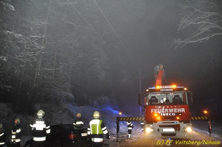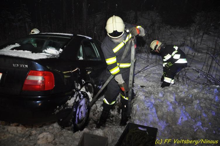 VOITSBERG, am 12.02.2018 Kurz nach 20 Uhr des Montag, 12. Februar 2018 kam ein Lenker mit seinem PKW in der Zangtalerstrasse in Voitsberg von der Straße ab und landete in einer Wiese neben der Straße im Tiefschnee. Er wurde mit dem WLF-Kran der FF Voitsberg geborgen und konnte die Fahrt auf eigener Achse fortsetzen. Verletzt wurde niemand.