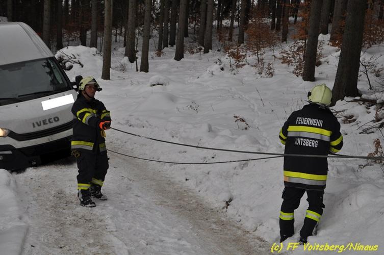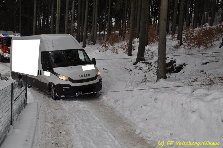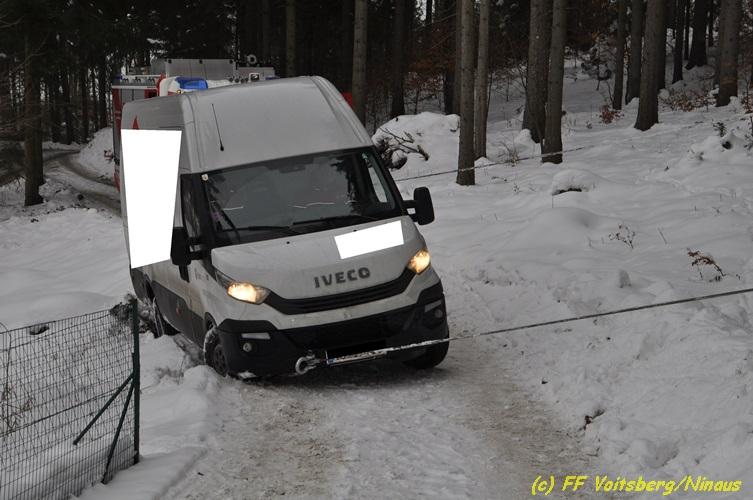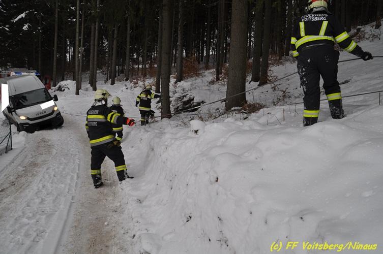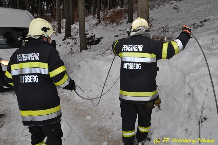 VOITSBERG, am 05.03.2018 Ein Lenker kam mit seinem Kleintransporter beim Rückwärtsfahren auf einem Privatweg in Voitsberg von der Fahrbahn seitlich ab und drohte auf einer Wiese weiter abzurutschten. Die von der LLZ Florian Steiermark verständigte FF Voitsberg sicherte das Fahrzeug und barg es mittels Seilwinde des HLF 3 unter Verwendung einer Umlenkrolle. Der Lenker konnte die Fahrt mit dem unbeschädigten Fahrzeug weiter fortsetzen.