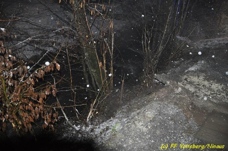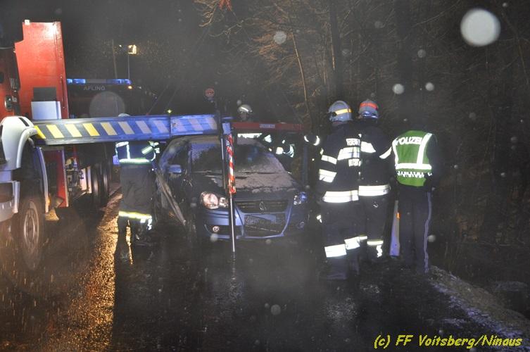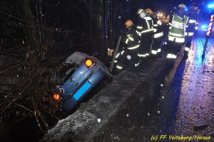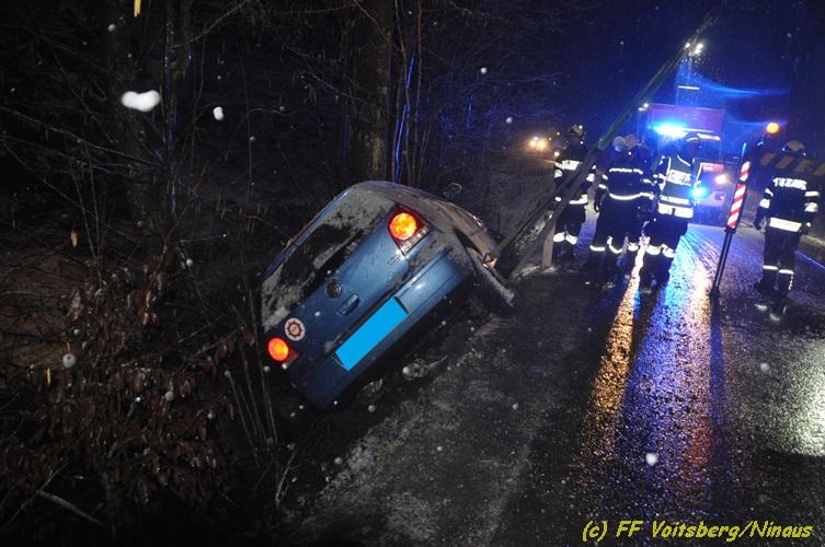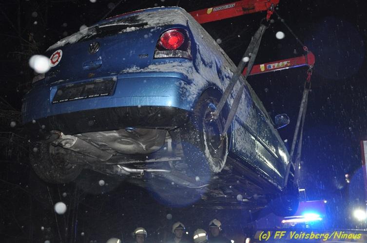 VOITSBERG, am 17.03.2018 In den frühen Abendstunden des Samstag, 17. März 2018 geriet eine Lenkerin aus unbekannten Gründen von der Gemeindestrasse im Freisinggraben (Gemeinde Bärnbach) von der Straße ab und stürzte seitlich ca. 2 m über einen Abhang gegen einen Baum, welcher einen weiteren Sturz in einen hochwasserführenden Bach verhinderte. Die Frau wurde im Fahrzeug eingeklemmt und musste von Kameraden der Feuerwehren Afling und Bärnbach aus ihrer misslichen Situation befreit werden. Sie wurde mit Verletzungen unbestimmten Grades in ein Krankenhaus eingeliefert. Die Bergung des Fahrzeuges wurde mit dem WLF-Kran der FF Voitsberg durchgeführt. Eingesetzt waren insgesamt 28 Kameraden der Feuerwehren Afling, Bärnbach und Voitsberg, das Rote Kreuz und die Polizei. Text und Fotos: Walter Ninaus, FF Voitsberg