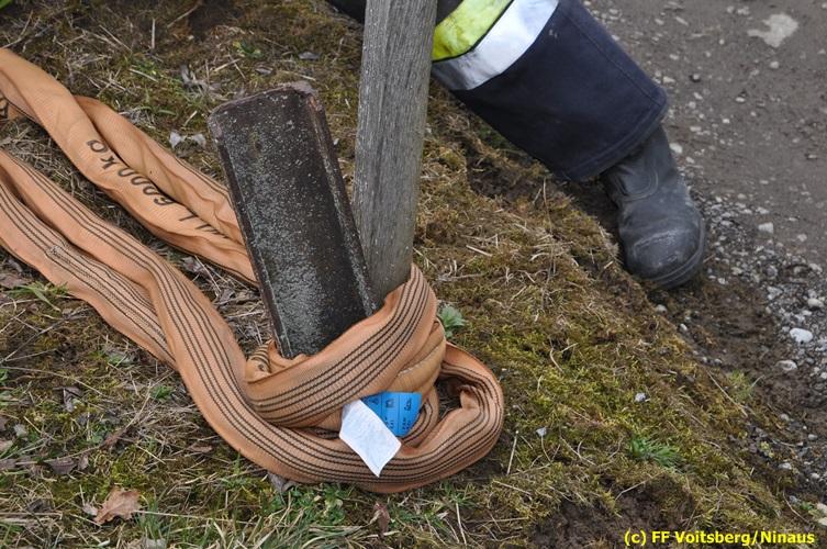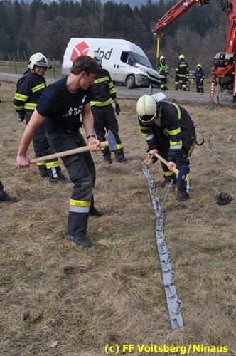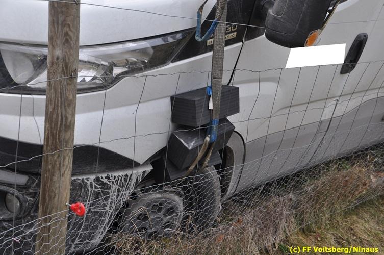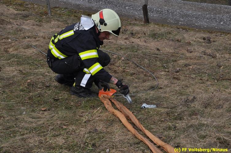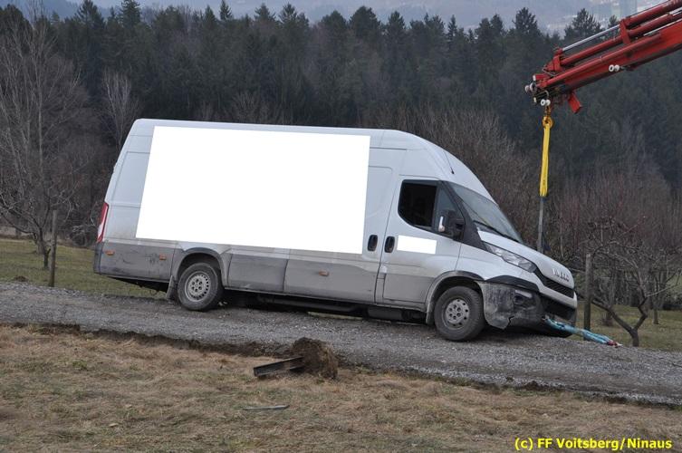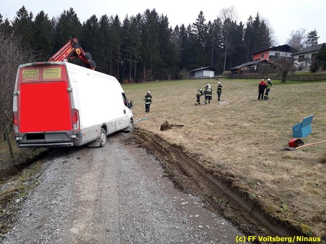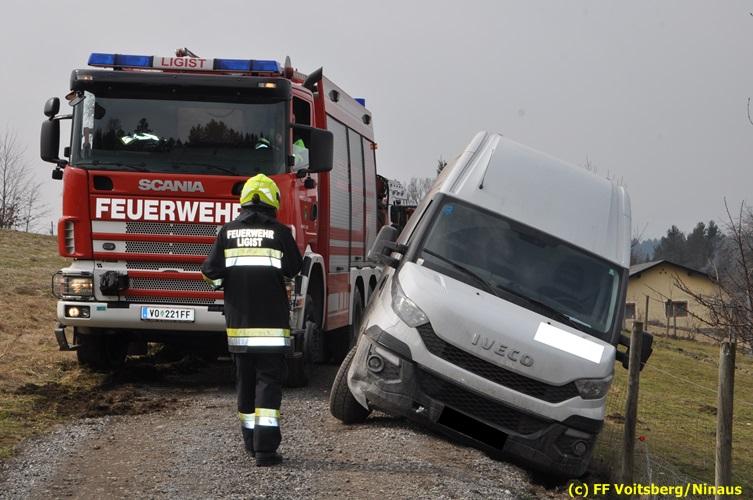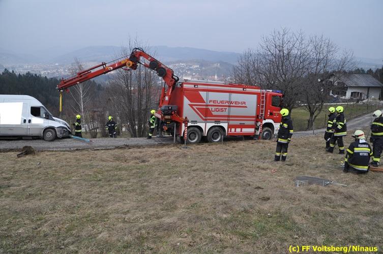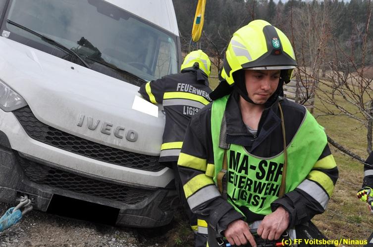 VOITSBERG, am 26.03.2018 Ein Lenker eines Kleintransporters kam beim Rückwärtsfahren links vom Weg ab. Die Bergung gestaltete sich schwierig, da das Fahrzeug jederzeit umzustürzen drohte. Mittels Sicherung durch Freilandanker und einer Umlenkrolle der FF Voitsberg sowie dem Kran des SRF Ligist konnte das Fahrzeug gemeinsam unbeschädigt auf die Straße gebracht werden und die Fahrt auf eigener Achse fortsetzen. Eingesetzt waren insgesamt 14 Kameradinnen der Feuerwehren Voitsberg und Ligist.