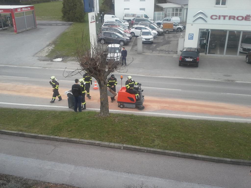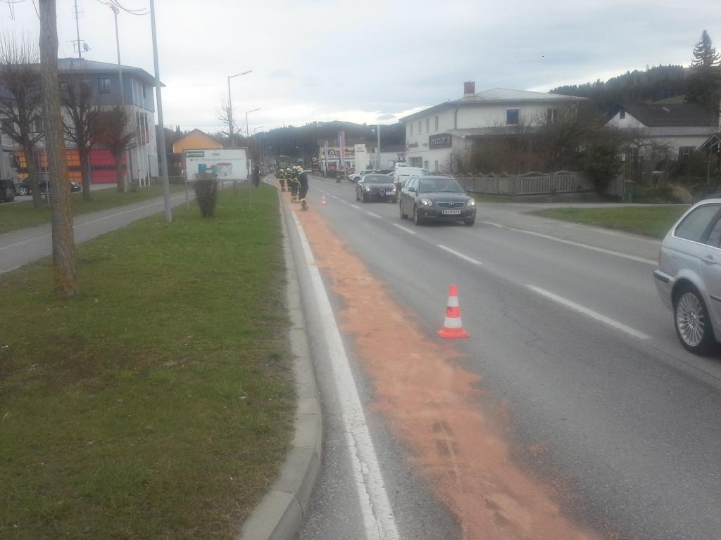 VOITSBERG, am 04.04.2018 In den Mittagsstunden des Mittwoch, 4. April 2018 platzte auf der Umleitungsstrecke für den Umfahrungstunnel vor dem Feuerwehrrüsthaus in der Grazer Vorstadt in Voitsberg einem ausländischen LKW ein Hydraulikschlauch. Die ausgelaufenen Betriebsmittel und die durch vorbeifahrende Fahrzeuge verursachte Ölspur wurden innerhalb kürzester Zeit gebunden. Durch einen Verkehrsregeldienst der Feuerwehr Voitsberg konnte auf der stark frequentierten Straße ein größerer Stau verhindert werden. 12 Mann / Frau standen unter der Einsatzleitung von ABI Gehr im Einsatz.