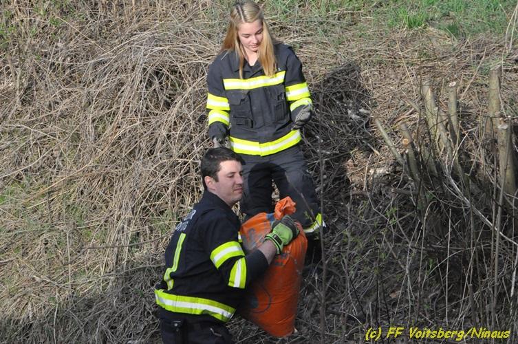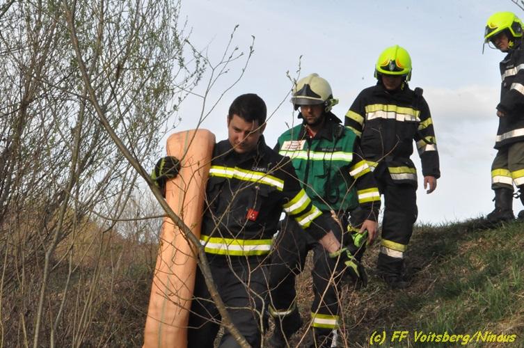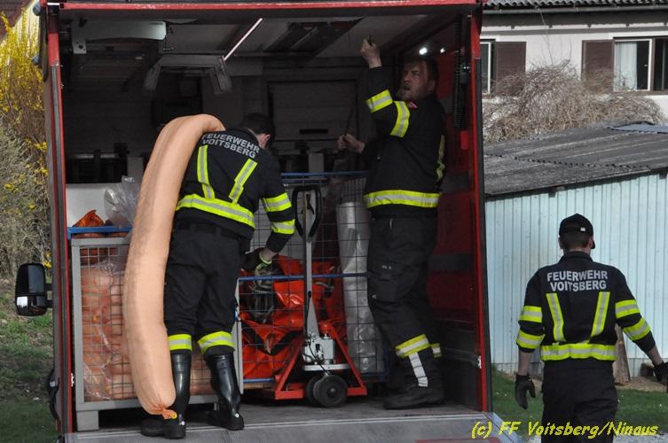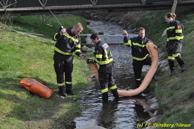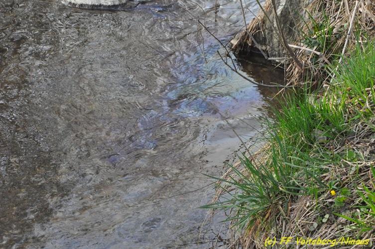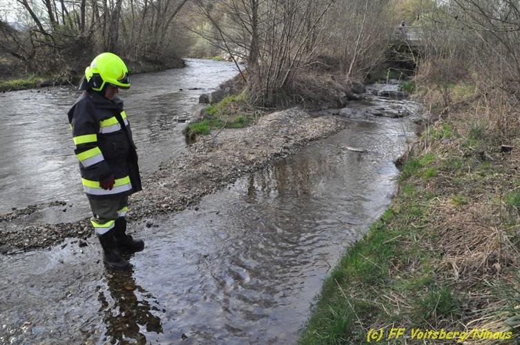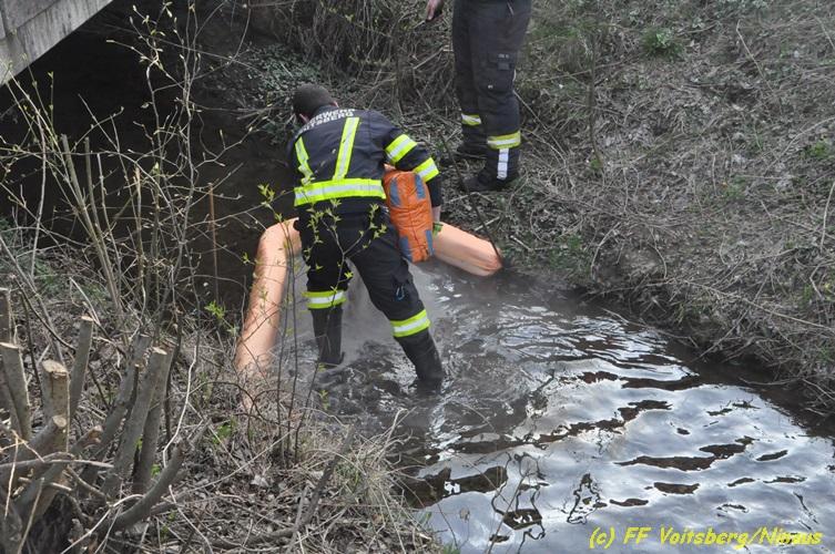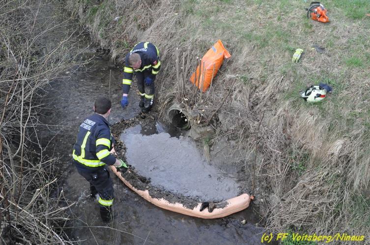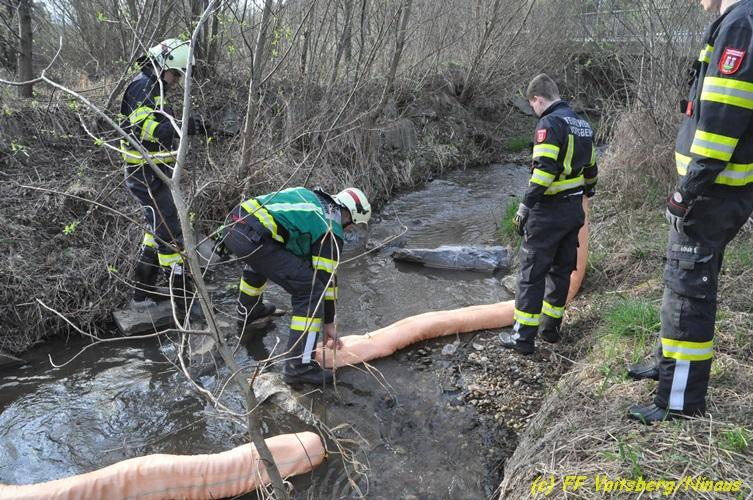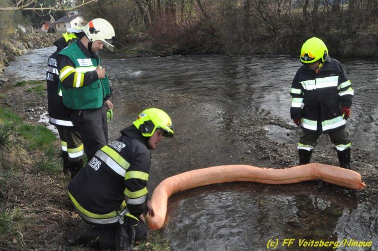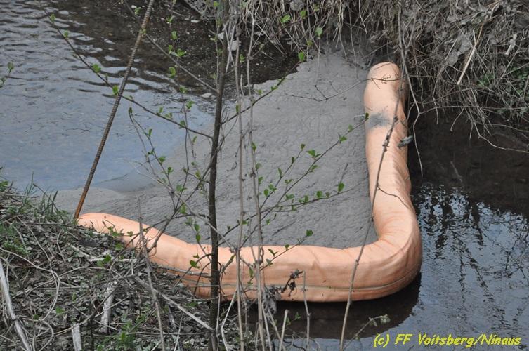 VOITSBERG, am 11.04.2018 Passanten bemerkten am Mittwoch, dem 11. April 2018 am Nachmittag einen Ölfilm am Lobmingbach im Ortsteil Krems der Stadtgemeinde Voitsberg im Bereich des ehemaligen Gasthauses Töscher und verständigten die Einsatzkräfte. Nach deren ersten Erkundung wurden sofort von den Feuerwehren Krems und Voitsberg insgesamt 12 Ölsperren auf einer Länge von 500 Meter am Lobmingbach errichtet, um eine Verschmutzung der Kainach zu verhindern. Ein Problem war die Suche nach der Ursache des Ereignisses. Es wurden letztendlich ein Zufluss zum Lobmingbach ausfindig gemacht, aus dem das Öl in den Lobmingbach gelangte. Nach weiterer, intensiver Suche durch die Feuerwehren und der Polizei konnte letztendlich ein altes, mit Schmierstoffen verunreinigtes Ölfass gefunden werden, welches als Wasserspeicher am Grundstück aufgestellt war und aus dem das verunreinigte Wasser über einen Kanal in den Bach gelangte. Seitens des ebenfalls verständigten Ölalarmdienstes des Landes Steiermark wurden Proben zwecks einer Laboruntersuchung entnommen.