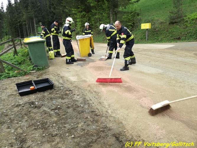 VOITSBERG, am 26.04.2018 Nach einem technischen Gebrechen an einem Traktor gelangten in den Vormittagsstunden des Mittwoch, 26. April 2018 Schmiermittel auf eine Gemeindestrasse und verschmutzten diese. Binden der ca. 100 Meter langen Ölspur mit Bindemittel und danach fachgerechte Entsorgung durch die FF Voitsberg. Eingesetzt waren unter OBI Bernd Unger 9 KameradInnen der FF Voitsberg. Fotos: Gallitsch/FF Voitsberg Text: Walter Ninaus/FF Voitsberg