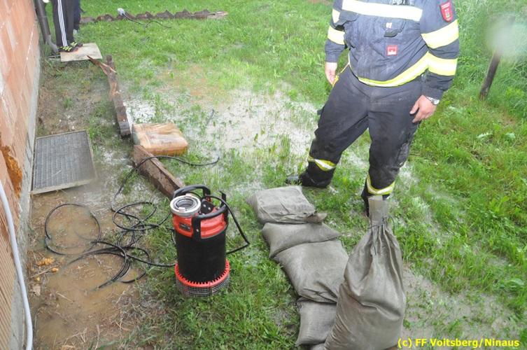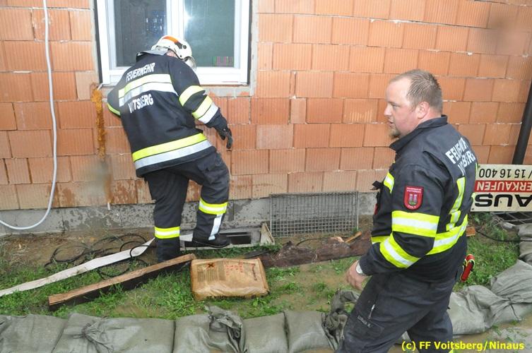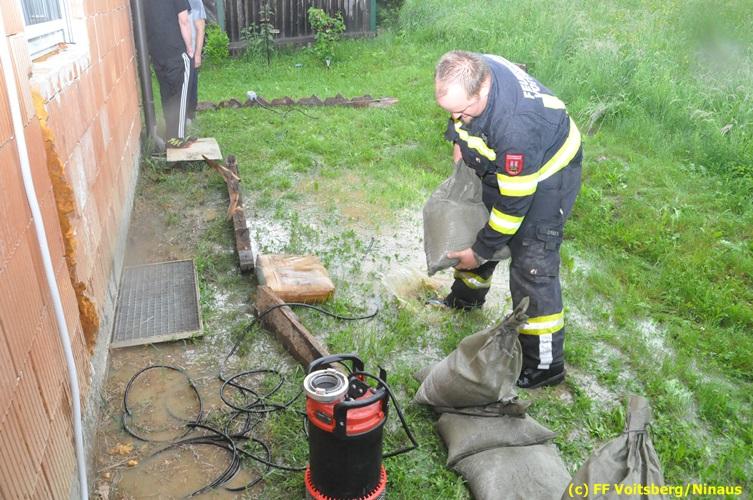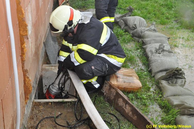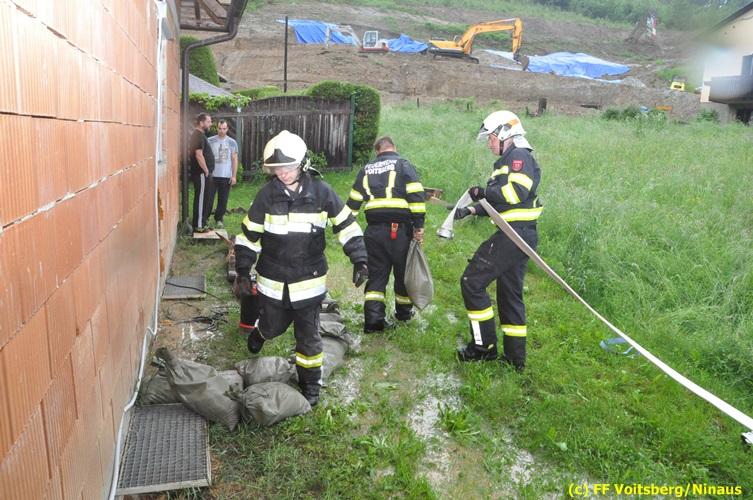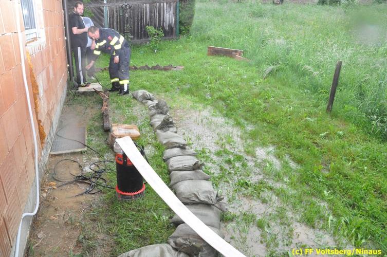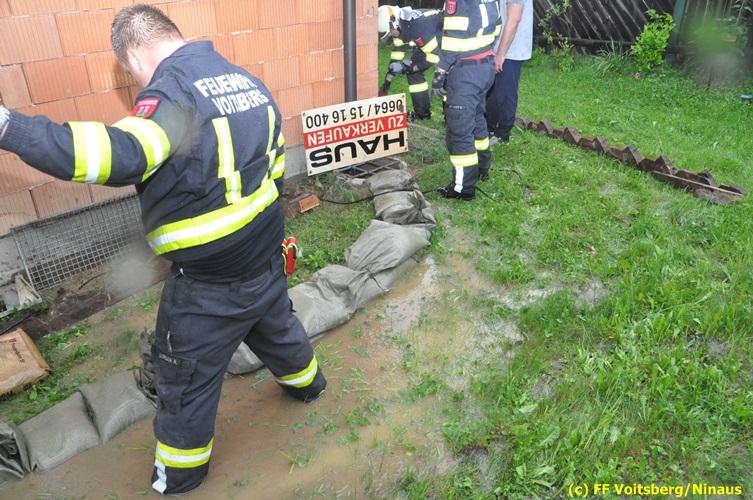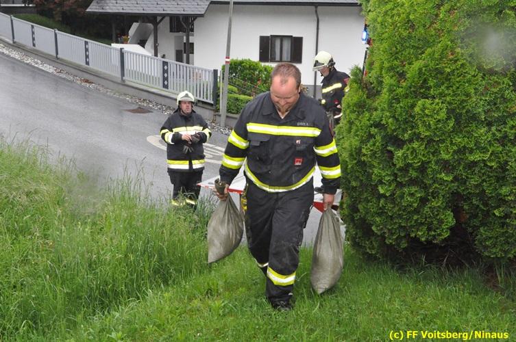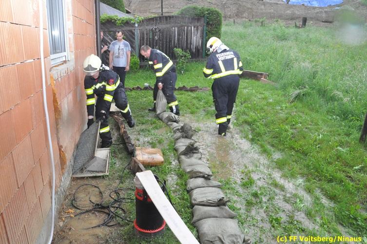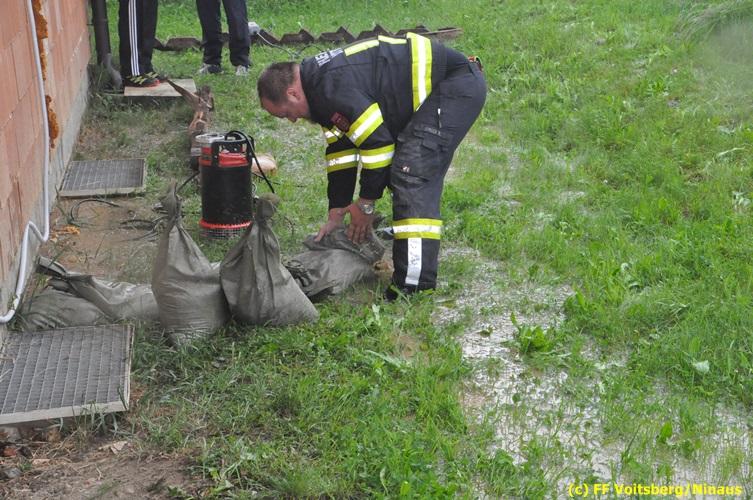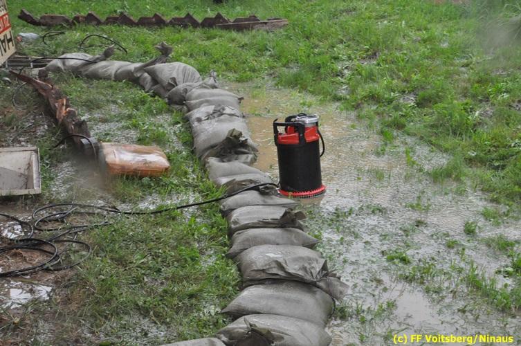 VOITSBERG, am 15.05.2018 Objekt von Wasser, welches über Wiese in Haus eintritt, mit Bau eines Sandsackdammes schützen und bereits eingetretenes Wasser mit Nasssauger absaugen.