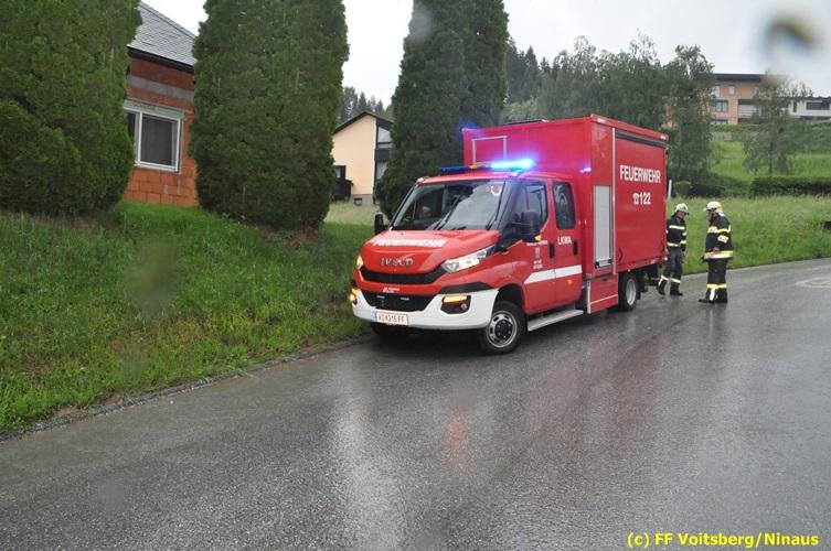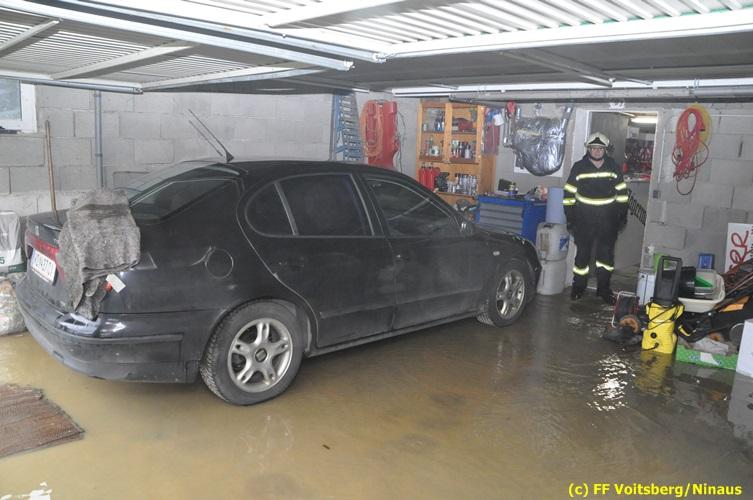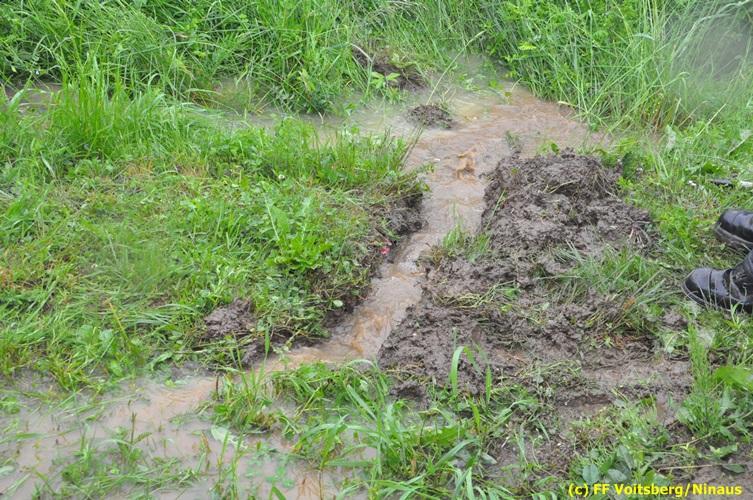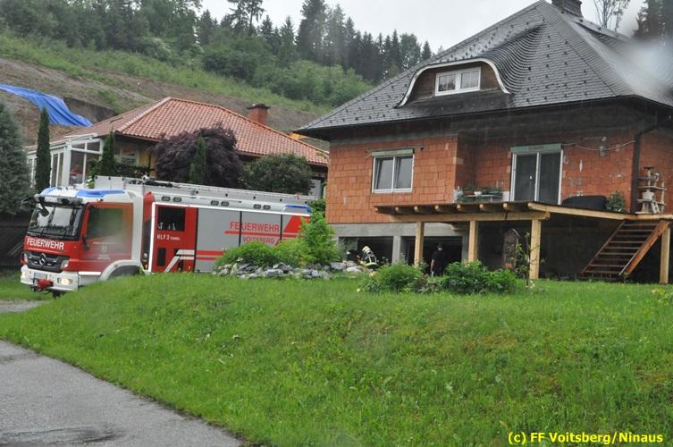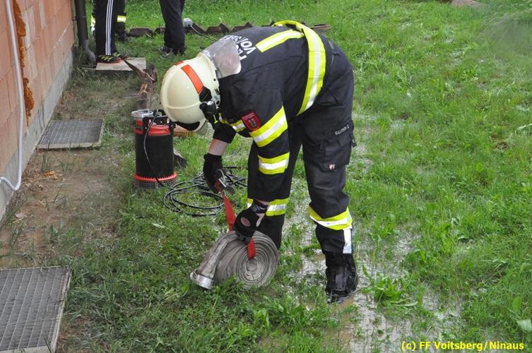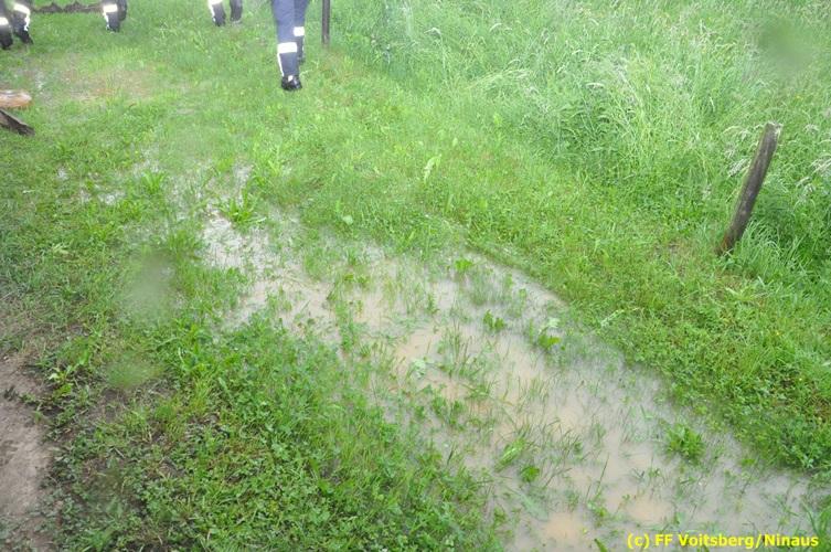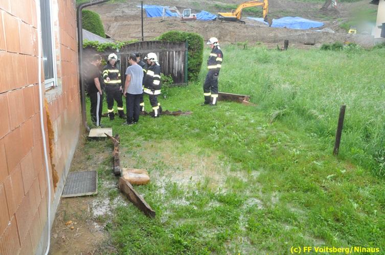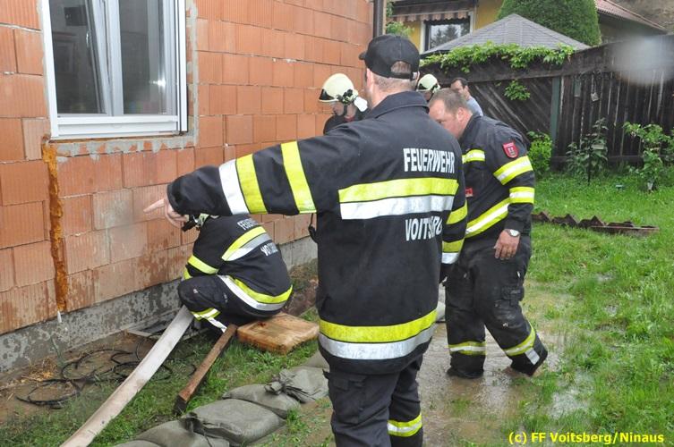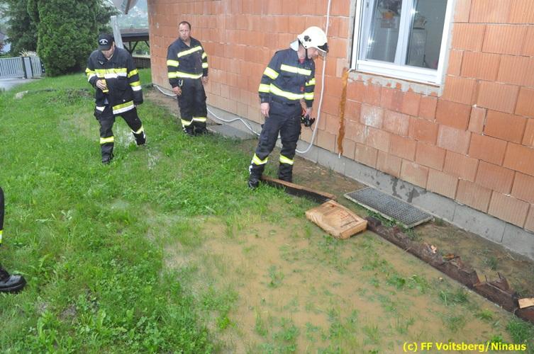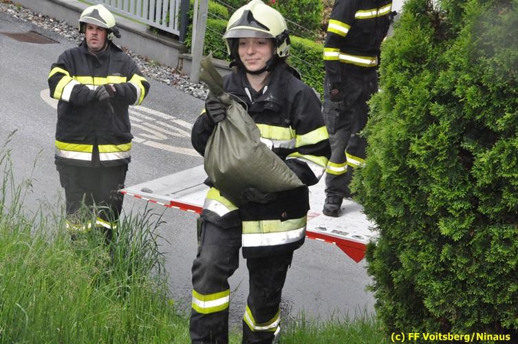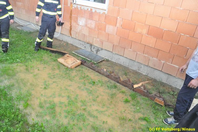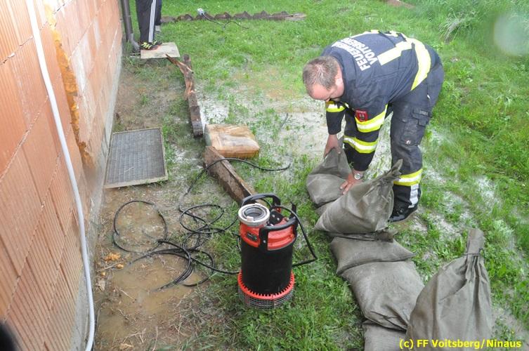VOITSBERG, am 15.05.2018 Objekt von Wasser, welches über Wiese in Haus eintritt, mit Bau eines Sandsackdammes schützen und bereits eingetretenes Wasser mit Nasssauger absaugen.