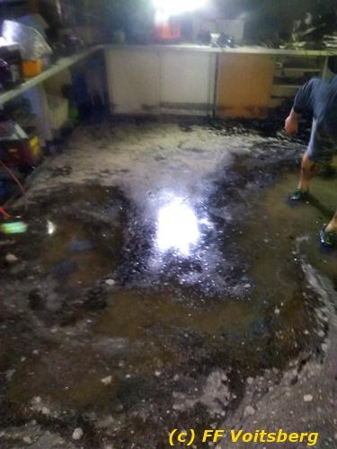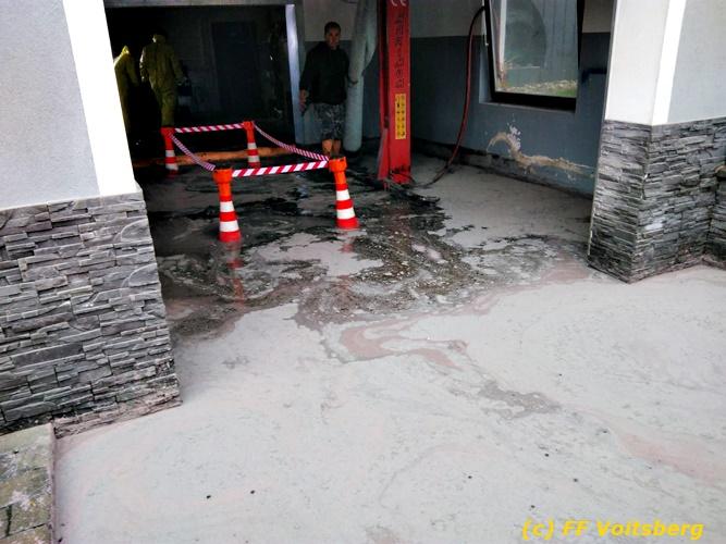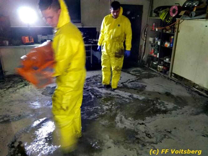 VOITSBERG, am 13.06.2018 Über Anforderung der FF Krottendorf wurde die FF Voitsberg als Gefahrenstützpunktwehr des Bereiches Voitsberg zwecks Hilfestellung bei einem Objekt in Krottendorf angefordert. Nach Erkundung der Lage wurde festgestellt, dass sich ein Ölfilm im Bereich der überfluteten Garage und des Kellers gebildet hat. Es wurde sofort eine Ölsperre errichtet und gleichzeitig Ölbindemittel aufgebracht. Hernach wurde das gebundene Bindemittel abgeschöpft und fachgerecht entsorgt. Der Chemiealarmdienst des Landes Steiermark wurde informiert. Text: Walter Ninaus/FF Voitsberg Fotos: FF Voitsberg