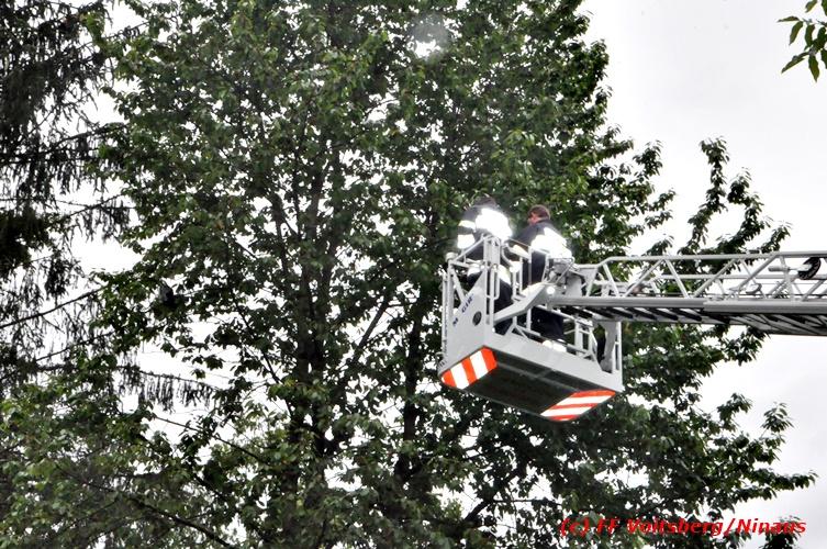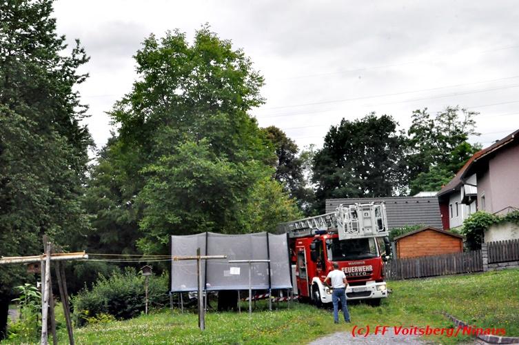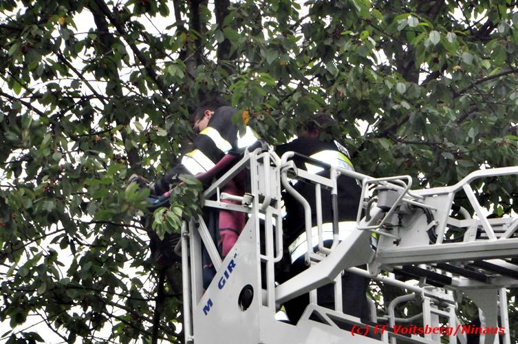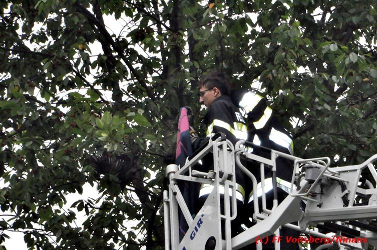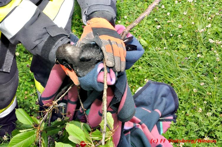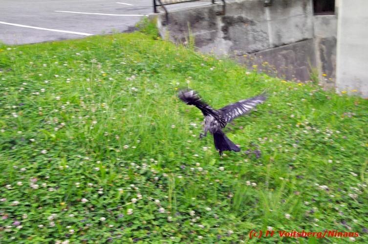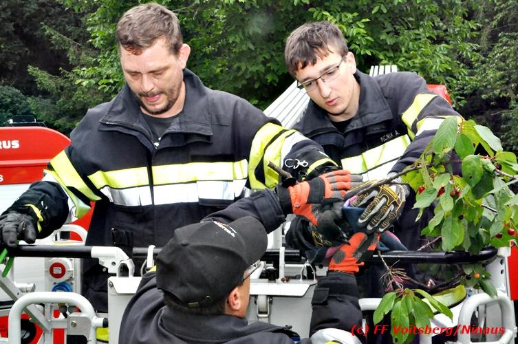 VOITSBERG, am 28.06.2018 Anrainer bemerkten vor ca. 1 Woche einen Raben, welcher sich auf einem hohen Kirschbaum am Franz-Edler-Weg in Voitsberg aufhielt und nicht von der Stelle wich, wobei sie sich zuerst nichts dabei dachten. Nach einigen Tagen wurden sie durch das ständige Zu- und Abfliegen anderer Raben aufmerksam und konnten feststellen, dass diese den am Baum befindlichen Vogel mit Futter versorgten. Nach genaueren Recherchen konnten sie am Donnerstag, 28. Juni sehen, dass sich das Tier mit einer Fischerschnur an einem Ast verfangen hatte. Daraufhin verständigten die aufmerksamen Anrainer ABI Alfred Jauk der FF Voitsberg, welcher die Drehleiter Köflach zwecks Rettung des Tieres anforderte. Drei Kameraden der FF Köflach retteten schlussendlich das verängstigte, aber gestärkte Tier mit dem Ast auf den Boden. Dort wurde die Fischerschnur vom Ast und dem Raben entfernt und der Vogel konnte wieder unversehrt in die Freiheit entlassen werden. Dank gebührt neben der FF Köflach auch den aufmerksamen Nachbarn für ihre hilfreichen Beobachtungen und Handlungen auszusprechen. Text und Fotos: Walter Ninaus/FF Voitsberg