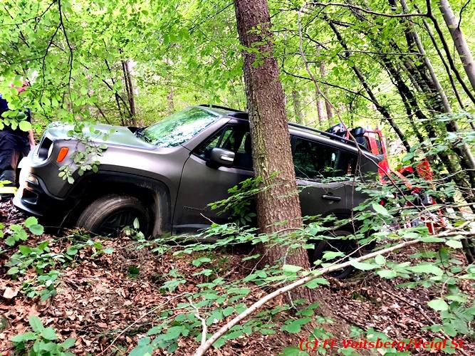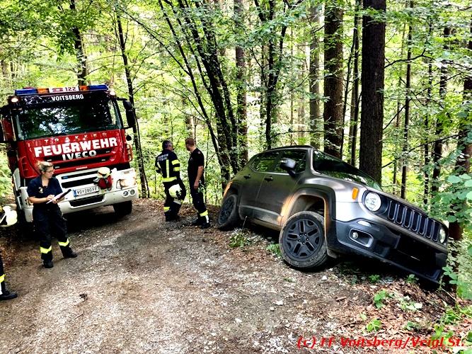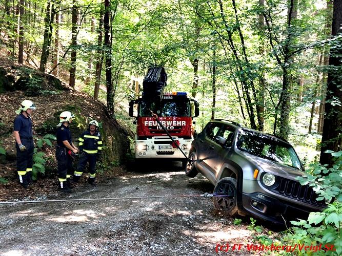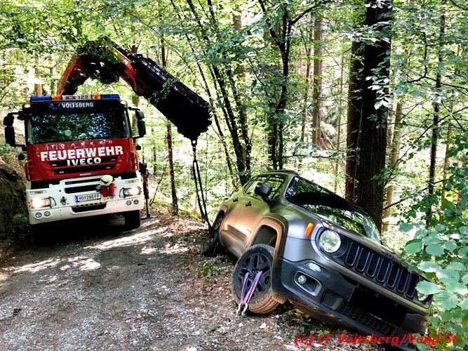VOITSBERG, am 30.06.2018 Auf einer Gemeindestrasse in Bärnbach kam am 30.6.2018 in den Vormittagsstunden ein PKW von der Strasse ab, rutschte seitlich gegen einen Baum und blieb dort hängen. Die alarmierte FF Bärnbach sicherte das Fahrzeug und forderte zwecks Bergung das WLF-Kran der FF Voitsberg über die LLZ an. Mit vereinten Kräften, durch Sicherung des Fahrzeuges mit der Seilwinde des RLFA Bärnbach und dem Kran des WLF Voitsberg, wurde das Fahrzeug geborgen und der unverletzte Lenker konnte die Fahrt auf eigener Achse fortsetzen. Eingesetzt unter der Einsatzleitung von HBM Wolfgang Schönner (FF Bärnbach) waren 11 KameradInnen der Feuerwehren Bärnbach und Voitsberg. Text: Walter Ninaus/FF Voitsberg Fotos: Stefan Veigl/FF Voitsberg