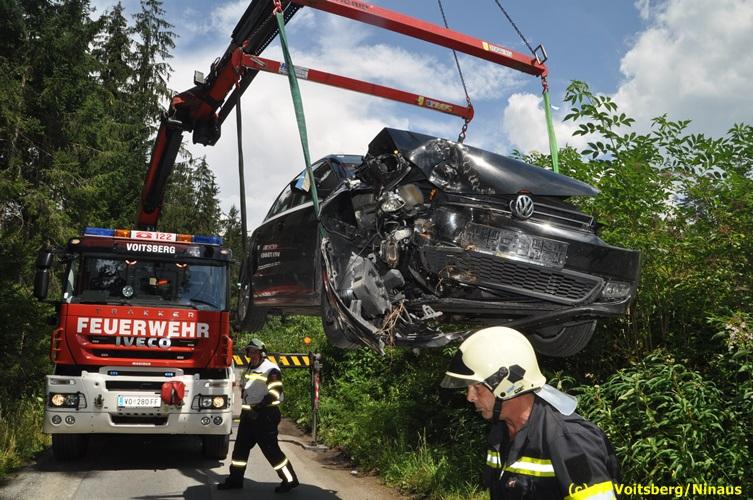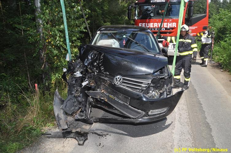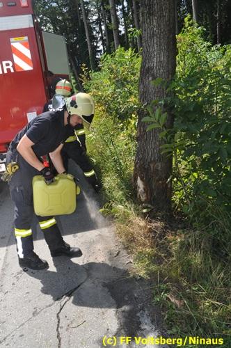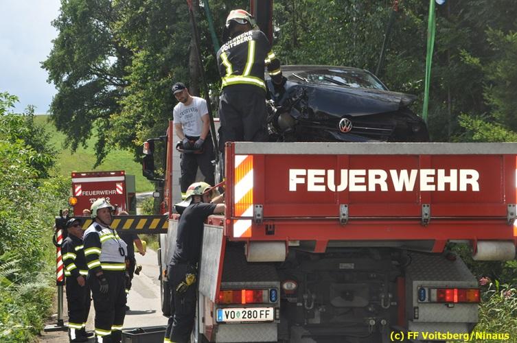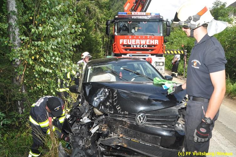 VOITSBERG, am 27.07.2018 Nachdem eine PKW-Lenkerin am Freitag, 27. Juli 2018 kurz vor 13 Uhr den Zusammenstoß mit zwei einspurigen Fahrzeugen verhindern wollte, verriss sie ihr Fahrzeug und stieß mit ihrem PKW auf der Kowaldstrasse in Voitsberg gegen ein Baum. Die FF Voitsberg wurde zwecks Beseitigung der Ölspur und Bergung des Fahrzeuges auf einen gesicherten Platz alarmiert. Herumliegende Wrackteile wurden von der Fahrbahn entfernt und entsorgt. Das Bindemittel wurde ebenfalls fachgerecht entsorgt. Die Lenkerin wurde mit Verletzungen unbestimmten Grades vom Roten Kreuz in das LKH Voitsberg eingeliefert. Eingesetzt waren seitens der FF Voitsberg unter dem Einsatzleiter BM Rene Sorger 7 Einsatzkräfte, 2 Beamte der Polizei Voitsberg und 2 Sanitäter des Roten Kreuzes Voitsberg. Text und Fotos: Walter Ninaus/FF Voitsberg