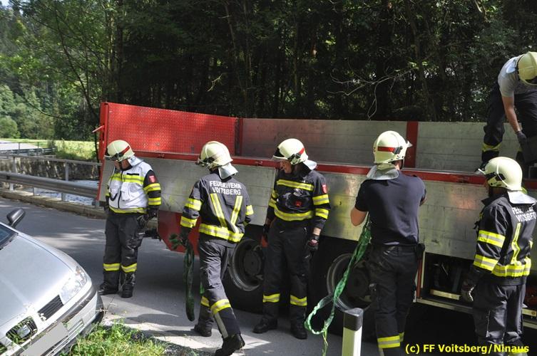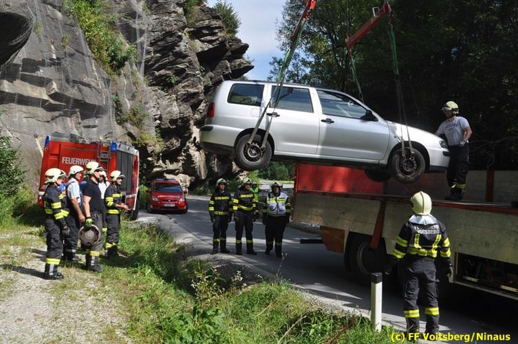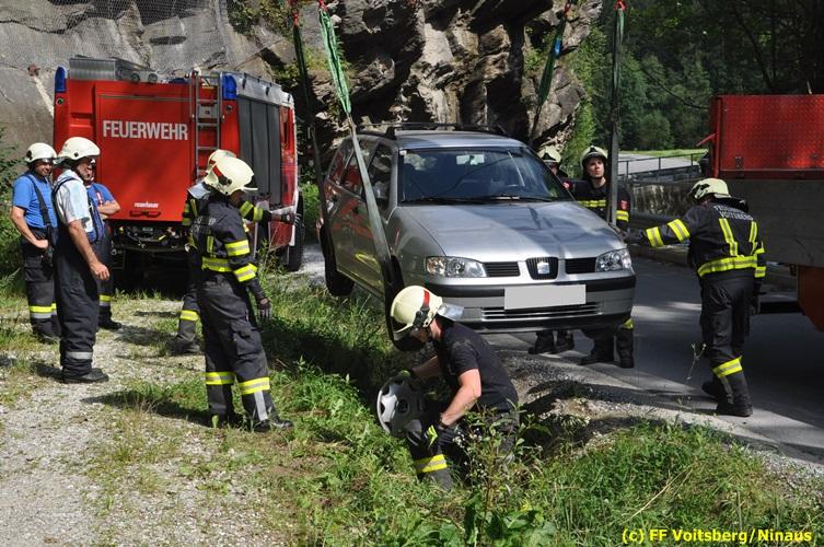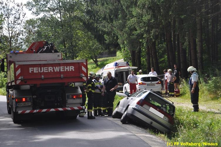 VOITSBERG, am 27.07.2018 Aus ungeklärter Ursache geriet am Freitag, 27. Juli 2018 um ca. 15 Uhr eine PKW-Lenkerin mit ihrem Fahrzeug in der Gößnitzstrasse von der Straße ab und landete im Straßengraben. Ein nachfahrender PKW-Lenker befreite die betagte Frau aus dem Fahrzeug und verständigte das Rote Kreuz und die Feuerwehr über Notruf. Die zuständige Feuerwehr St. Martin a. W. sicherte die Unfallstelle ab und versorgte die unbestimmten Grades verletzte Person bis zum Eintreffen des Roten Kreuzes, welche die Verletzte ins LKH Voitsberg einlieferte. Zwecks Bergung des Fahrzeuges wurde das WLF-Kran der FF Voitsberg angefordert. Eingesetzt waren unter der Einsatzleitung von HBI Konrad Klug (FF St. Martin a. W.) insgesamt 18 Einsatzkräfte der Feuerwehren St. Martin a. W. und Voitsberg, die Polizei Voitsberg mit 2 Beamten und das Rote Kreuz mit 2 Sanitätern. Während der Rettungs- und Bergungsarbeiten wurde die Gößnitzstrasse gesperrt. Text und Fotos: Walter Ninaus/FF Voitsberg