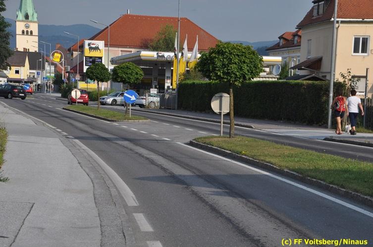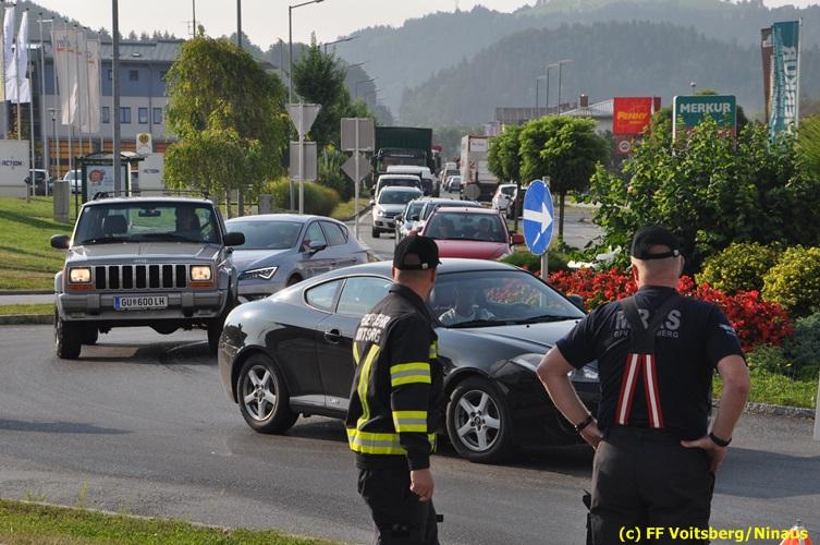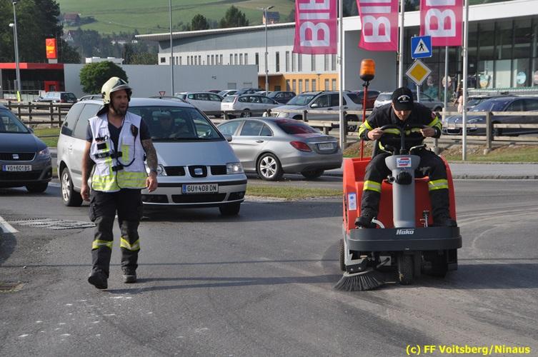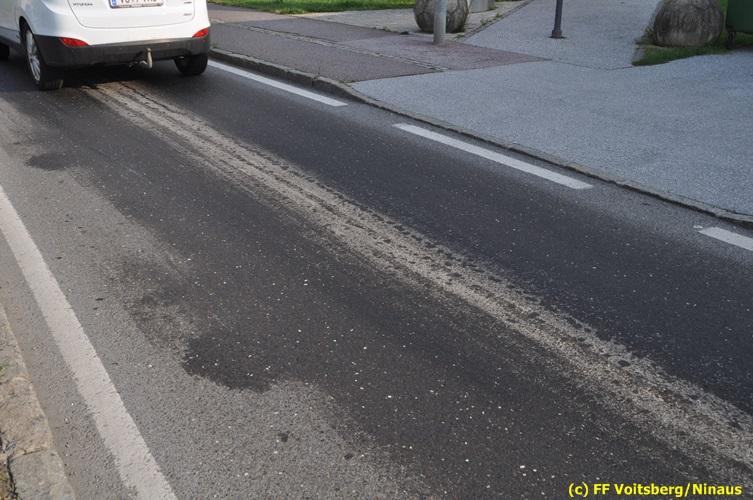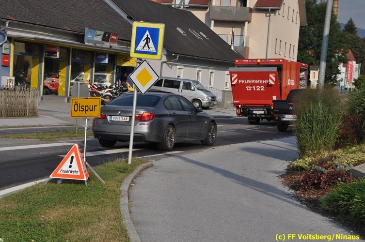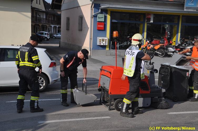 VOITSBERG, am 03.08.2018 Nach einem technischen Gebrechen bei einem LKW verlor dieser Hydrauliköl und verunreinigte die Fahrbahn im Bereich des Kreisverkehrs in der Grazer Vorstadt in Voitsberg auf einer Gesamtlänge von ca. 600 m. Die alarmierte FF Voitsberg band das ausgelaufene Öl, saugte das verunreinigte Bindemittel mit einer feuerwehreigenen Kehrmaschine auf und entsorgte dies fachgerecht. Während des Einsatzes wurde der Verkehr kurz angehalten, was im Frühverkehr auf der Umleitungsstrecke der gesperrten Umfahrung Voitsberg zu ausgedehnten Staus in Richtung Köflach führte. Eingesetzt waren 9 Einsatzkräfte der FF Voitsberg, 2 Kräfte des Bauhofes Voitsberg und 2 Kräfte der Straßenmeisterei Voitsberg. Text und Fotos: Walter Ninaus/FF Voitsberg
