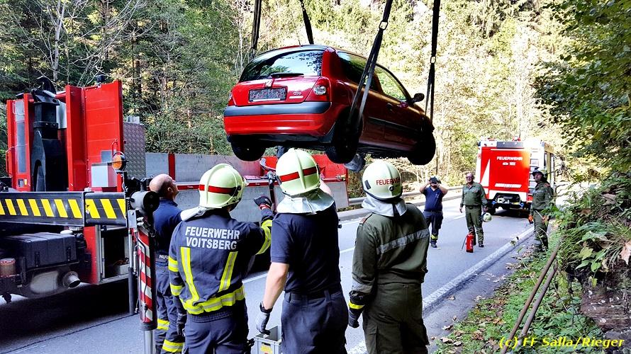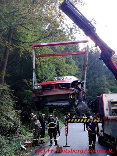 VOITSBERG, am 09.09.2018 Zu einem folgenschweren Zusammenstoß zwischen einem Traktoranhänger und einem PKW kam es auf der Gaberl-Bundesstrasse (B 77) im Gemeindegebiet Maria Lankowitz (Ortsteil Salla) am Sonntag, 9. September 2018 um ca. 15 Uhr. Ein in Richtung Köflach fahrender PKW-Lenker erblickte in einer Kurve einen Traktor mit überbreitem Anhänger, erschrak, verriss sein Fahrzeug an den rechten Fahrbahnrand, touchierte einen Randstein und wurde gegen den Anhänger geschleudert. Durch den Aufprall wurde der PKW derart beschädigt, dass Betriebsmittel ausflossen und zwecks Bergung das WLF-Kran der FF Voitsberg seitens der einsatzleitenden Feuerwehr Salla angefordert werden musste. Das Fahrzeug wurde geborgen und zu einem Abstellplatz gebracht. Ausgeflossene Betriebsmittel wurden gebunden sowie herumliegende Wrackteile von der Strasse entfernt. Auf der stark frequentierten B 77 kam es dadurch zu ausgedehnten Staus in beiden Fahrtrichtungen. Die Unfallerhebungen wurden von der Polizei durchgeführt. Verletzt wurde glücklicherweise niemand. Eingesetzt waren unter der Einsatzleitung von HBI Michael Schrotter (FF Salla) insgesamt 13 Einsatzkräfte der Feuerwehren Salla und Voitsberg sowie eine Polizeistreife mit 2 Beamten. Text: Walter Ninaus/FF Voitsberg Fotos: FF Salla/Rieger, FF Voitsberg/Sorger R.