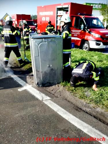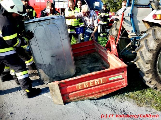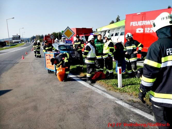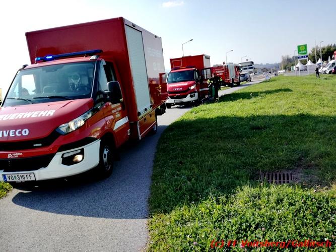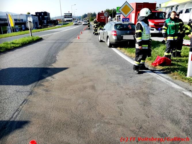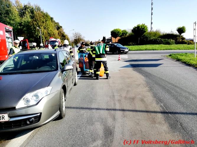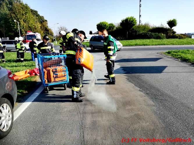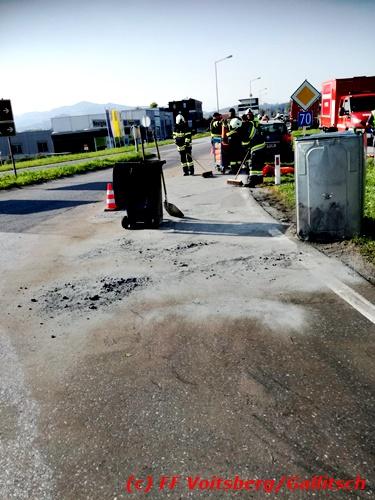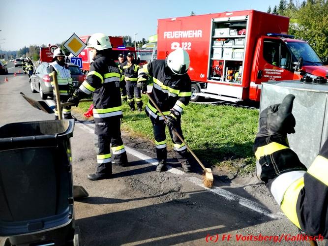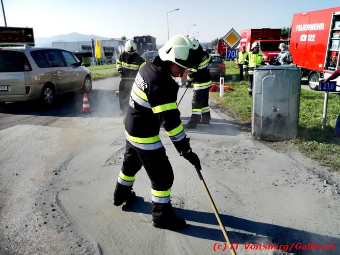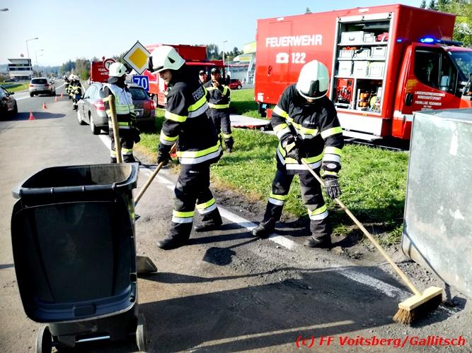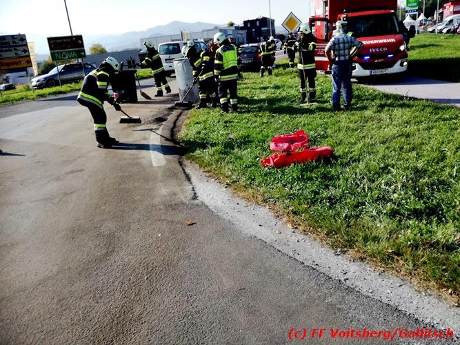 VOITSBERG, am 13.10.2018 Am Samstag, 13. Oktober 2018 in den frühen Nachmittagsstunden stürzte im Kreisverkehr der B 70 in Söding-St.Johann in Richtung Voitsberg ein Behälter mit ca. 600 l Heizöl samt einem PKW-Anhänger um, platzte auf und verteilte sich auf der Fahrbahn der B 70. Die erstalarmierte FF Söding führte Erstmaßnahmen durch, sicherte die Einsatzstelle ab und regelte bis zum Eintreffen der Polizei den Verkehr. Die nachalarmierte Schadstoffstützpunktfeuerwehr Voitsberg band mit Ölbindemittel das ausgeflossene Heizöl, sammelte das durchtränkte Bindemittel ein und entsorgte es fachgerecht. Während des Einsatzes kam es zu einem kurzen Stau auf der B 70. Eingesetzt waren insgesamt 17 Kräfte der Feuerwehren Söding und Voitsberg sowie die Polizei. Verletzt wurde niemand. Fotos: Gallitsch/FF Voitsberg Text: Ninaus/FF Voitsberg