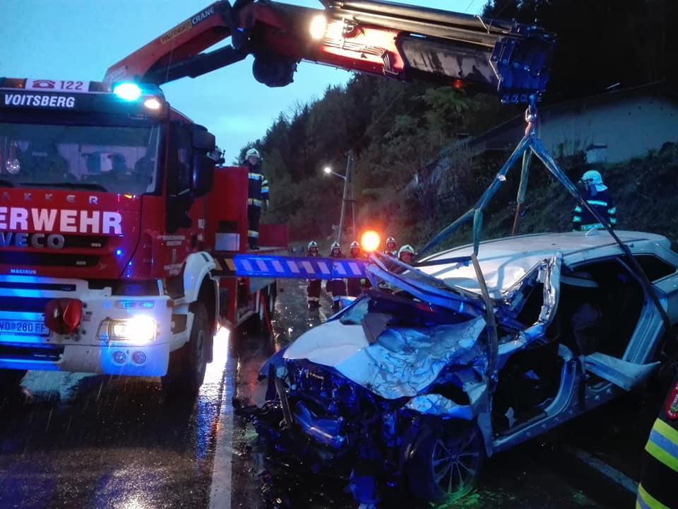 VOITSBERG, am 24.10.2018 Nach einem schweren Verkehrsunfall musste eine schwer beschädigtes Fahrzeug mittels WLF-Kran von der Unfallstelle entfernt werden.