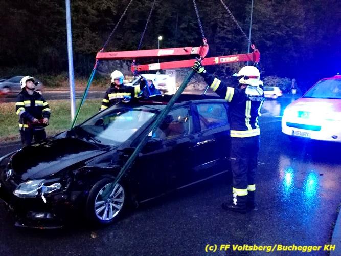 VOITSBERG, am 27.10.2018 Auf der B 70 in Gaisfeld kam es am Samstag, 27. Oktober 2018 am späten Nachmittag zu einem Zusammenstoß zweier PKW. Die einsatzleitende Feuerwehr Gaisfeld forderte über die LLZ das WLF-Kran der FF Voitsberg zwecks Bergung und späterer Sicherstellung eines Fahrzeuges an. Text: Walter Ninaus, FF Voitsberg Fotos: Karlheinz Buchegger, FF Voitsberg